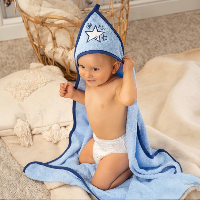 Der praktische und zarte Bezug mit Kapuze ist ab dem ersten Bad unersetzlich. Hergestellt aus  hochwertiger, weicher 100 %  Frottee-Baumwolle. Es  nimmt Wasser perfekt auf  und schützt die empfindliche Haut des Kindes effektiv vor Kälte. Der lockere Schnitt schränkt die Bewegungen des gebadeten Babys nicht ein und die eingenähte  Kapuze schützt den nassen Kopf des Babys  vor dem Auskühlen.