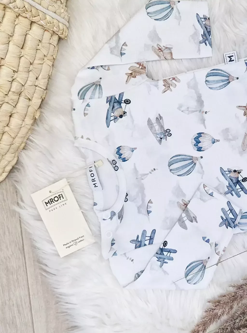 Baby-Body aus zertifizierter Bio-Baumwolle, sicher für Haut, die zu Reizungen und Allergien neigt. Es ist perfekt, wenn Sie die Babypflege einfacher machen möchten. Wählen Sie einen Baby-Body mit langen Ärmeln und nickelfreien Druckknöpfen, der jungen Eltern das Pflegen und Ausziehen des Babys erleichtert, wenn es die Windel verschmutzt. Bei der Kleidung aus der Mrofi Vintage Planes-Kollektion handelt es sich um Kleidung, die vollständig in Polen genäht wird.