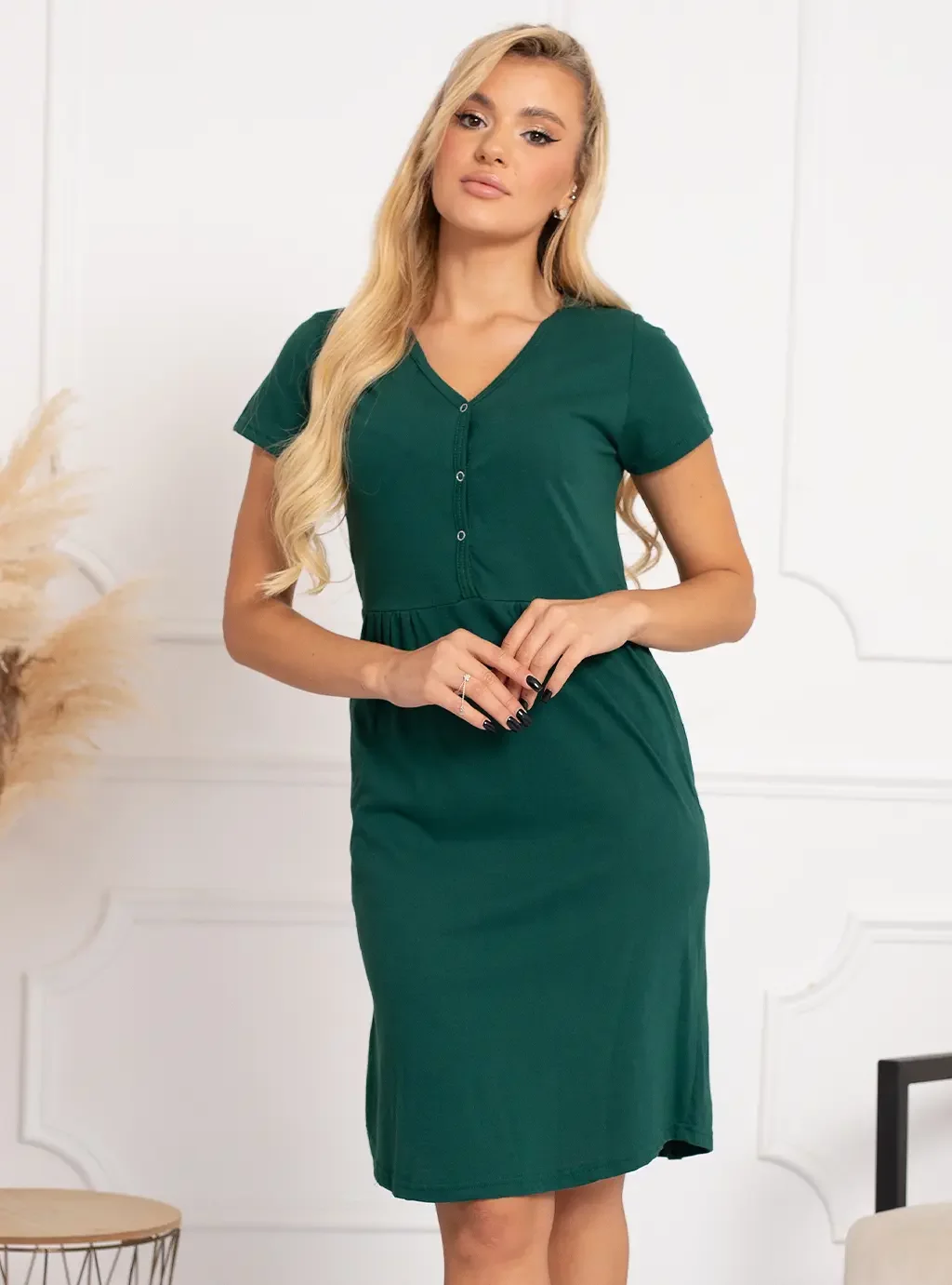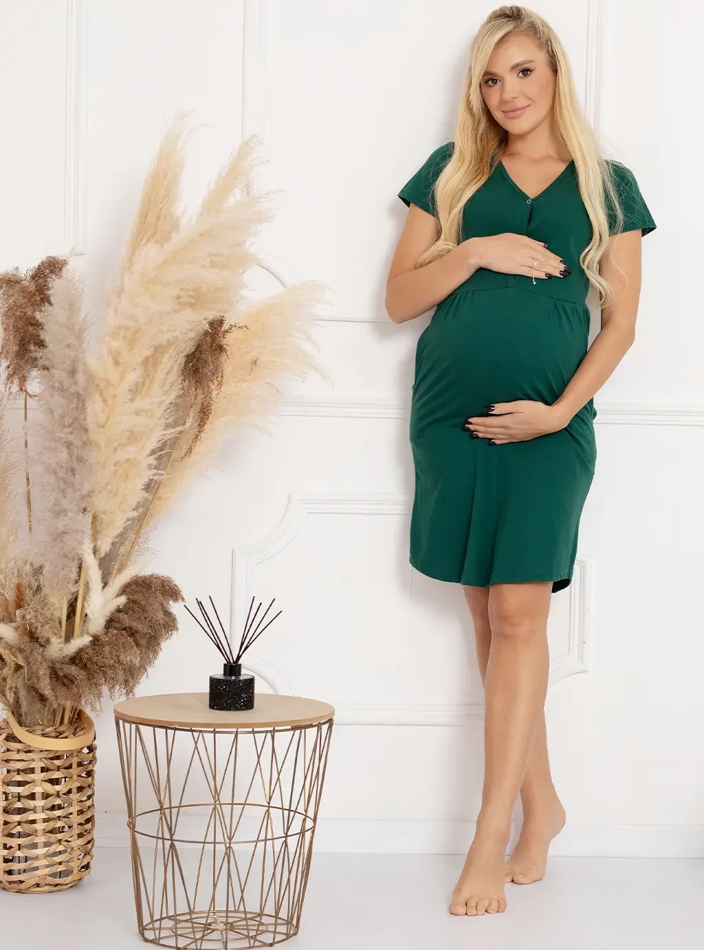 Ismena in flaschengrüner Farbe, ein Produkt unserer Marke Formommy, das keiner zukünftigen Mutter gleichgültig sein sollte . Ein Stillshirt mit kurzen, geraden Ärmeln, das in der Mitte mit nickelfreien Druckknöpfen geschlossen wird, erleichtert das nächtliche Füttern, ohne die Bewegungsfreiheit der werdenden Mutter einzuschränken. Während des Stillens nach der Geburt ist Ihr Komfort sehr wichtig, daher lohnt es sich, Nachthemden zu kaufen, die es Ihnen ermöglichen, Ihr Neugeborenes nachts problemlos zu füttern und den Komfort der werdenden Mutter während und nach der Schwangerschaft zu gewährleisten. Wir präsentieren Baumwoll-Umstandsshirts aus der Ismena-Kollektion in modischem Grün, die das Stillen erleichtern und es Ihnen ermöglichen, ein hungriges Baby schnell an die Brust zu legen. Das Ismena-Shirt wird mit bequemen Druckknöpfen in der Mitte der Brust geschlossen. Dieses Modell hat Raffungen unter den Brüsten, um sich dem Schwangerschaftsbauch anzupassen, was eine schöne Lösung ist, wenn sich Ihre Form schnell ändert. Dieser Schnitt ist ein Bestseller und es lohnt sich, in ihn zu investieren. Wählen Sie perfekte Nachthemden und Stillkittel, die Ihnen lange Freude bereiten.