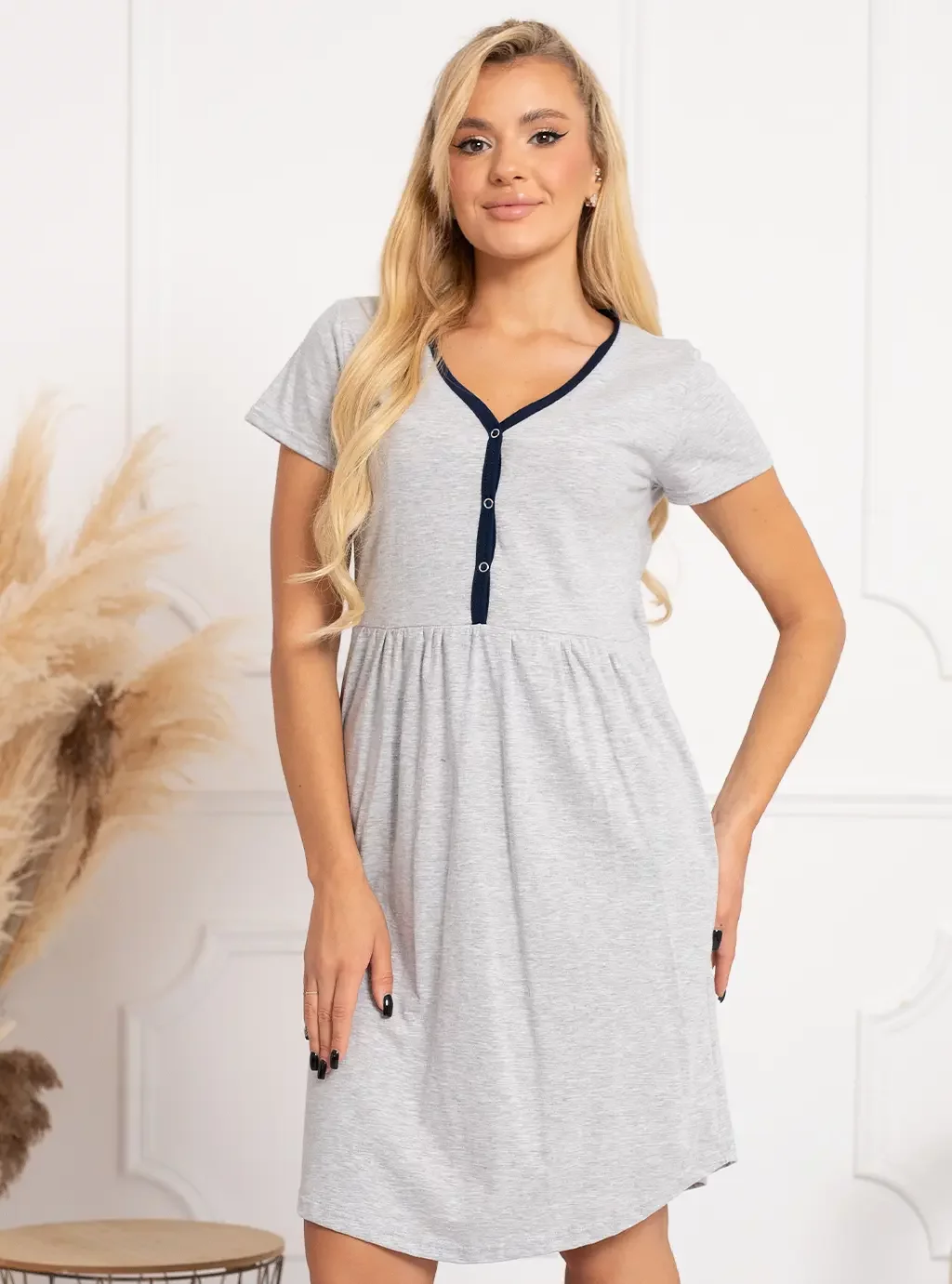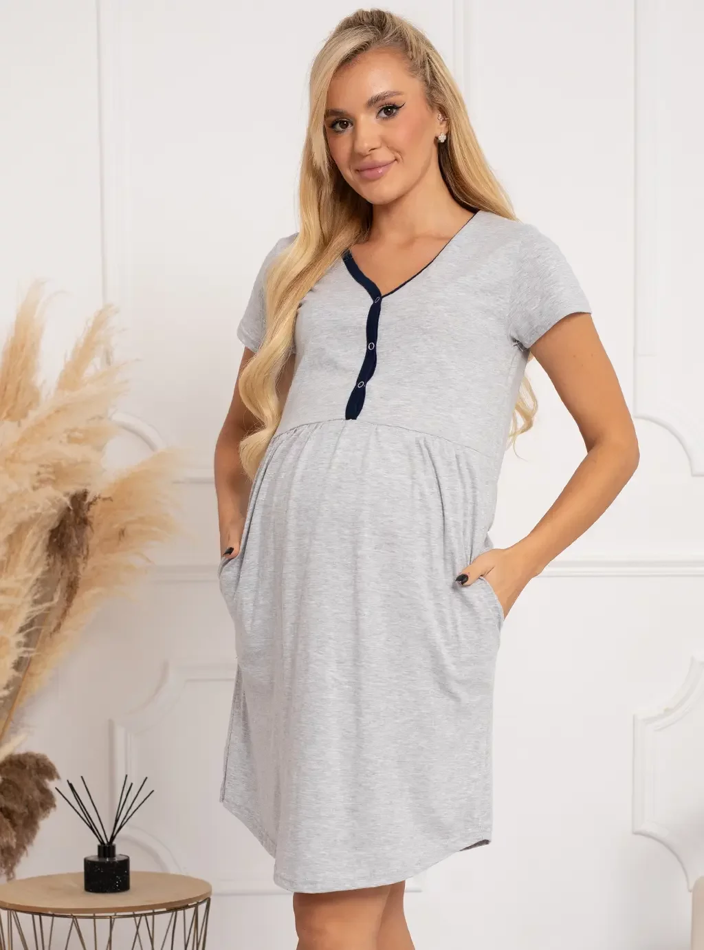 Baumwoll-Nachthemden aus der Hemdenkollektion Ismena der Marke Formommy mit kurzen, klassischen Ärmeln sind eine perfekte Wahl während der Schwangerschaft und Stillzeit. Diese perfekten Nachthemden ermöglichen ein einfaches und unkompliziertes Füttern und schränken die zukünftige Mutter vor allem nicht in ihren Bewegungen ein, wenn sich der Schwangerschaftsbauch so schnell verändert. Ein gut ausgewähltes Hemd erleichtert die Nachtfütterung des Neugeborenen und sorgt für den Komfort der werdenden Mutter während der Schwangerschaft. Das vorgestellte Ismena-Hemdmodell ist ein schön verarbeitetes graues Hemd mit marineblauem Besatz und Raffungen unter den Brüsten, um den Schwangerschaftsbauch unterzubringen. Nickelfreie Druckknöpfe, da die Nachthemden dieser Kollektion auf diese Weise aufgeknöpft werden, lösen beim Füttern keine allergischen Reaktionen bei der Mutter oder dem Baby aus.