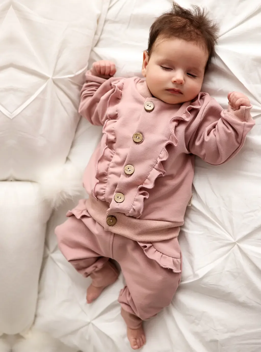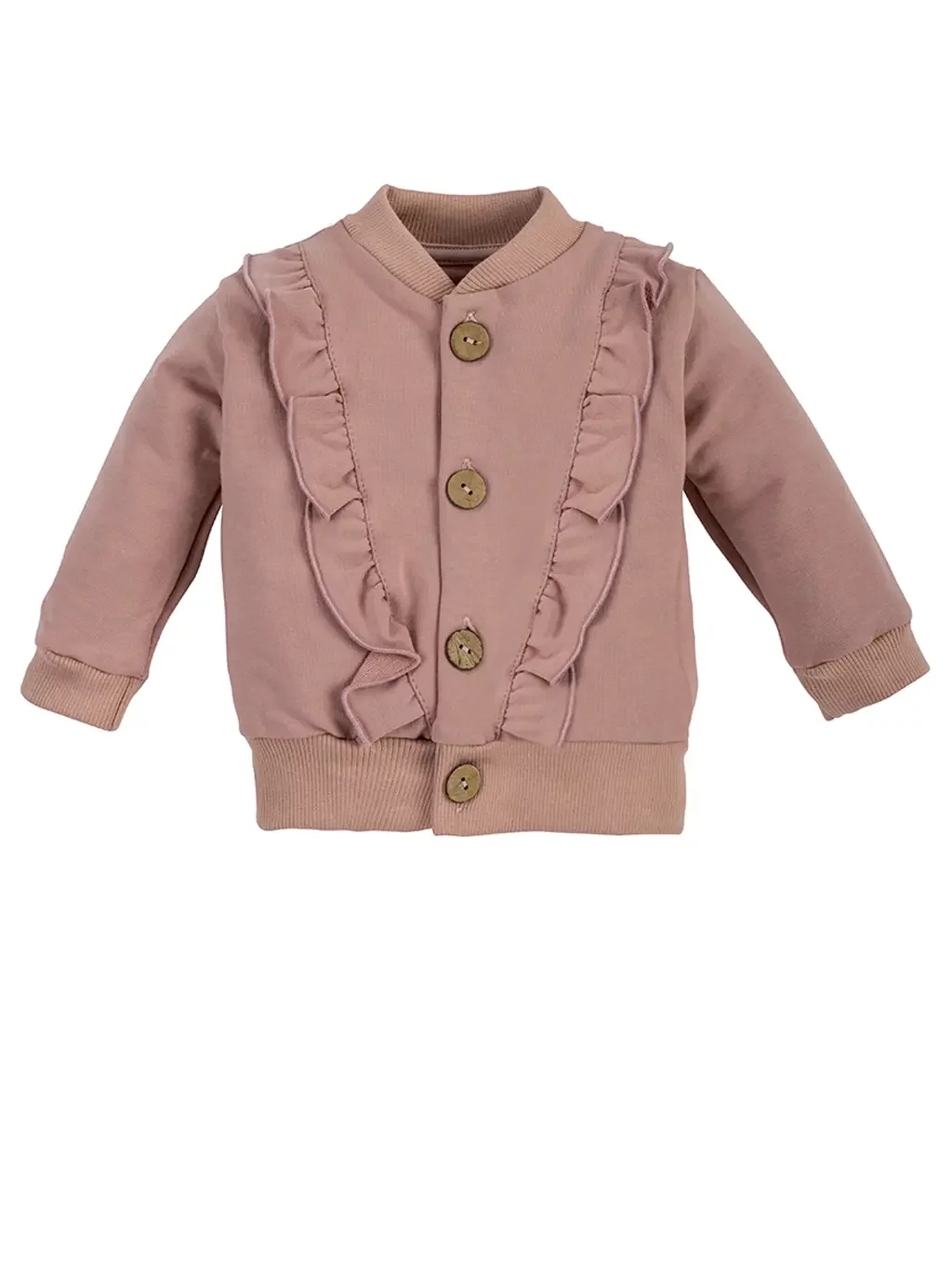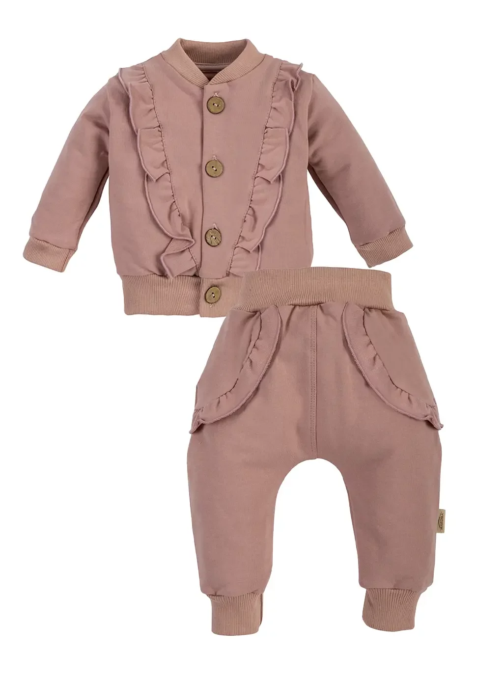 Wygodny sportowy komplet składający się z luźnych spodenek oraz bluzy typu bomberka zapinanej na drewniane guziczki wykończony uroczą falbanką, zapewni dziecku wysoki komfort oraz swobodę ruchu. Bawełniane spodnie nie uciskają brzuszka waszej Pociechy co jest bezpieczne dla maluszka. Modne zestawy ubranek dla niemowląt dziewczynek to nie tylko fajny kolor i kształtu, ale też bezpieczny materiał który nawet po wielokrotnym praniu nie zmienia kształtu i koloru,