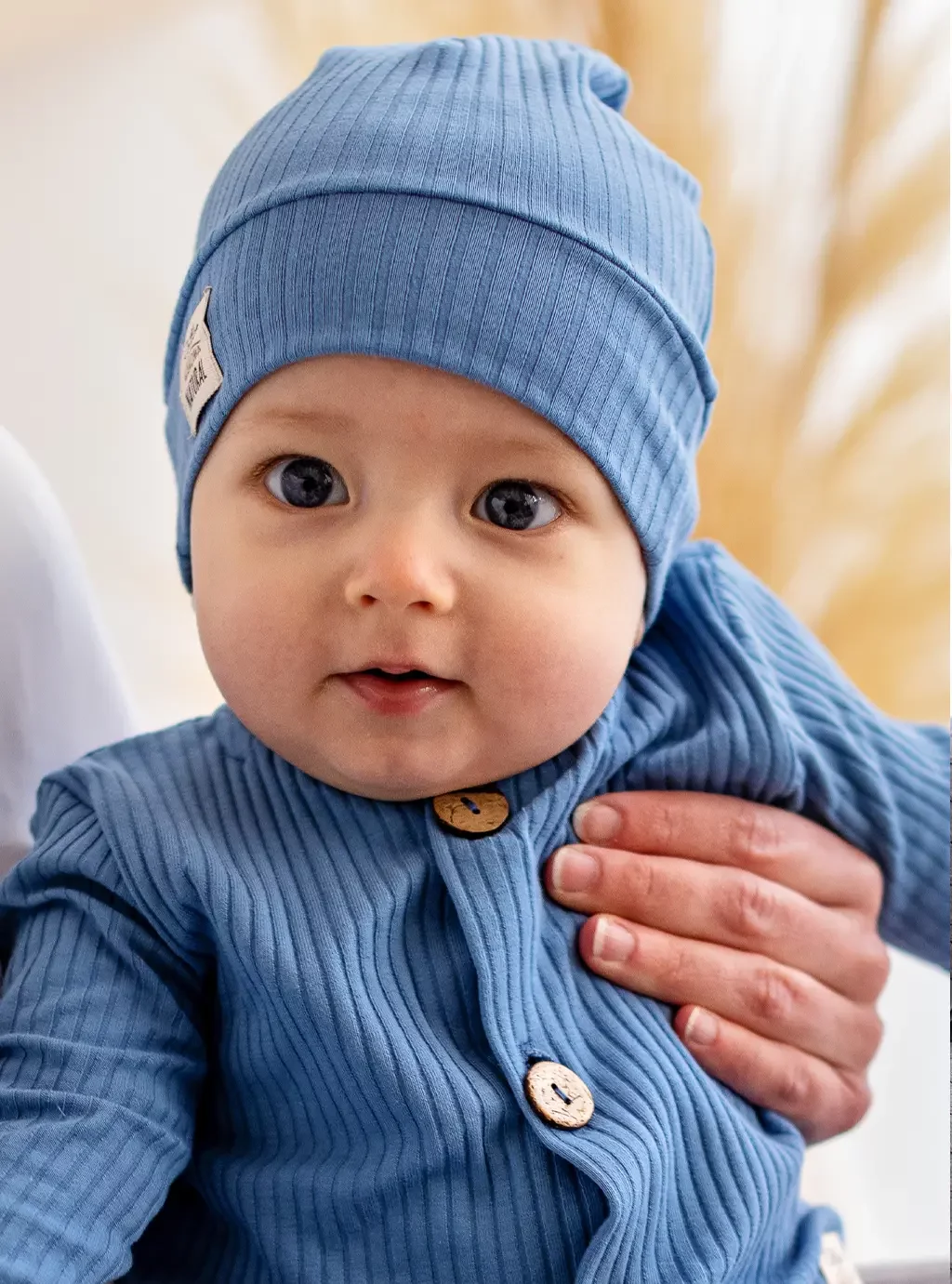 Die bequeme Kindermütze bedeckt die Ohren sicher und besteht aus gerippter Baumwolle, die flexibel und weich im Griff ist. Die dehnbare Mütze aus angenehmer Baumwolle passt sich der Kopfform des Kindes an und lässt die Haut atmen, während sie gleichzeitig die Ohren gut bedeckt und dem Baby höchsten Tragekomfort bietet. Eine zarte Babymütze aus zertifizierter 100 % Baumwolle ist ein wesentlicher Bestandteil der Babyausstattung für ein Neugeborenes. Der blaue Hut drückt nicht auf den Kopf des Babys, sodass Ihr Baby keine Beschwerden verspürt.