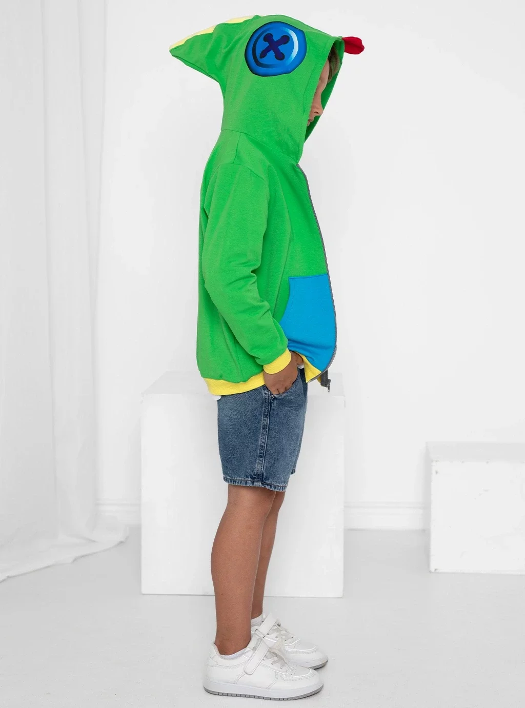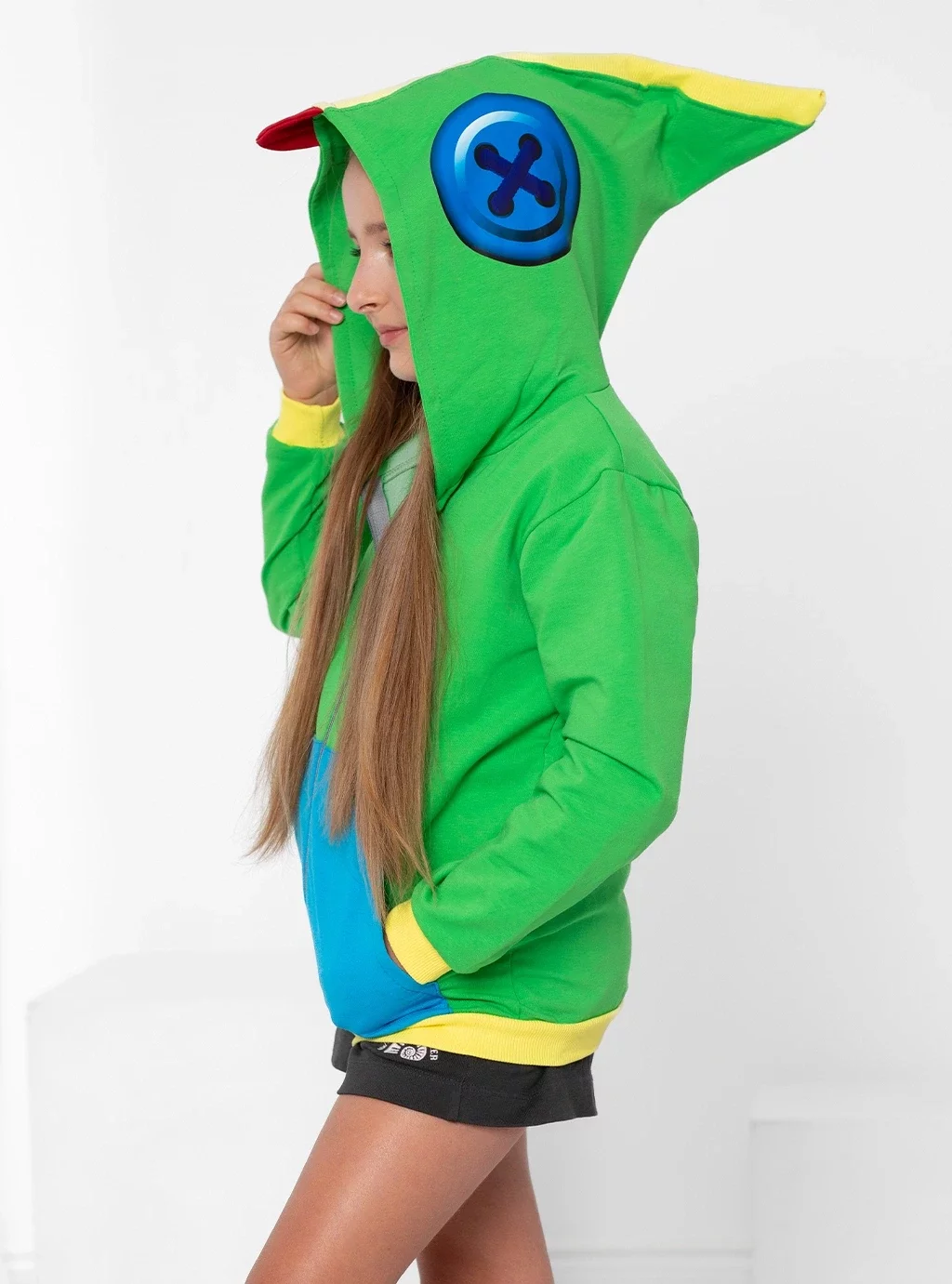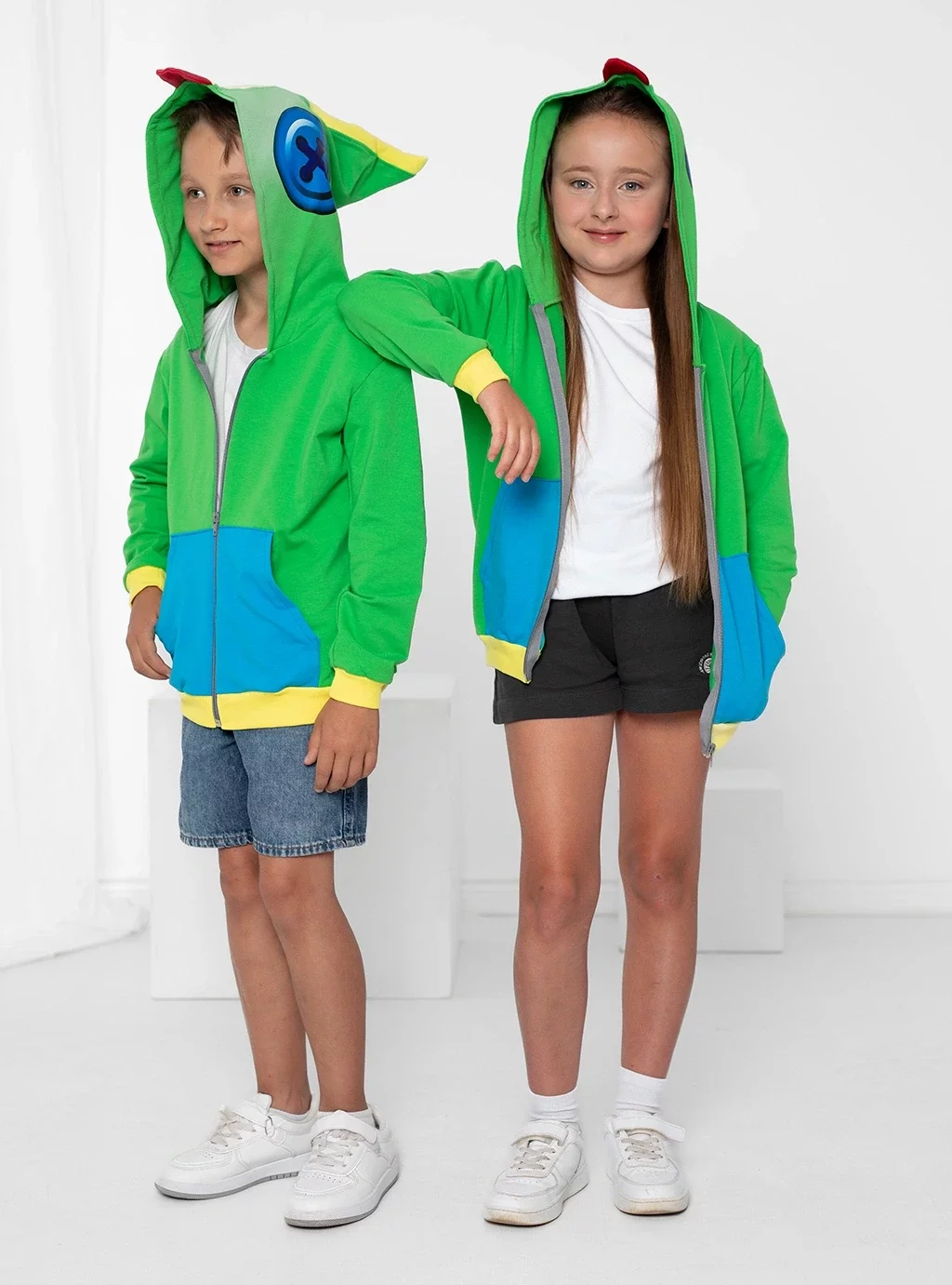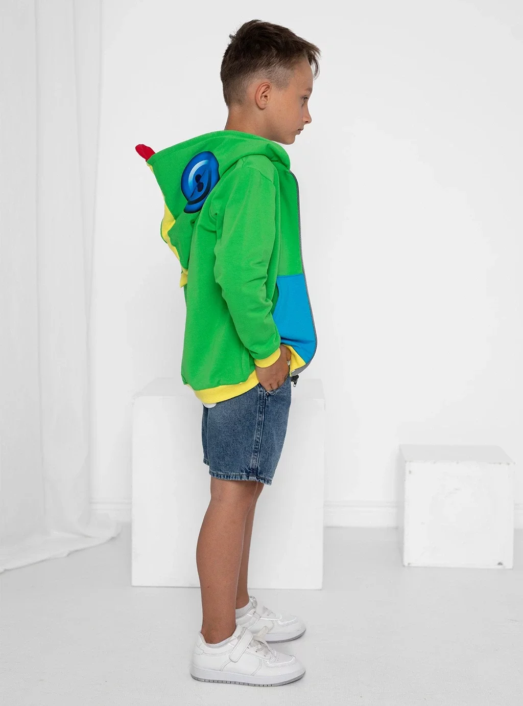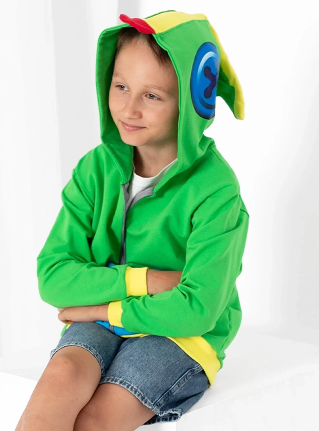 Kinderbekleidung für Mädchen und Jungen, inspiriert von der Figur Leon aus dem Kultspiel Brawl Stars. Ein grünes Sweatshirt mit blauen Taschen und einem charakteristischen Schirm und Knöpfen an der Kapuze, die Chamäleonaugen imitieren, abgerundet mit gelben Manschetten. Ein Sweatshirt-Trainingsanzug ist ein Muss in der Garderobe eines echten Fußballfans . Modetrends für Kinder sind mittlerweile die Lieblingscharaktere von Brawl Stars , die die Herzen von Kindern auf der ganzen Welt erobern. Lassen Sie Ihr Kind noch heute Teil der Fans dieses Spiels werden, indem Sie ein einzigartiges, von Leon inspiriertes Sweatshirt kaufen. Zu den größten Neuheiten in der Kindermode gehören jetzt Lieblingscharaktere aus Spielen und Filmen. Stylen Sie Ihr Kind als Barlej, Broc oder Bull oder dank unseres farbenfrohen Sweatshirts als Leon, den Schläger mit Superangriff!