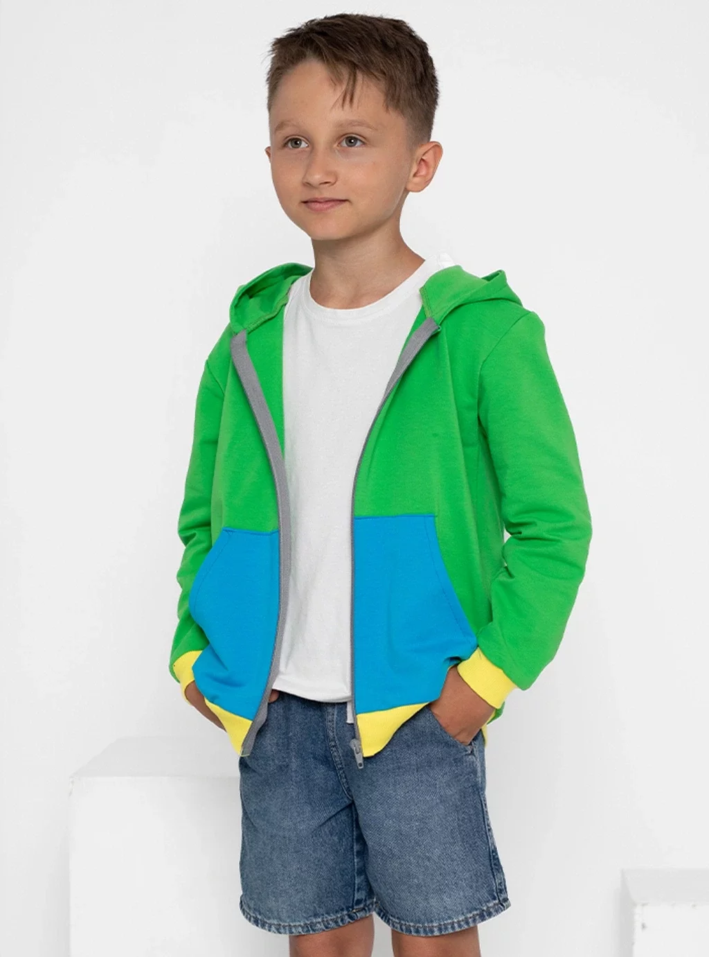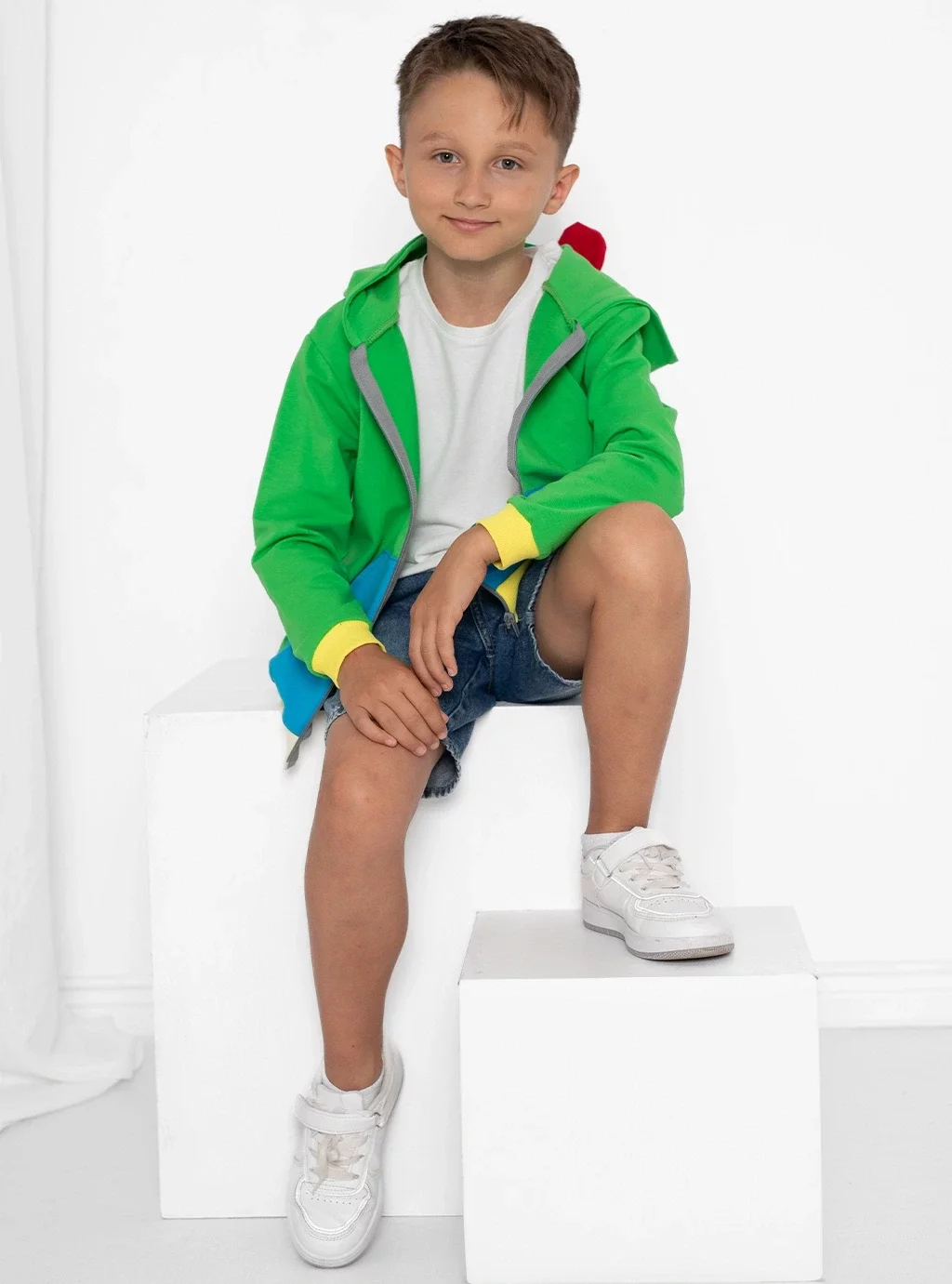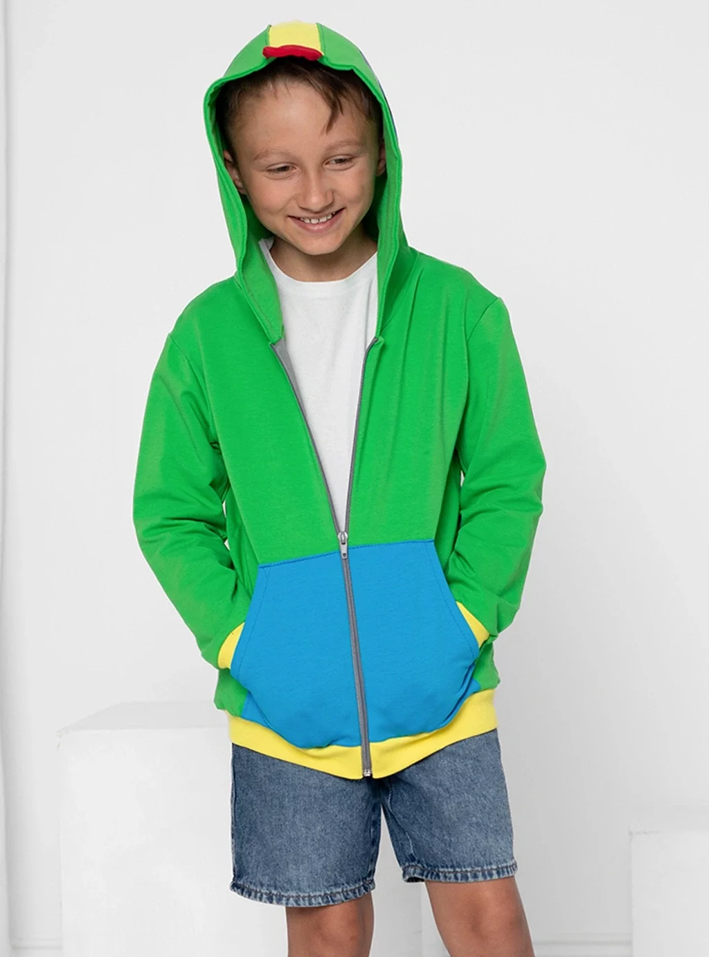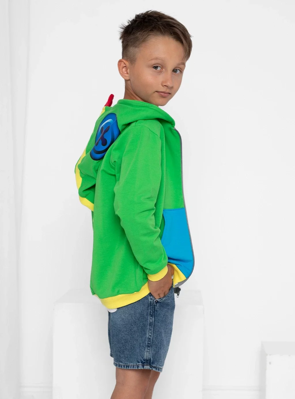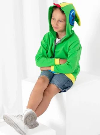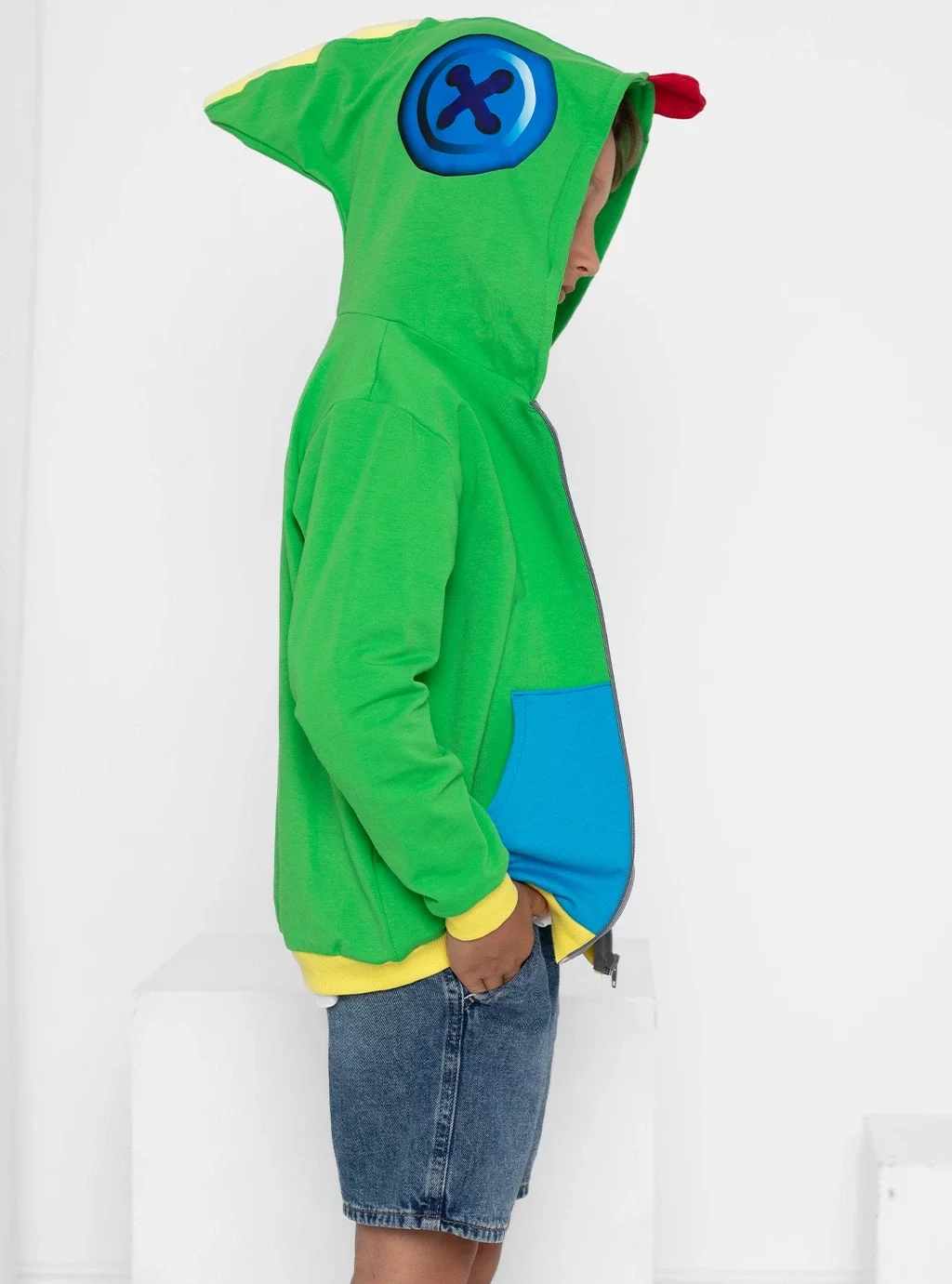 Kinderbekleidung für Mädchen und Jungen, inspiriert von der Figur Leon aus dem Kultspiel Brawl Stars. Ein grünes Sweatshirt mit blauen Taschen und einem charakteristischen Schirm und Knöpfen an der Kapuze, die Chamäleonaugen imitieren, abgerundet mit gelben Manschetten. Ein Sweatshirt-Trainingsanzug ist ein Muss in der Garderobe eines echten Fußballfans . Modetrends für Kinder sind mittlerweile die Lieblingscharaktere von Brawl Stars , die die Herzen von Kindern auf der ganzen Welt erobern. Lassen Sie Ihr Kind noch heute Teil der Fans dieses Spiels werden, indem Sie ein einzigartiges, von Leon inspiriertes Sweatshirt kaufen. Zu den größten Neuheiten in der Kindermode gehören jetzt Lieblingscharaktere aus Spielen und Filmen. Stylen Sie Ihr Kind als Barlej, Broc oder Bull oder dank unseres farbenfrohen Sweatshirts als Leon, den Schläger mit Superangriff!