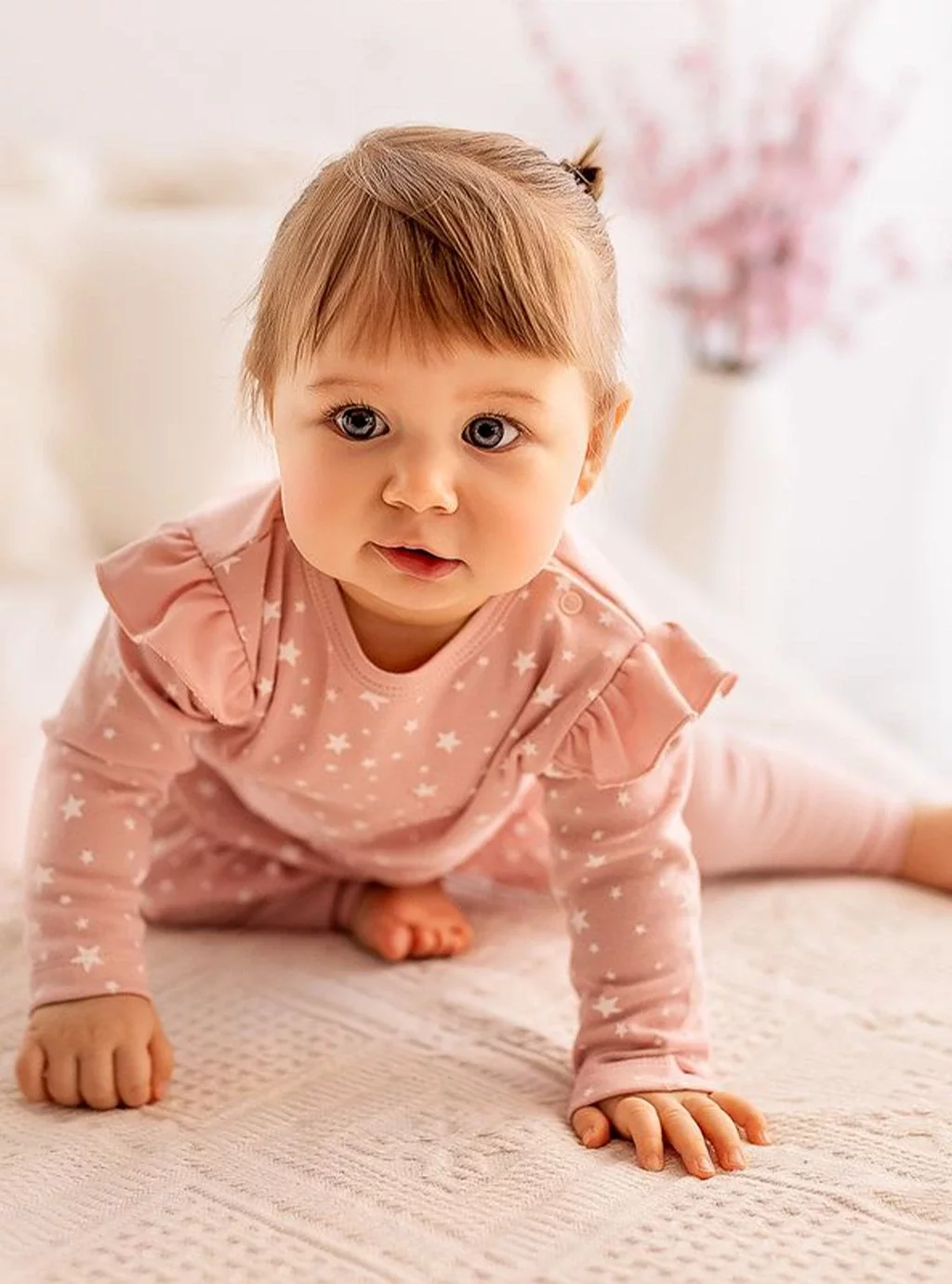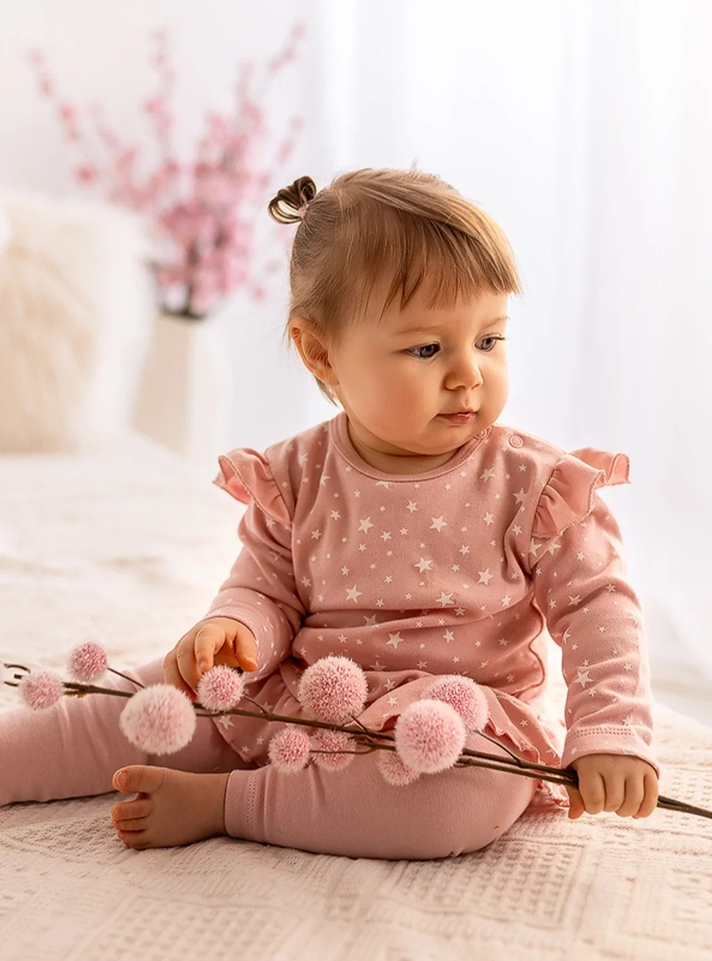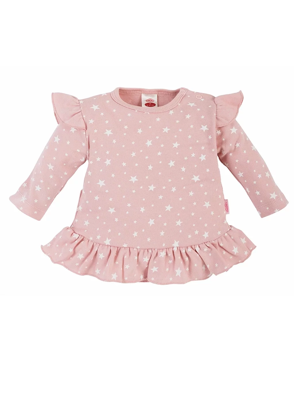 Eine tolle Idee für ein Baby oder ein größeres Mädchen – ein perfektes traditionelles Outfit, z. B. eine puderrosa Tunika mit kleinen Sternen, abgerundet mit einer Rüsche am Ärmel und am Saum. Mädchentuniken, sicher für die empfindliche Kinderhaut, mit nickelfreien Druckknöpfen um den Hals befestigt, sind eine einfache Lösung, die das An- und Ausziehen Ihres Kindes erleichtert. Eine schöne Styling-Idee für kalte Tage.