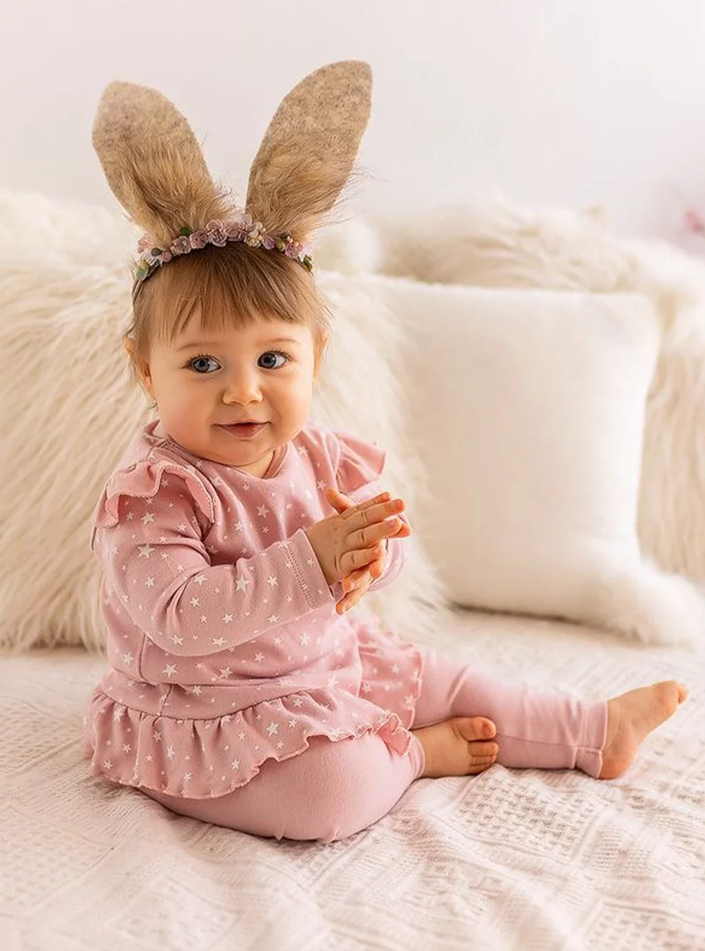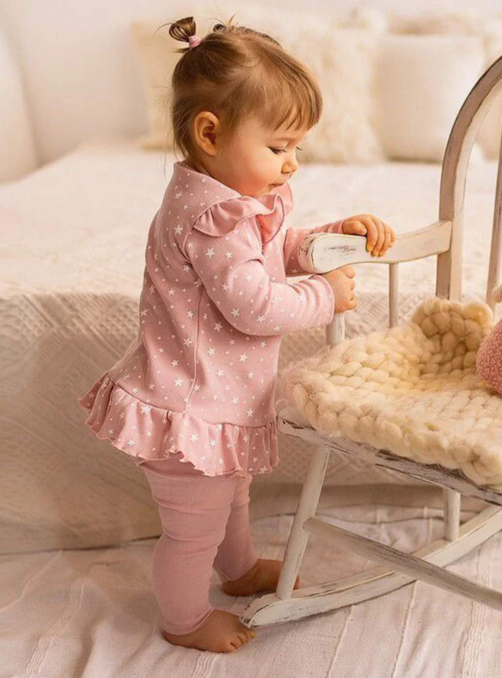 Lange Beine aus Baumwollleggings sorgen an kalten Tagen für Komfort und Wärme. Sie können sie mit einem schönen Body oder einem T-Shirt kombinieren und ein stilvolles rosa Set für ein kleines Mädchen kreieren. Der Komfort und der Stil der Leggings ermöglichen es Ihnen, sie mit verschiedenen Accessoires zu kombinieren. Spielen Sie also mit den Farben und finden Sie heraus, wann Ihr Kleines am schönsten aussieht.