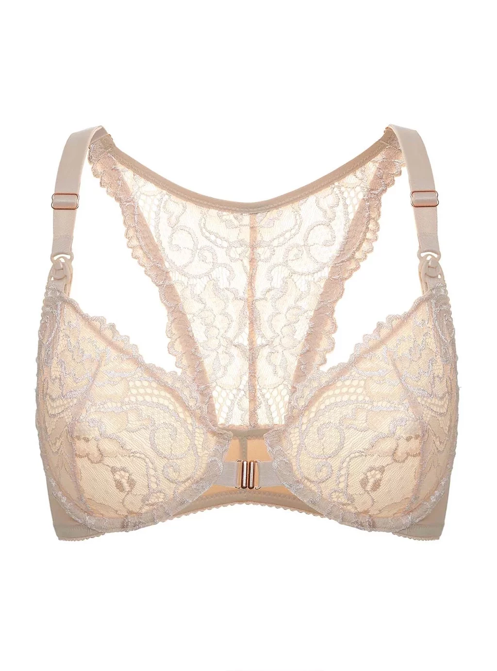Luxuriöser beigefarbener Still-BH mit goldenen Accessoires. Das Prestige-Modell ist eine Kombination aus exklusiver Unterwäsche und der Funktionalität von BHs für eine junge Mutter. Dank der bequemen Öffnung mit einer Hand können Sie Ihr Baby schnell und einfach füttern, wann immer es hungrig ist. Ein weicher BH aus elastischer Spitze, perfekt für den täglichen Gebrauch und für wichtigere Anlässe, bei denen Sie ein elegantes Kleid tragen und Ihren Rücken freilegen möchten. Ein interessanter Still-BH mit spektakulärem Frontverschluss. Für werdende und junge Mütter lohnt sich die Investition in einen Still-BH, auch als Geschenk. z.B. für eine Babyparty.  Die besten Still-BHs sind ein Muss für jede modebewusste und sexy Frau.