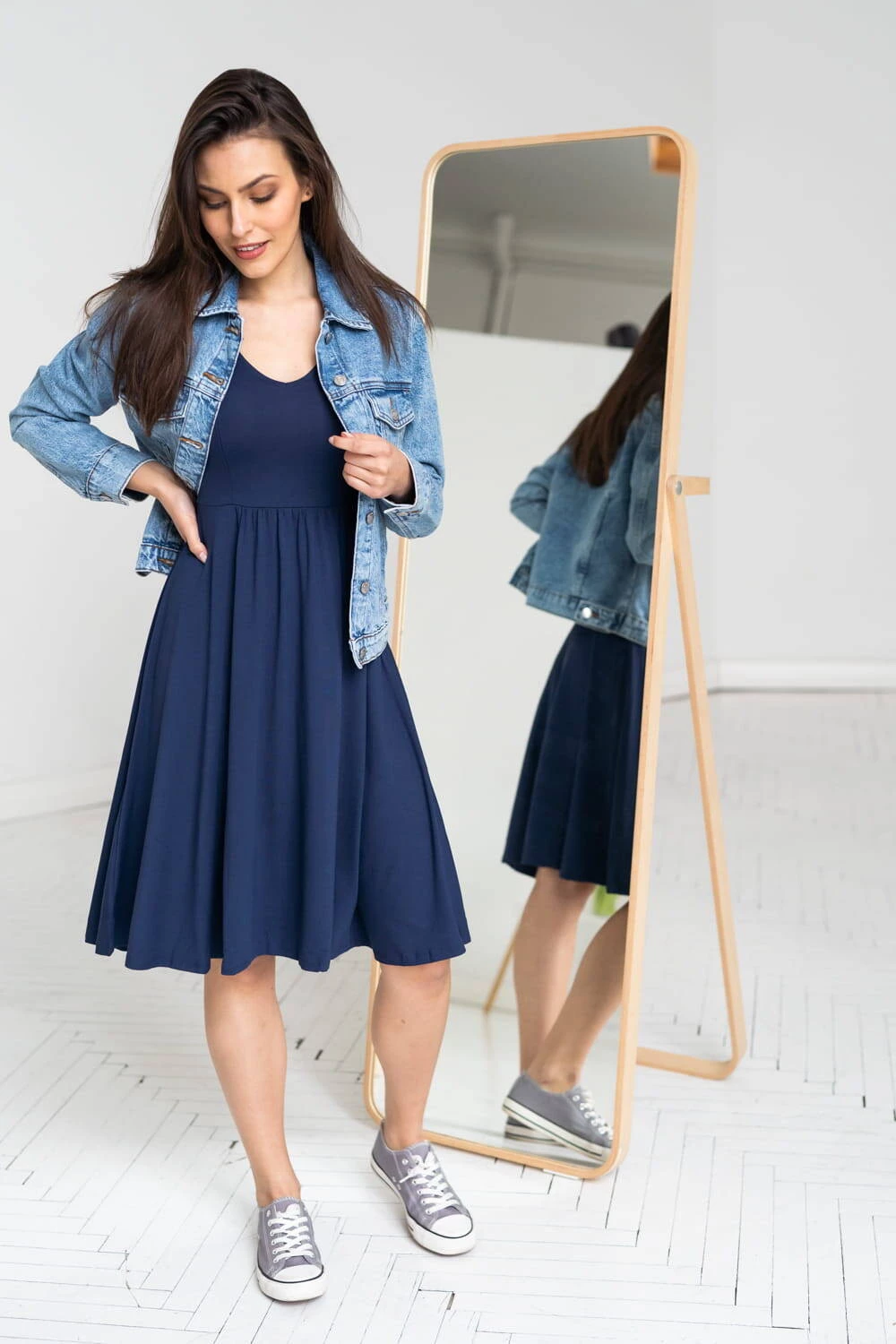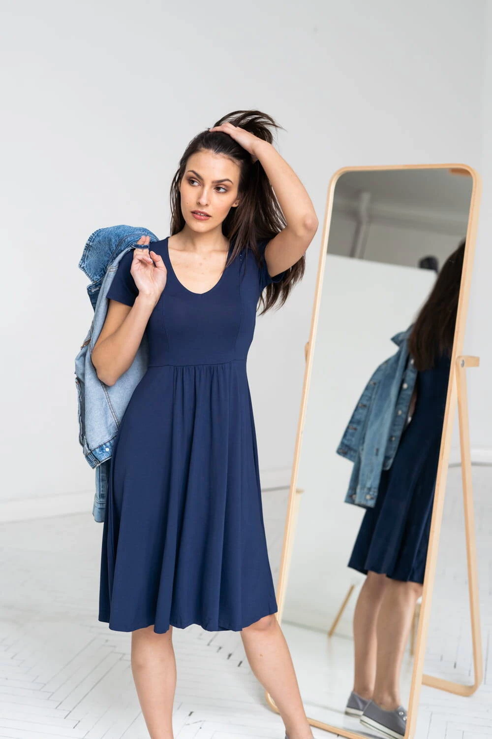 Ein ausgestelltes marineblaues Stillkleid ist eine ausgezeichnete Investition für viele Jahre, ein Symbol der Weiblichkeit und darf in Ihrer Garderobe sowohl für Schwangere als auch für Mütter nicht fehlen, da es die Stillzeit erleichtert.