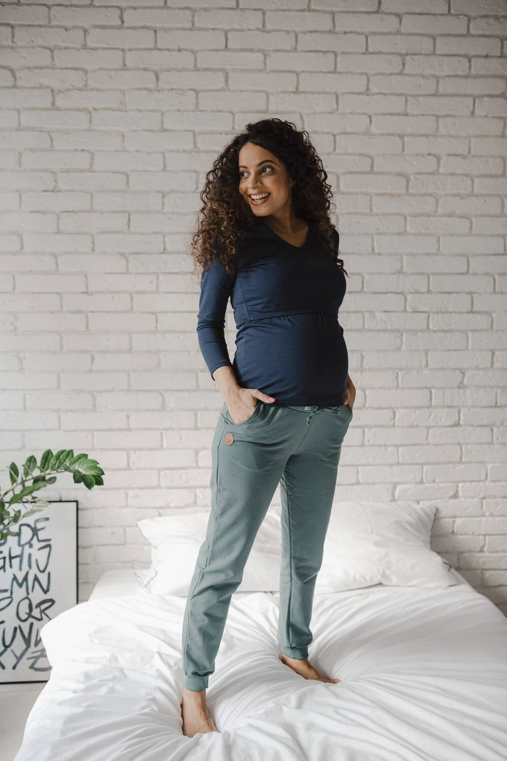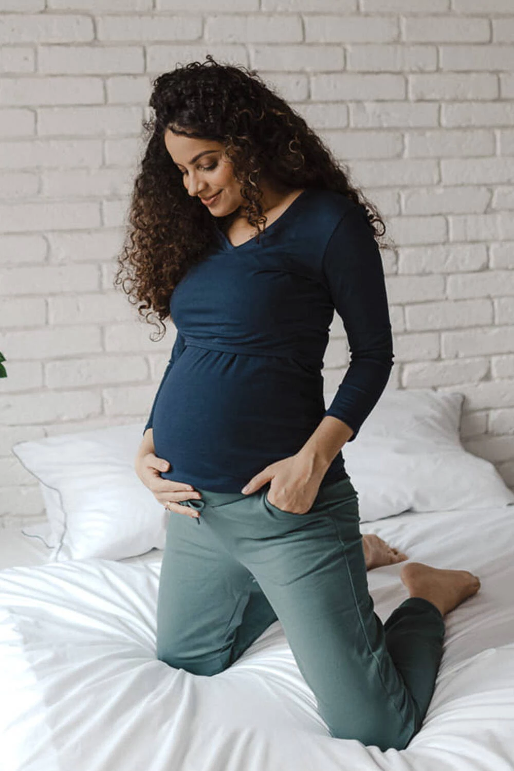 Unser marineblaues langärmliges Umstands- und Stillblusen-Milchshirt ist eine perfekte Kombination aus Eleganz, Komfort und Funktionalität. Die Damen-Umstandsbluse besteht aus hochwertigen Materialien und ist eine einzigartige und modische Umstandsbluse, die in jeder Phase der Schwangerschaft und nach der Geburt für Tragekomfort sorgt. Dank der klassischen dunkelblauen Farbe passt diese Bluse zu vielen Stilen, sowohl im Alltag als auch formeller.