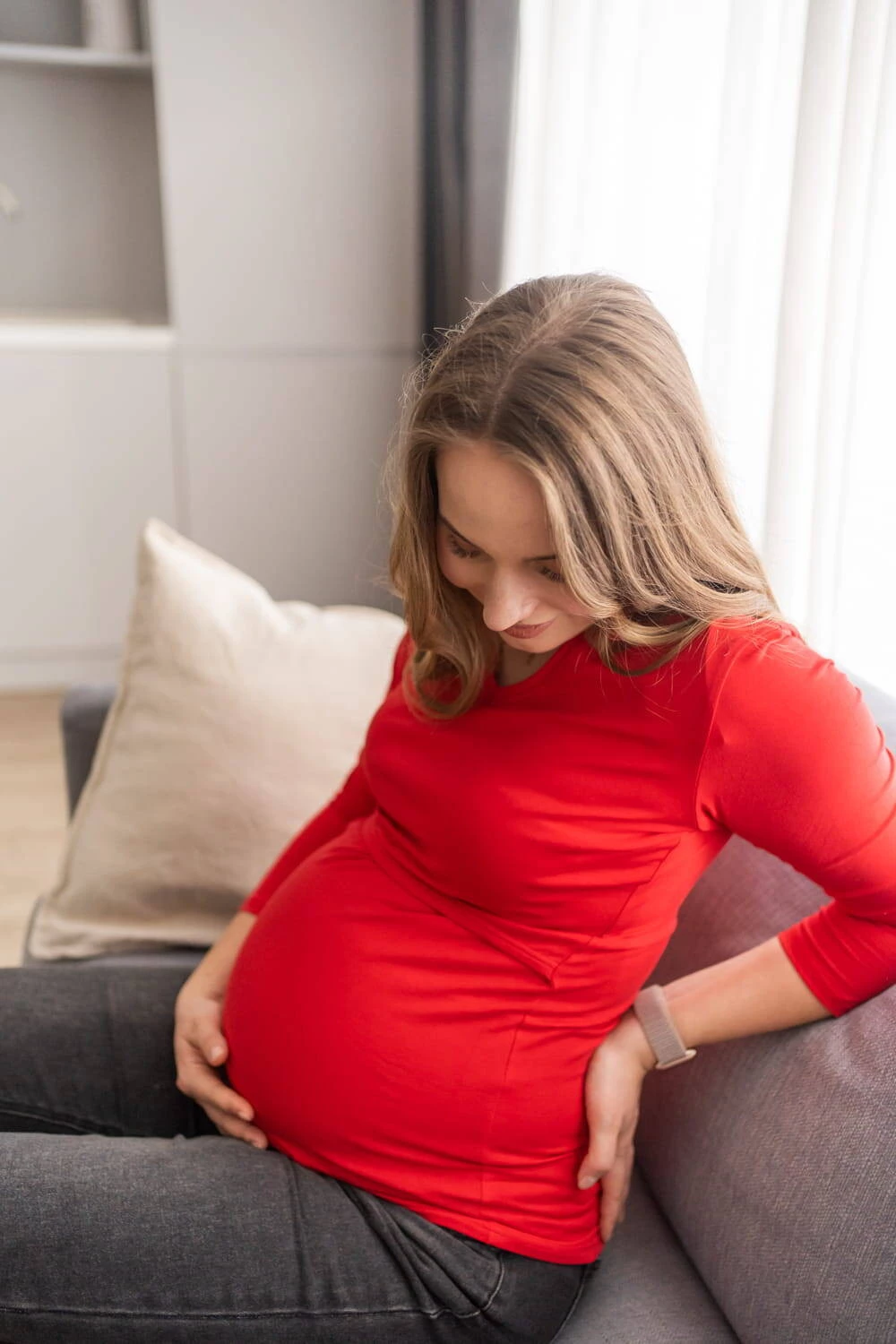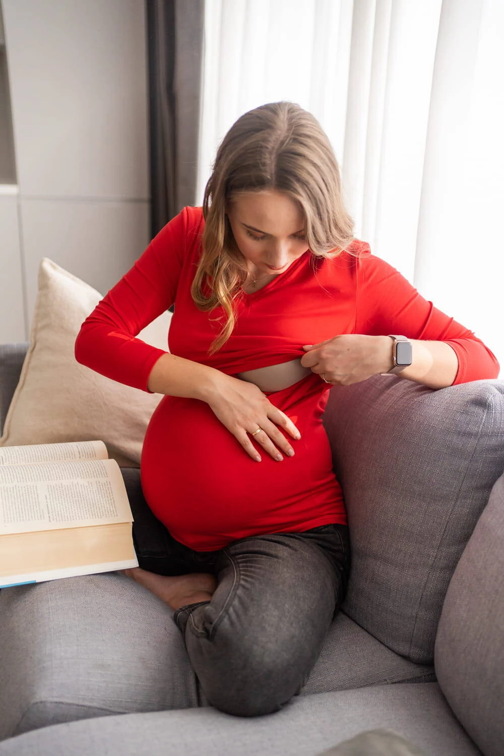 Die perfekte Umstandsbluse in einer einzigartigen roten Farbe, die zu allem und jedem besonderen Anlass passt. Damen-Umstandsblusen mit modischem V-Ausschnitt und bequemen Ärmeln dürfen in Ihrer Schwangerschaftsgarderobe nicht fehlen. Der Bauch der werdenden Mutter soll sich angenehm anfühlen, deshalb schützen hochwertige Umstandsblusen aus der Milk Shirt-Kollektion den Schwangerschaftsbauch mit zarter Baumwolle. Das Material verursacht weder beim Kind noch bei Ihnen eine Sensibilisierung oder Allergie, auch nicht nach der Schwangerschaft, wenn Sie Ihr Baby stillen. Umstandsmode wird auf Ihre Bedürfnisse zugeschnitten und sorgt in jeder Phase für Komfort. Wählen Sie eine farbenfrohe Blusenkollektion für Schwangere und Stillende, die Sie dank ihres modischen Schnitts bei Bedarf auch nach der Schwangerschaft begleiten kann.