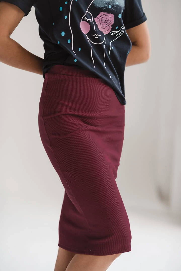 Umstandsbauchrock aus geripptem Strick in Burgunderrot