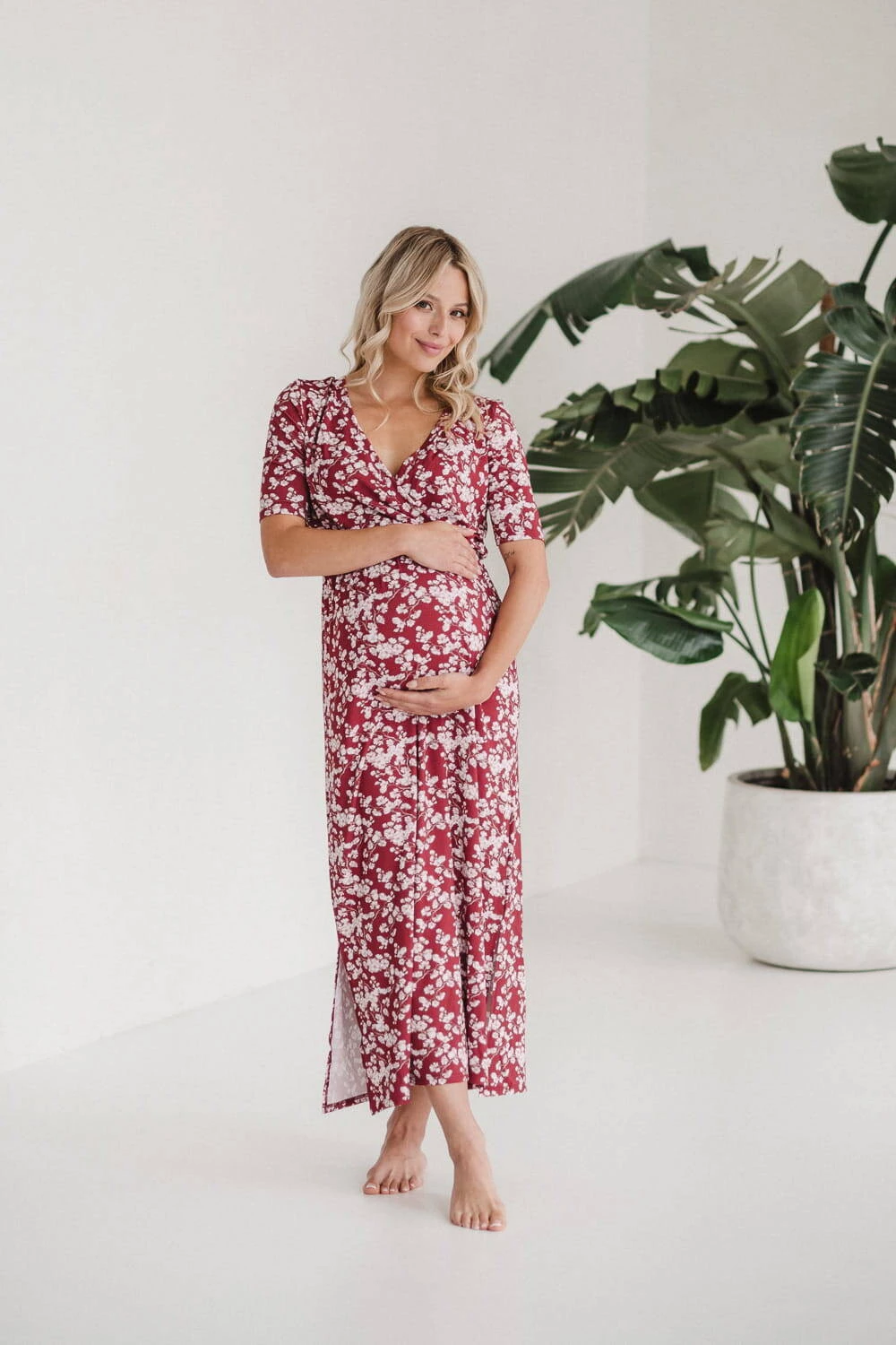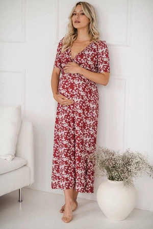 Two Ways LONG Umstands- und Stillkleid, bordeauxrot, mit hellen Blumen, kurze Ärmel