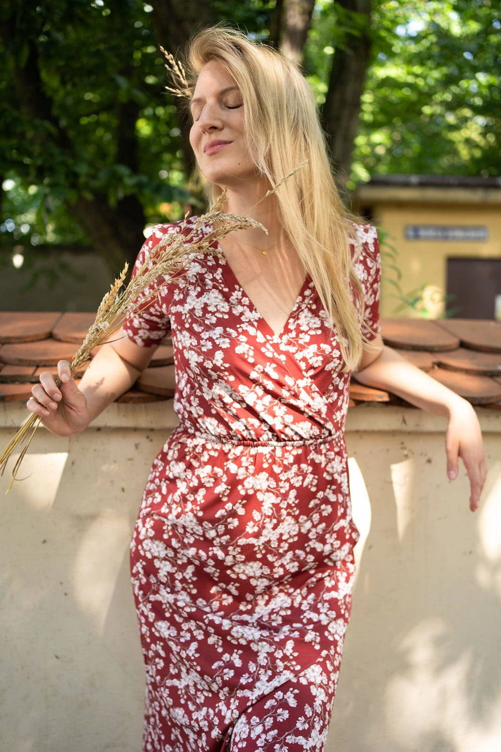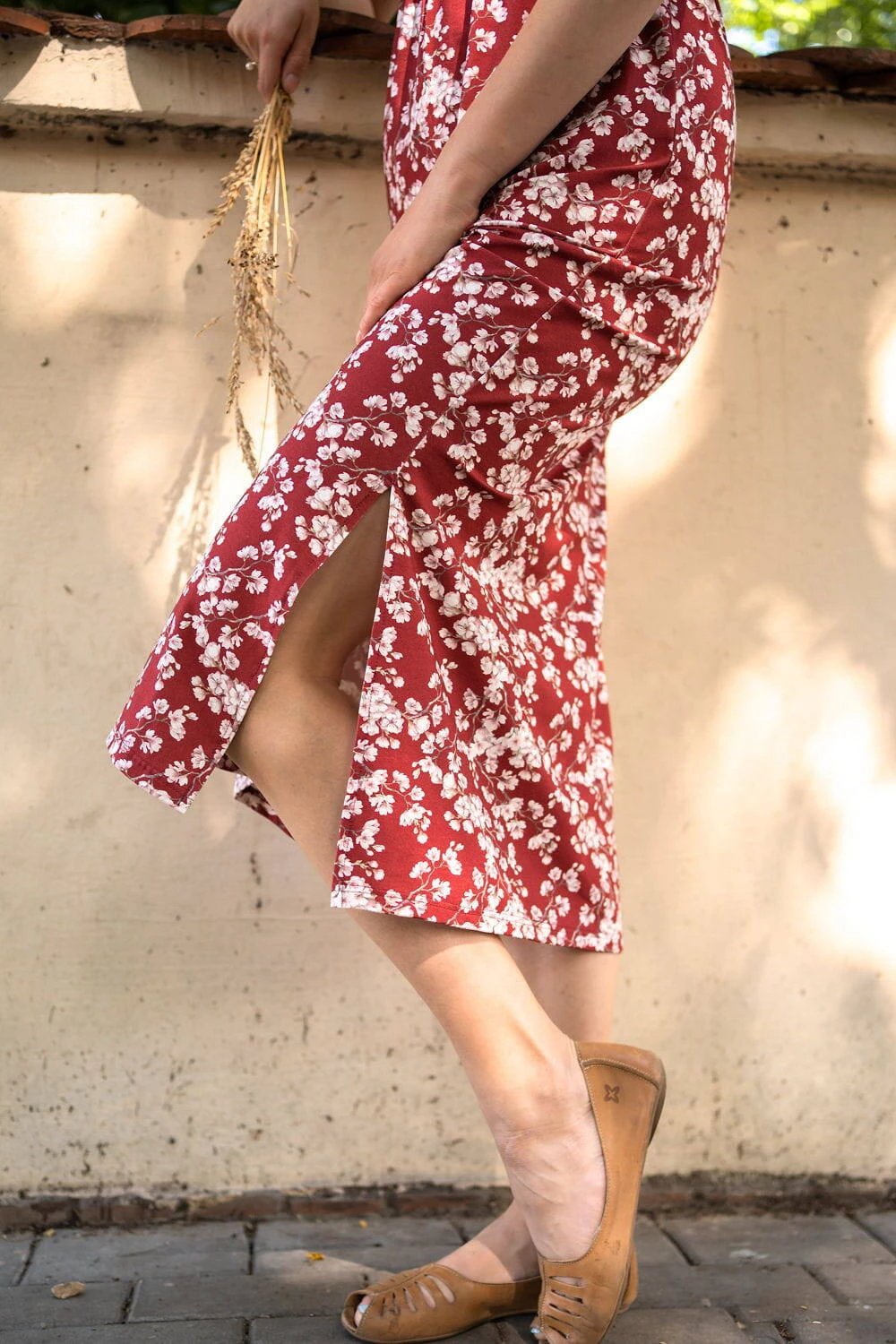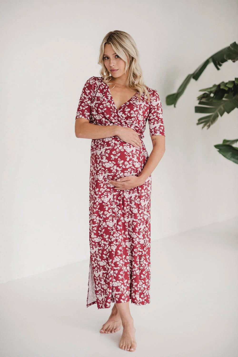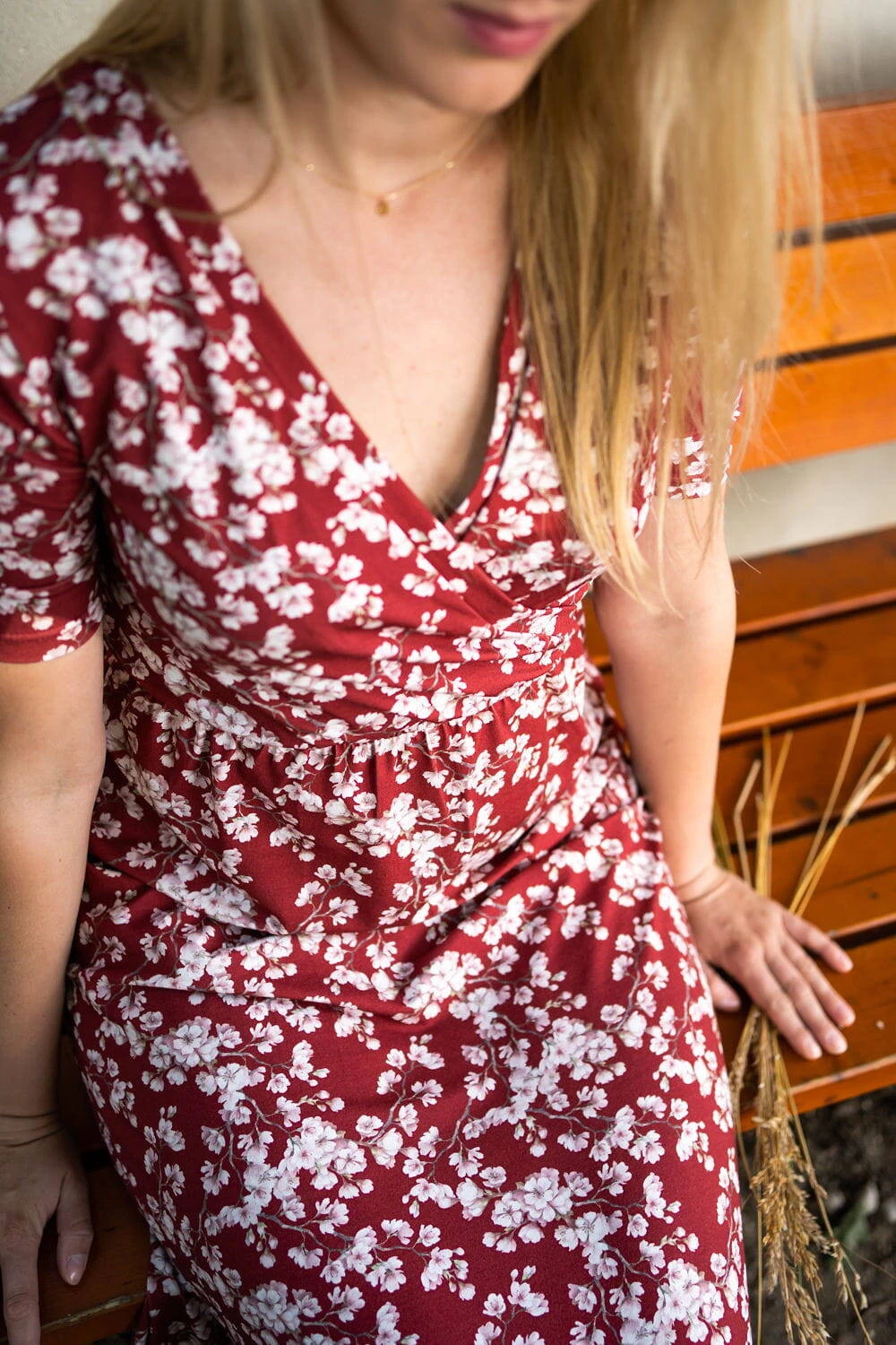 Two Ways LANGES Umstands- und Stillkleid – Burgunderrot mit Blumen