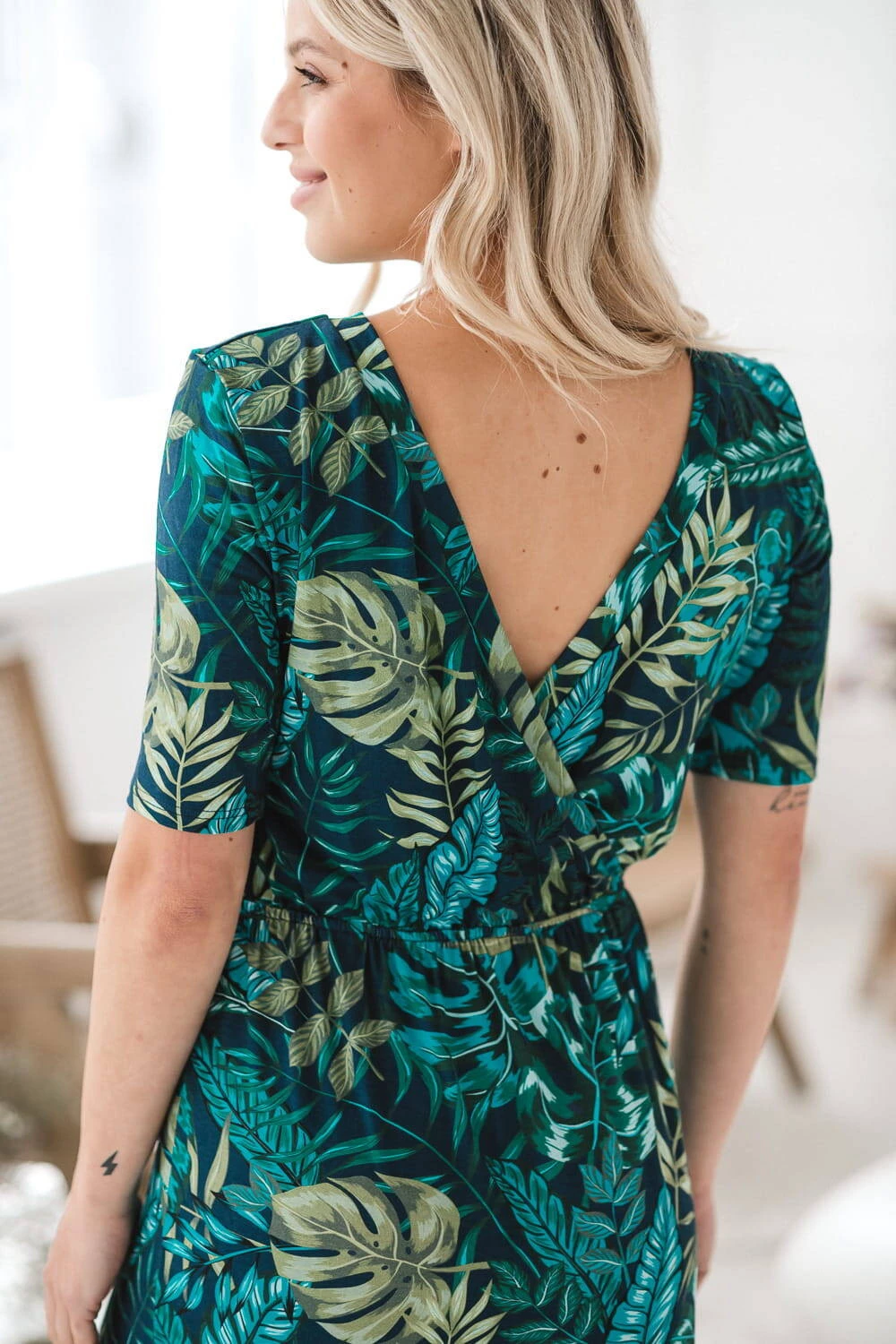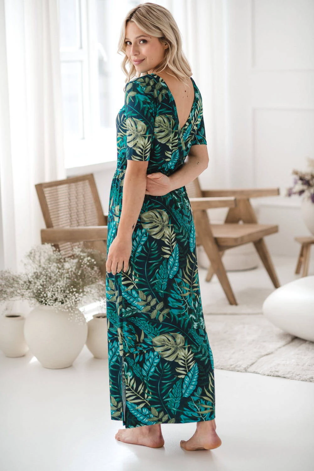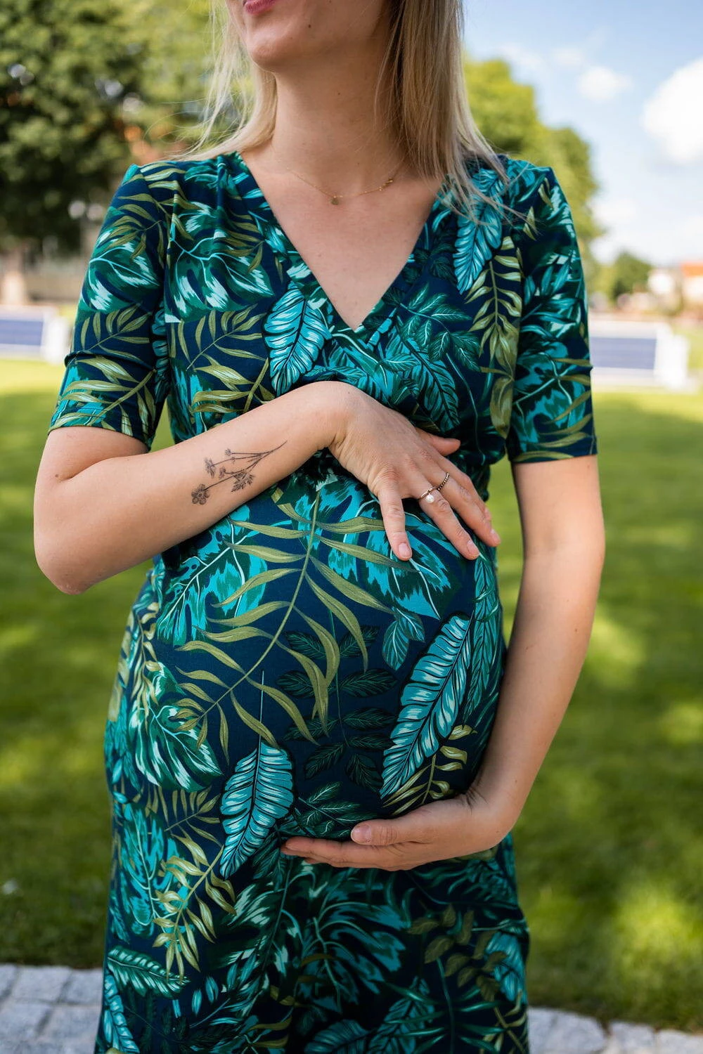 Das dezente Muster aus tropischen Blättern verleiht dem Kleid einzigartigen Charme und Eleganz und macht es zu einem unverzichtbaren Element der Garderobe einer frischgebackenen Mutter, das Sie vom ersten Mal an lieben werden.