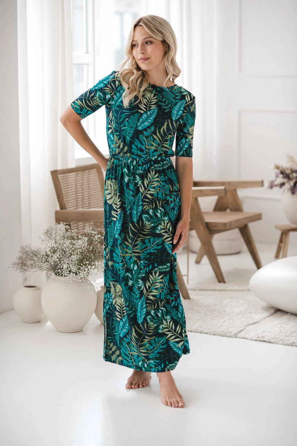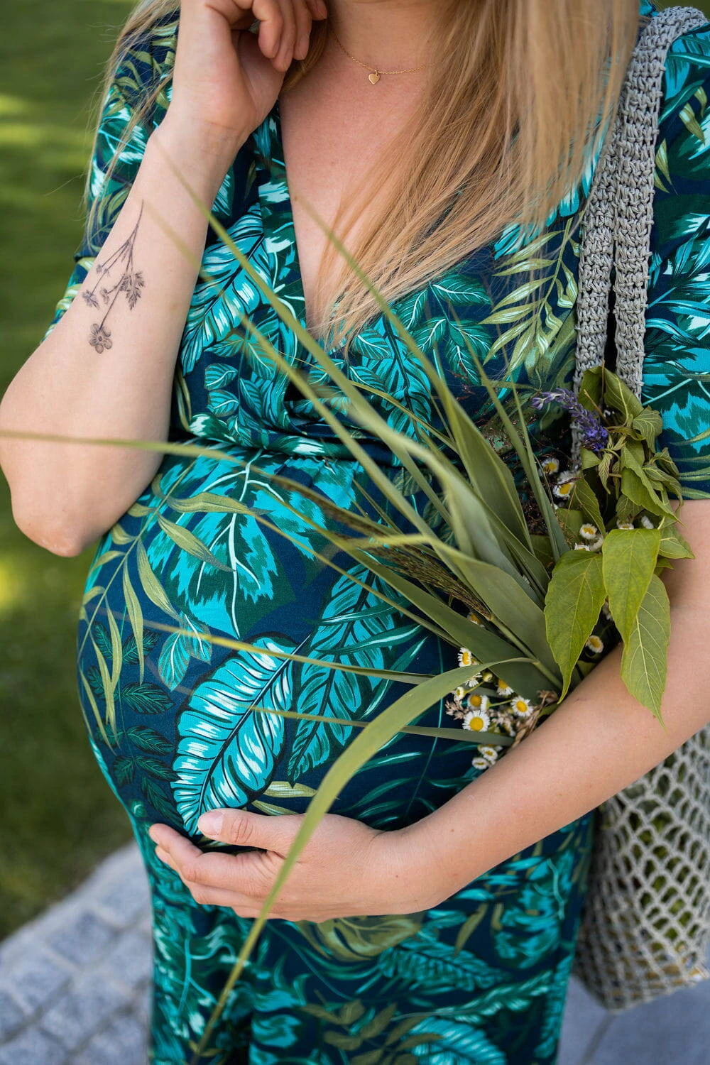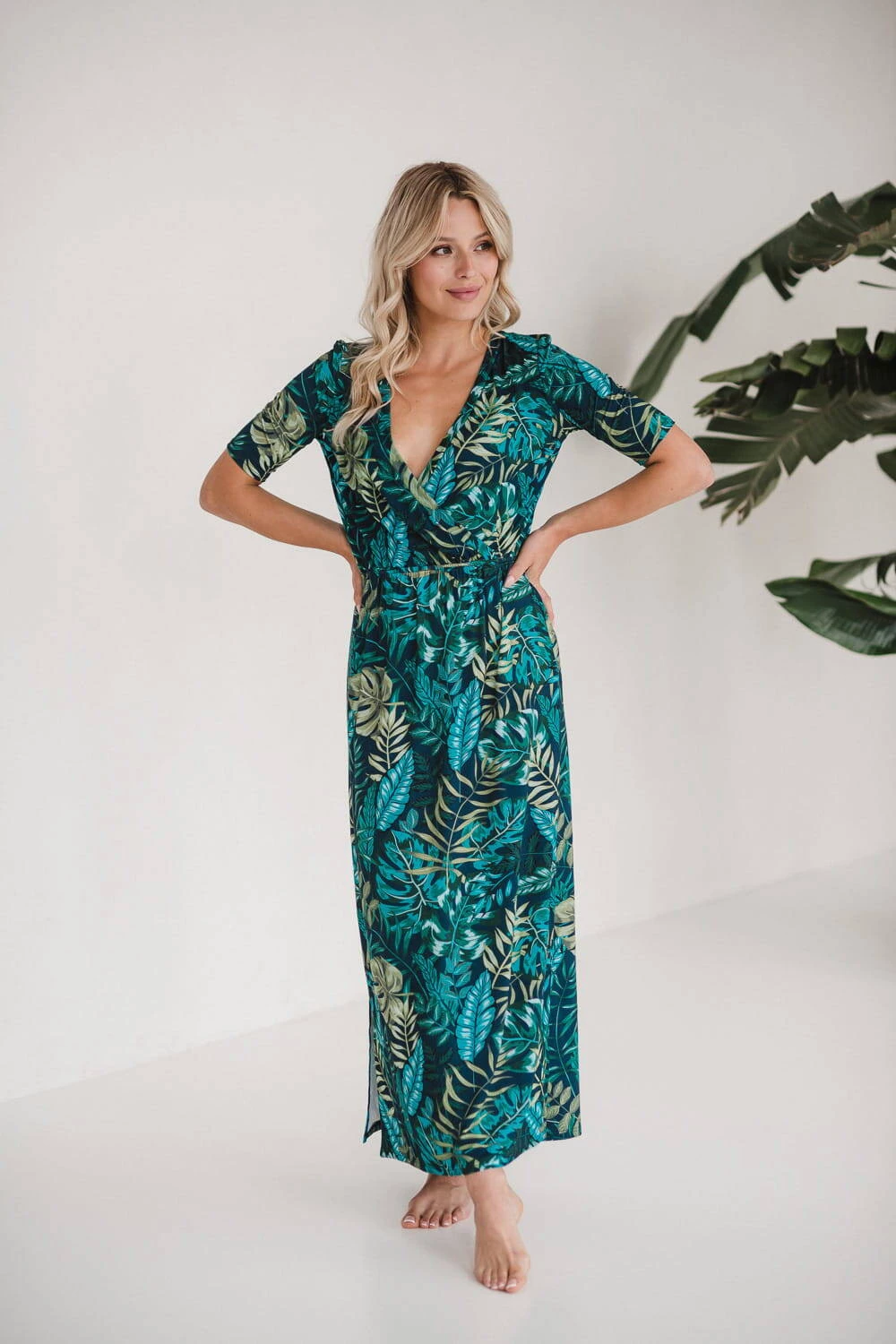 Das dezente Muster aus tropischen Blättern verleiht dem Kleid einzigartigen Charme und Eleganz und macht es zu einem unverzichtbaren Element der Garderobe einer frischgebackenen Mutter, das Sie vom ersten Mal an lieben werden.