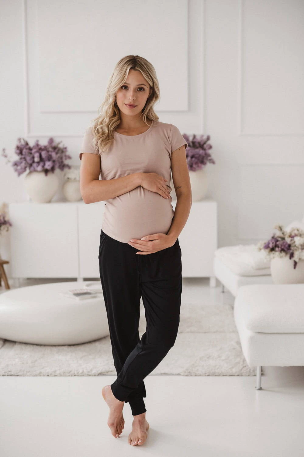Eine universelle beigefarbene Umstandsbluse mit kurzen Ärmeln, die für jeden Anlass vom ersten bis zum dritten Trimester und darüber hinaus geeignet ist. Diese Sommer-Umstandsbluse hat Falten auf beiden Seiten des Bauches , die sich an den wachsenden Bauch und den sich verändernden Körper anpassen. Im Oberteil der perfekten Umstandsbluse ist ein spezielles , nach oben klappbares Panel eingenäht, mit dem Sie das Neugeborene einfach und schnell füttern können. Umstands- und Stillblusen bieten Ihnen Bequemlichkeit und Komfort während der Schwangerschaft und später in der Stillzeit. Der Komfort der werdenden Mutter ist sehr wichtig, daher lohnt es sich, in Kleidung zu investieren, die ihn gewährleistet. Wählen Sie farbenfrohe Blusen für Schwangere aus der Milk Shirt-Serie und erleben Sie, wie bequem Umstandsblusen sein können, wenn der Körper wieder zu seiner Vorschwangerschaftsfigur zurückkehrt.