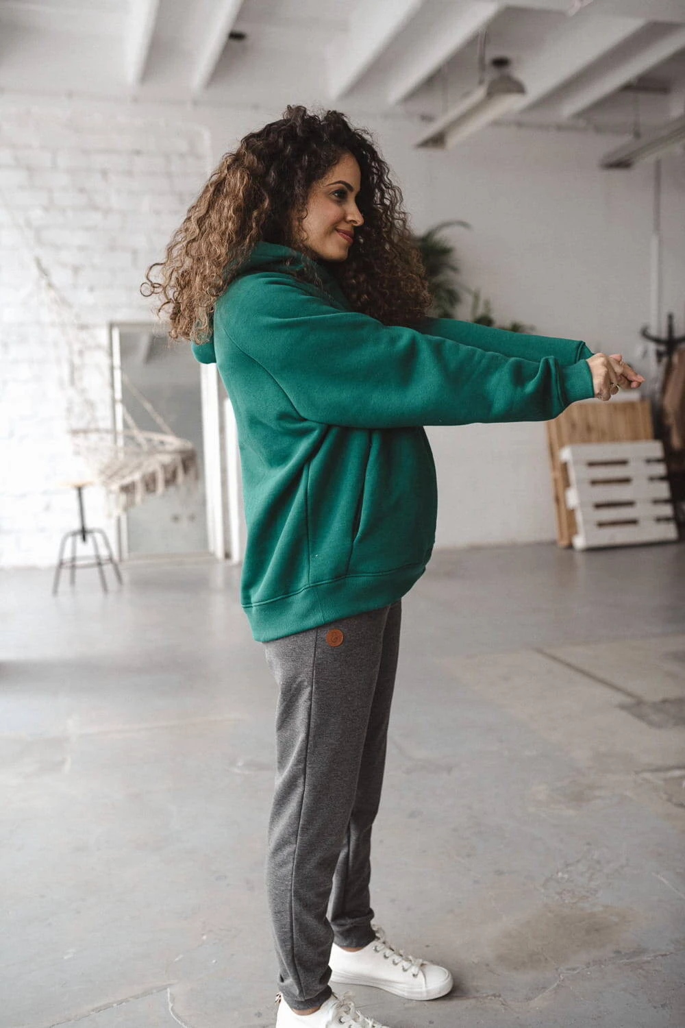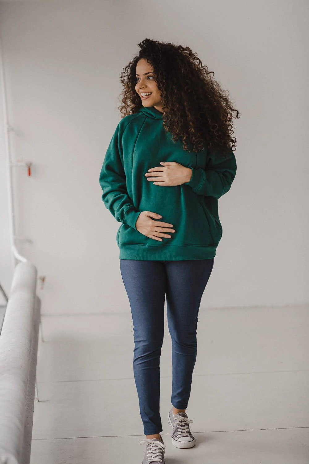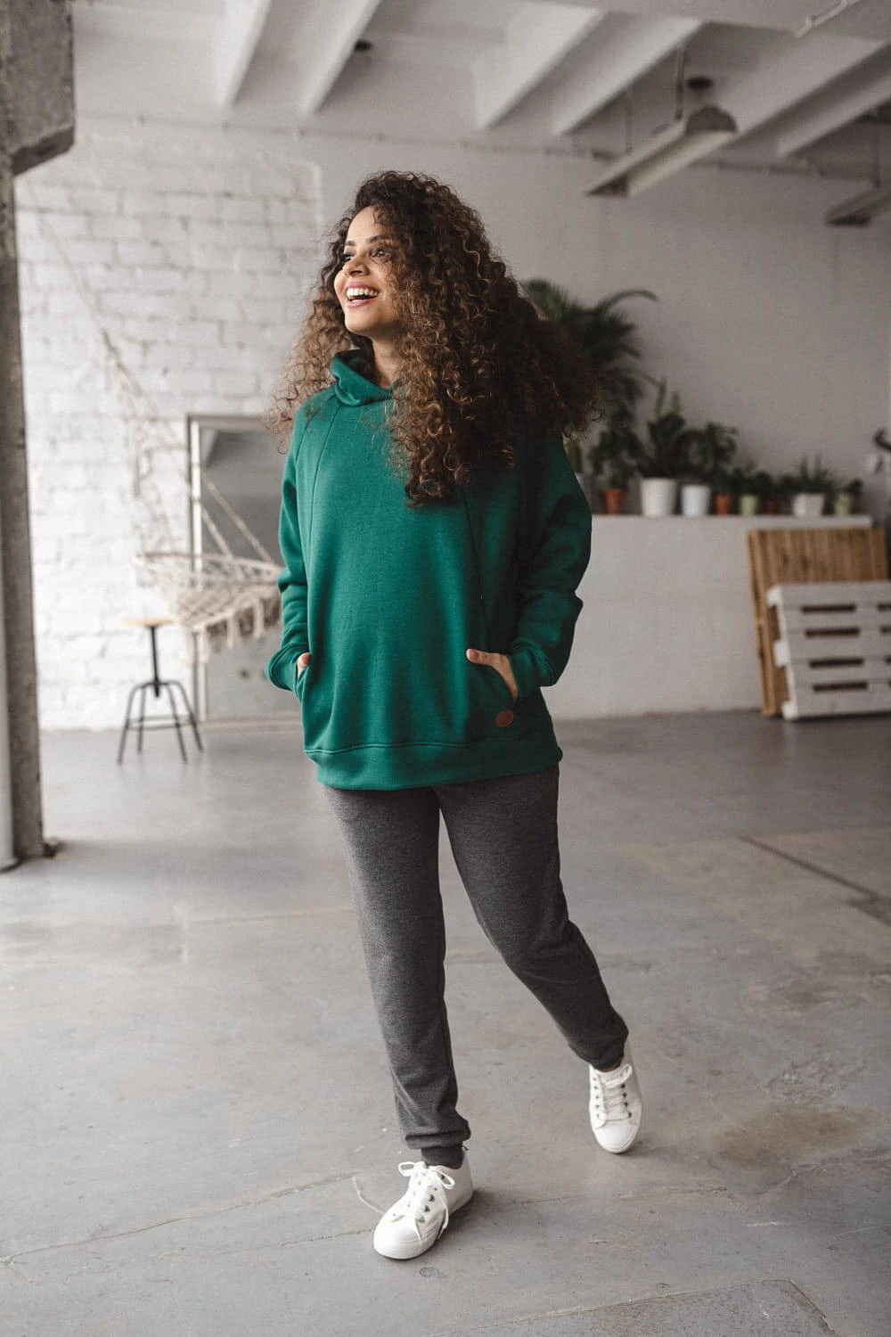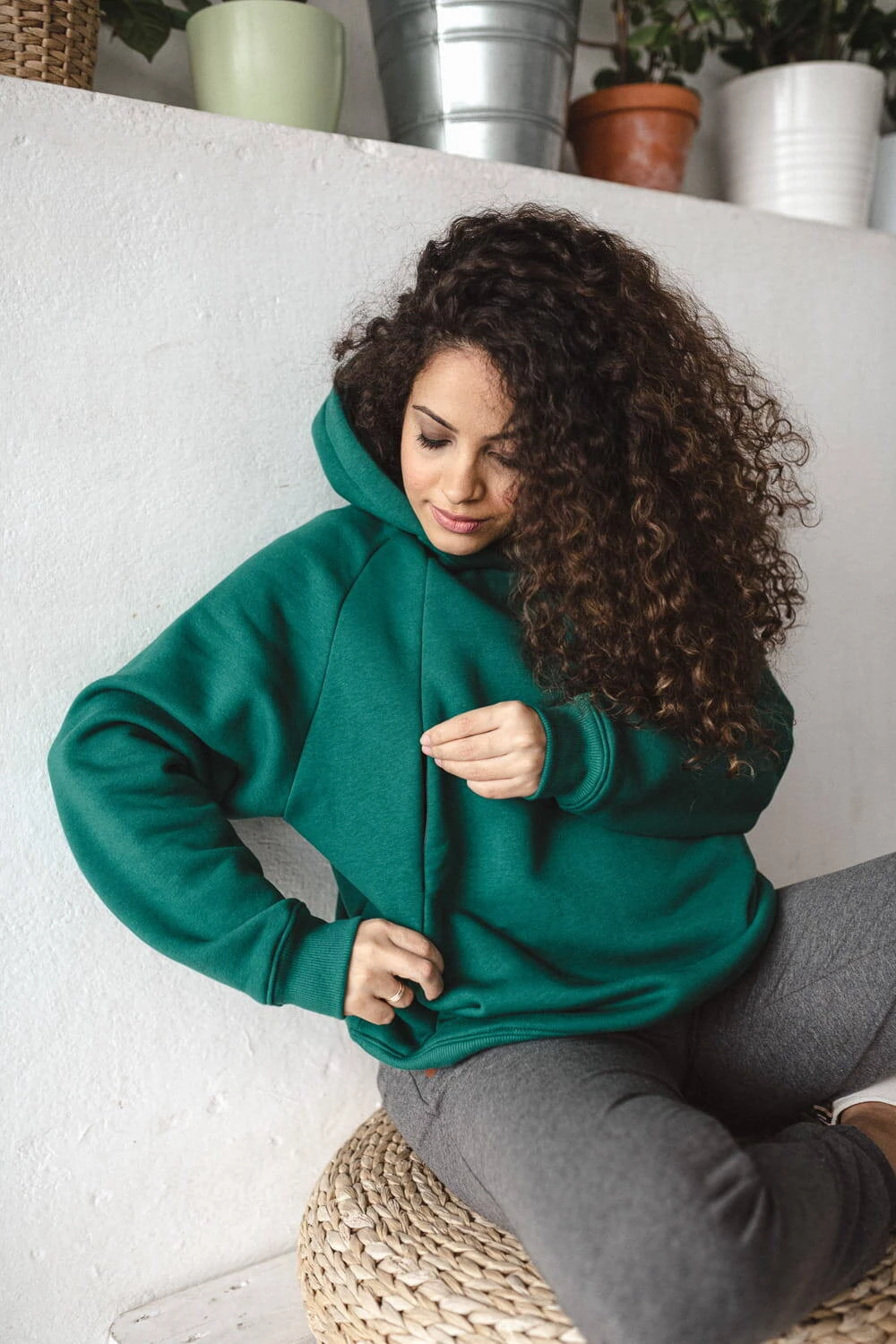Entdecken Sie das Umstands-Still-Sweatshirt von Motherhood in einer wunderschönen, modischen grünen Farbe. Das vorgestellte Umstands-Sweatshirt mit Kapuze aus dickem Sweatshirt-Stoff mit weichem Flausch auf der Innenseite ist perfekt für kältere Tage. Das Still-Sweatshirt verfügt über solide Reißverschlüsse an der Unterseite, die ein bequemes und diskretes Stillen in jeder Situation ermöglichen. Der Oversize-Schnitt passt selbst zum markantesten Schwangerschaftsbauch und der Grünton sorgt sowohl während als auch nach der Schwangerschaft für einen schicken Look. Das funktionelle Still-Sweatshirt ist aus atmungsaktiven, nach Öko-Tex Standard 100 geprüften Stoffen gefertigt und fühlt sich sowohl für Mutter als auch für Baby angenehm an. Der gesamte Produktionsprozess der Still-Sweatshirts findet in Polen statt, was höchste Verarbeitungsqualität garantiert.
