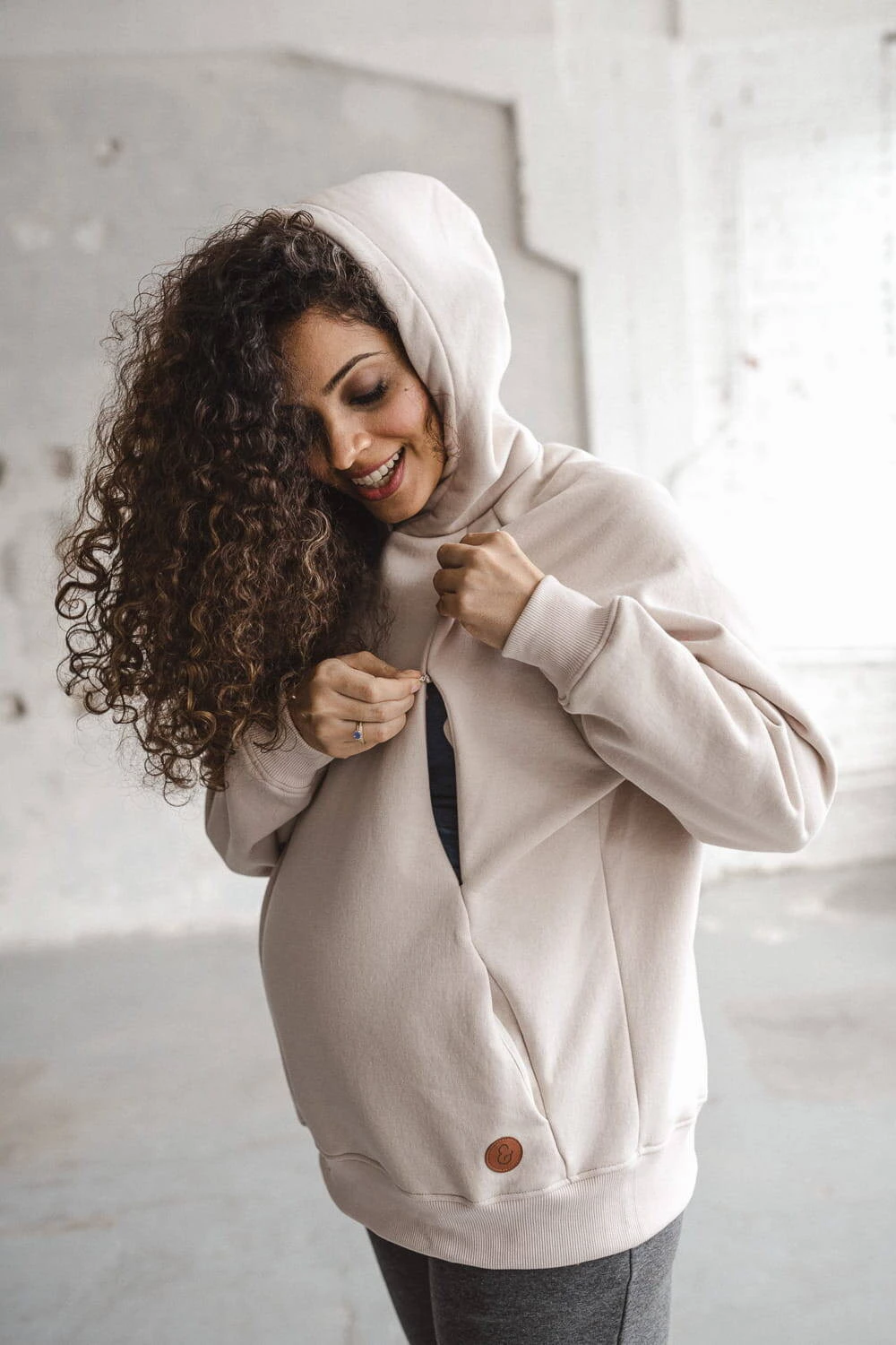Entdecken Sie das hochwertigste Umstands-Still-Sweatshirt von Motherhood in Hellbeige. Dieser bequeme Umstands-Hoodie ist aus dickem Sweatshirt-Stoff mit weicher Flor-Innenseite gefertigt und eignet sich daher perfekt für kältere Tage.