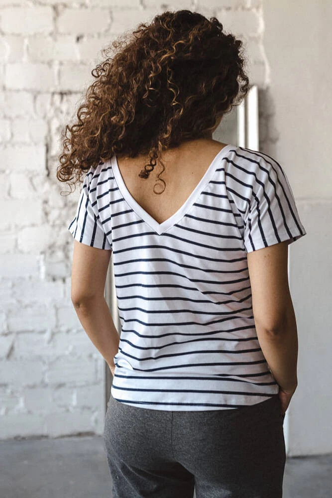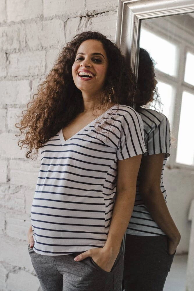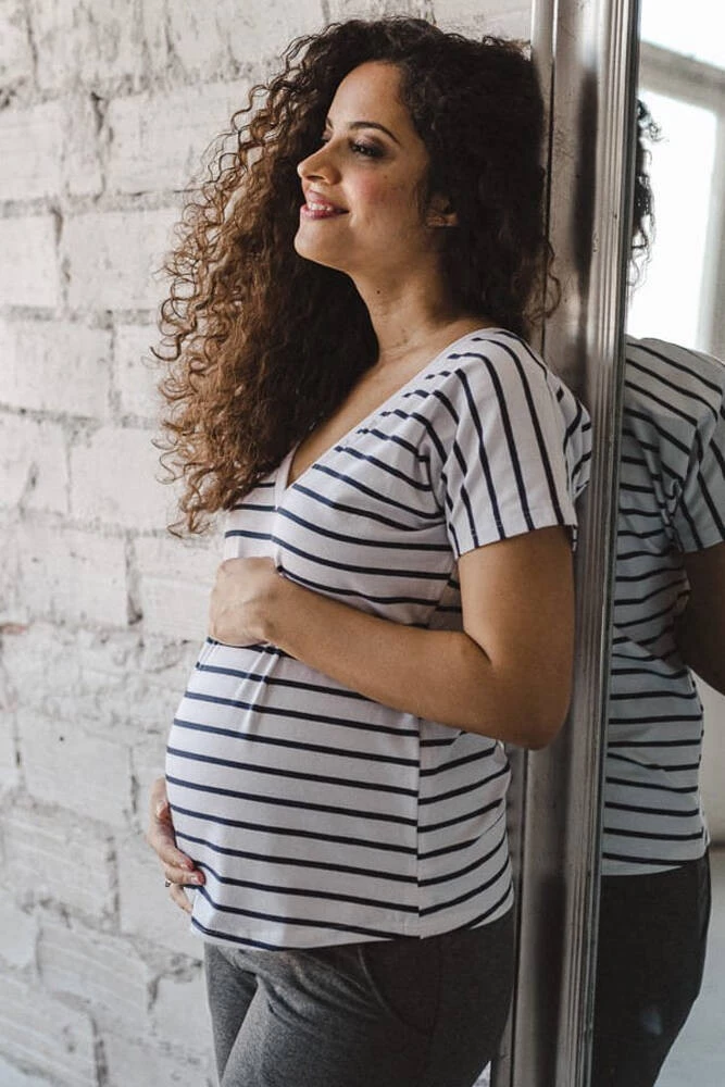 Eine doppelseitig weiß gestreifte Bluse ist die perfekte Basic-Umstandsbluse für stillende Frauen. Eine modische Umstandsbluse und für frischgebackene Mütter ist die Quintessenz von Stil und Weiblichkeit in der Garderobe. Sommerliche Umstandsblusen mit bequemen Reißverschlüssen zum Füttern ermöglichen es Ihnen, Ihr Baby auch an öffentlichen Orten wie einer Galerie oder einem Park diskret und einfach zu füttern. Wie jede Basic-Damenbluse ist diese feminine Umstandsbluse für werdende Mütter ein perfekter Umstandsstil und eine Basis für Ihr Alltags-Styling.
