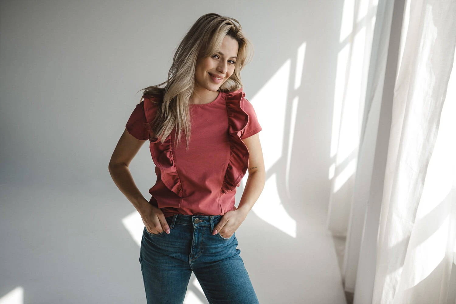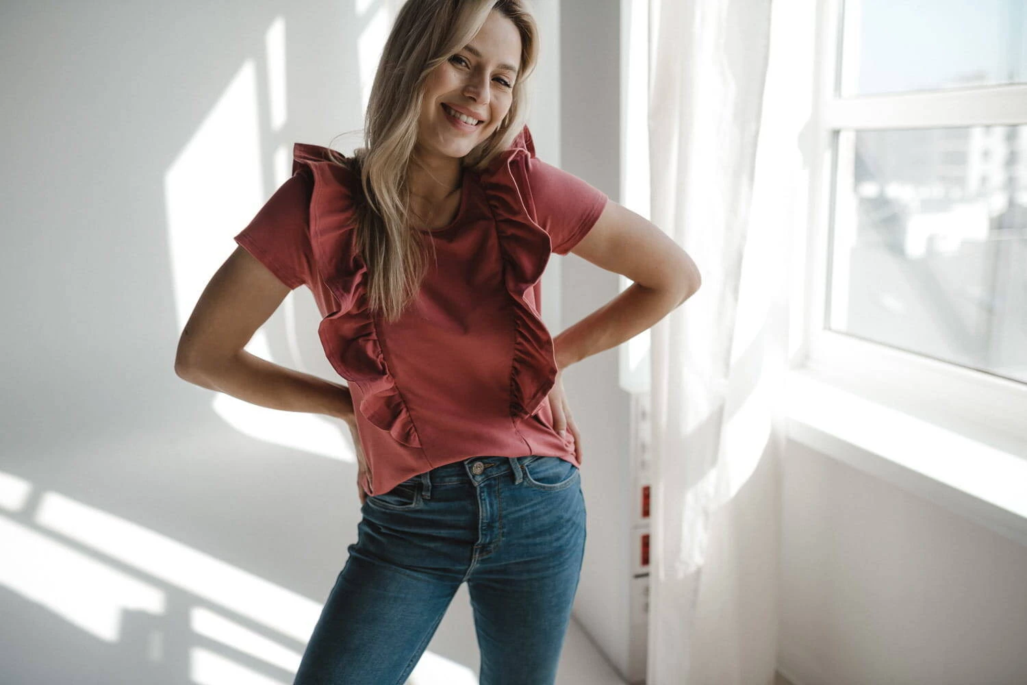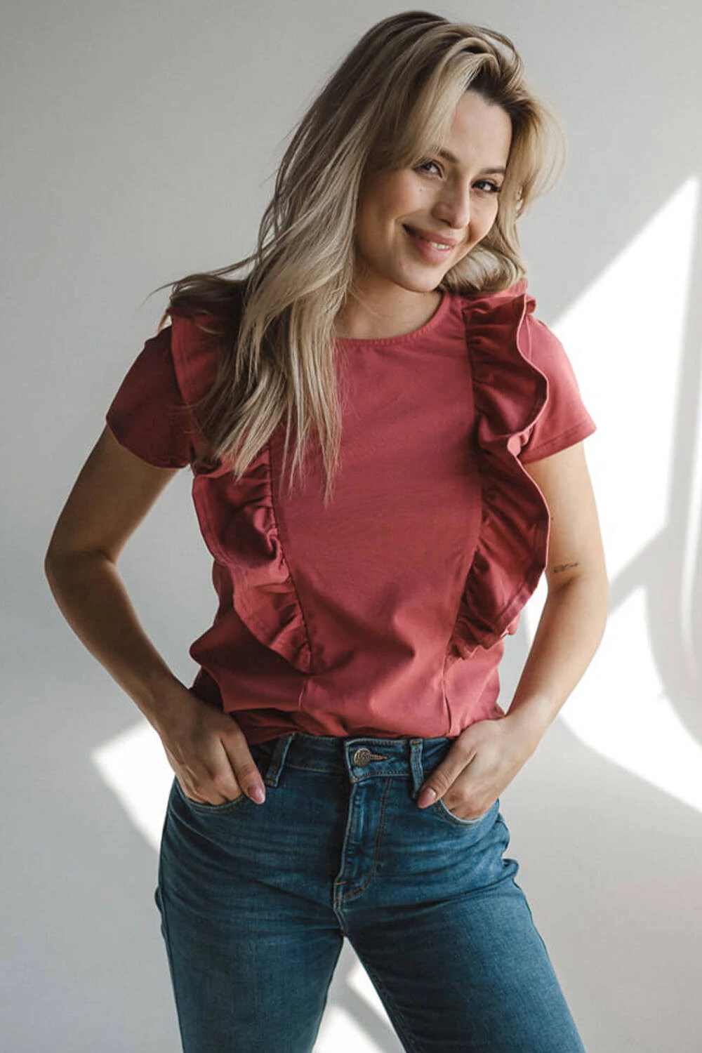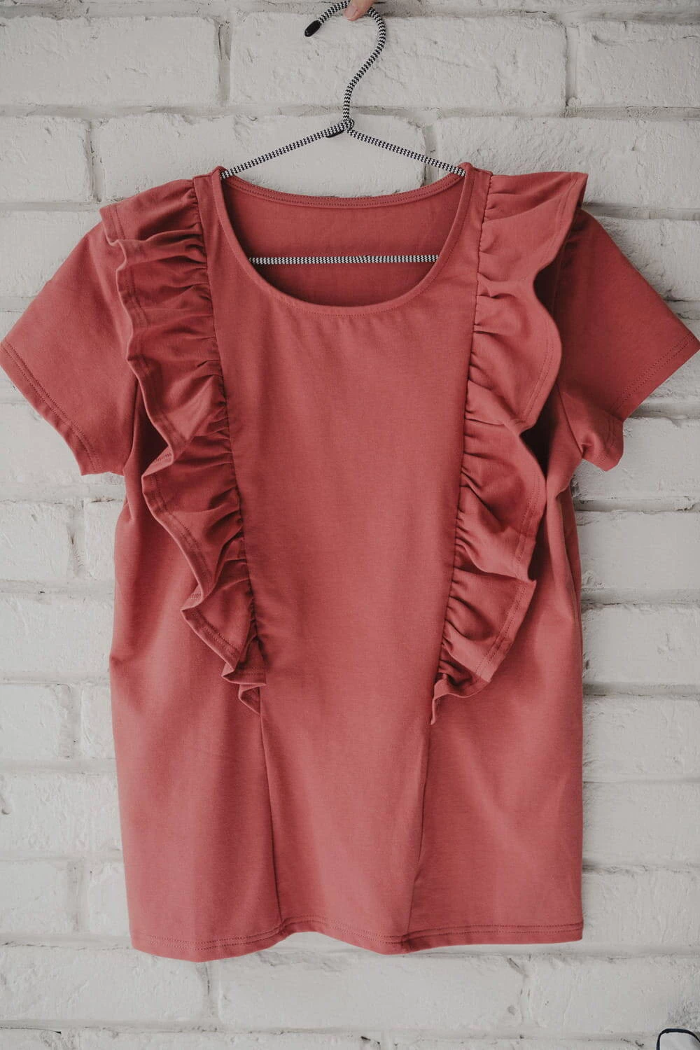 Eine perfekte rosa Bluse für stillende Frauen mit kurzen Ärmeln und einer dekorativen Rüsche, die die Stillreißverschlüsse perfekt verdeckt. Eine modische Bluse für junge Mütter ist die Quintessenz von Stil und Weiblichkeit in der Garderobe. Mit Sommerblusen mit bequemen Reißverschlüssen zum Stillen können Sie Ihr Baby auch an öffentlichen Orten wie einer Galerie oder einem Park diskret und problemlos füttern. Eine perfekte Bluse, die sowohl im Alltag als auch zu wichtigeren Anlässen zu Rock, Hose oder Leggings passt.