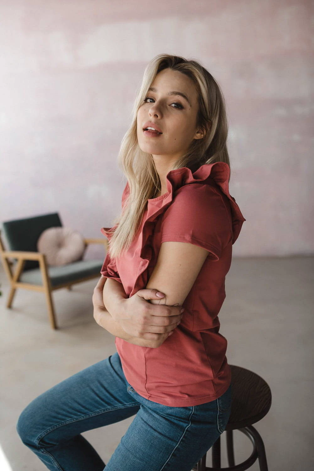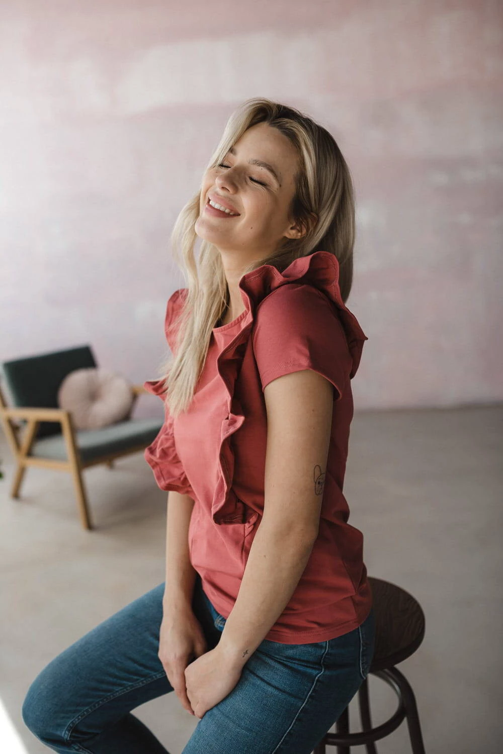 In diesem Angebot bieten wir eine Bluse aus staubigem Zedernholz mit dekorativer Rüsche für frischgebackene Mütter an, die sorgfältig in Polen von der renommierten Marke Milk & Love genäht wurde, deren Umstands- und Stillstil seit Jahren von Frauen während der Schwangerschaft und nach der Geburt geschätzt wird. wenn sie Ihr Baby stillen. Stylische Blusen für stillende Frauen im Slow-Fashion-Gedanken garantieren, dass unsere Umstands- und Stilloberteile auch später noch gut funktionieren, denn die Reißverschlüsse, durch die Sie nach dem Schwangerschaftsabenteuer stillen, sind sehr gut versteckt, in diesem Fall hinter bezaubernden Rüschen.