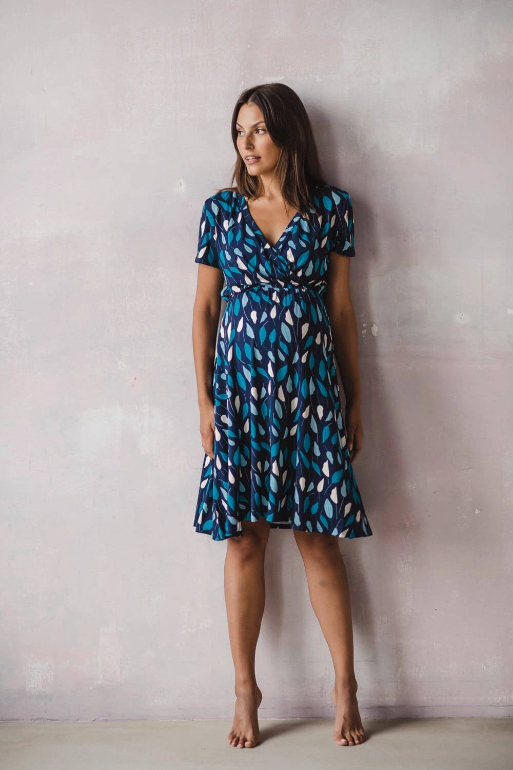 Two Ways MIDI Umstands- und Stillkleid, kurze Ärmel – Marineblaue Blätter