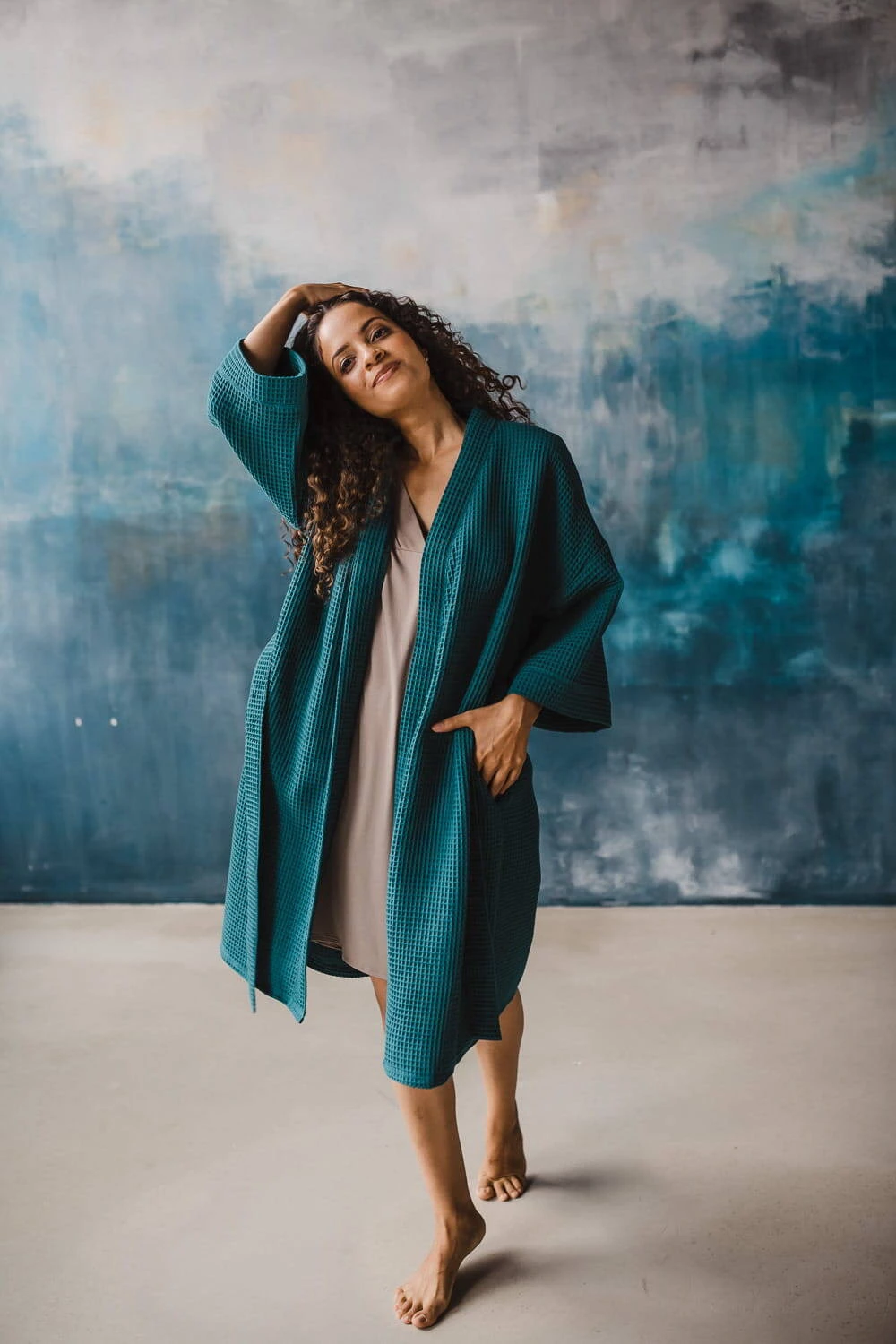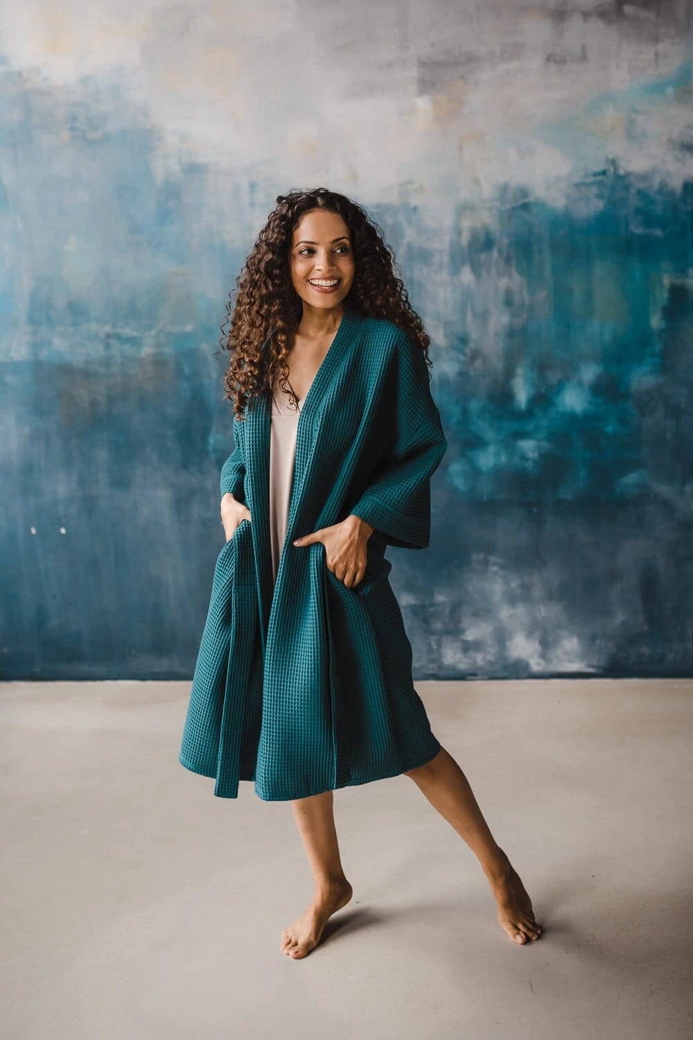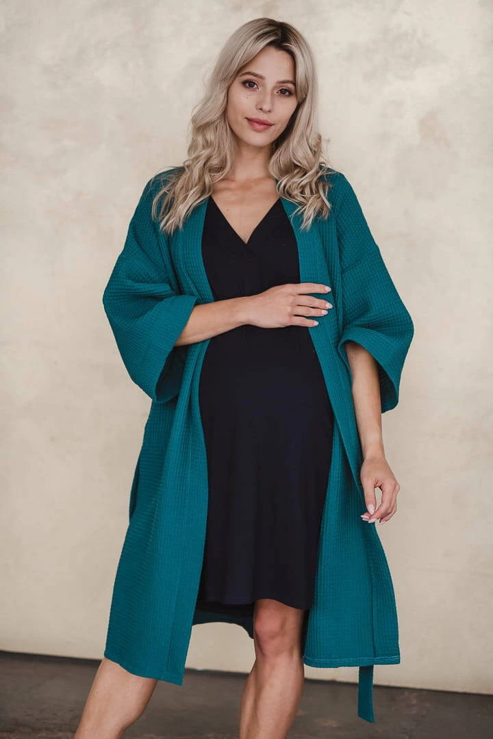 Warmer Kimono-Umstandsbademantel mit Waffelmuster aus Baumwolle – Dunkelseegrün