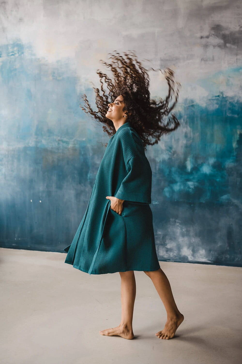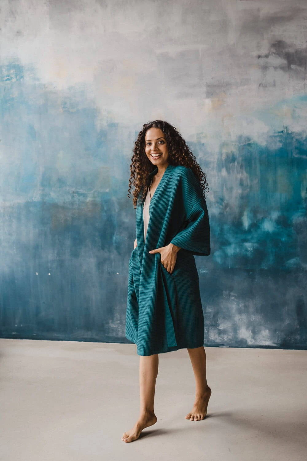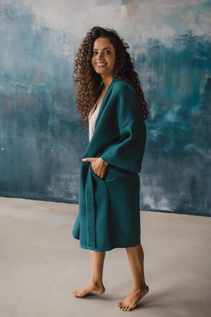Warmer Kimono-Umstandsbademantel mit Waffelmuster aus Baumwolle – Dunkelseegrün