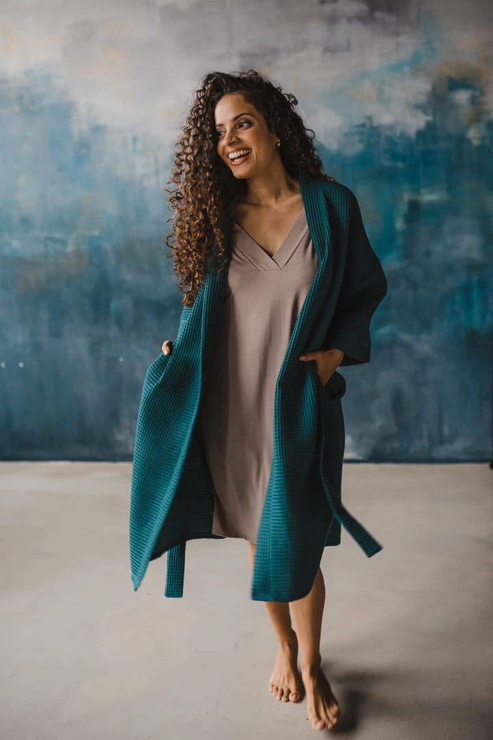 Die bequemen und stilvollen Umstandsbademäntel der Formommy-Kollektion wurden speziell für zukünftige Mütter entworfen und vereinen Funktionalität, Stil und schönes Aussehen. Die einzigartige Waffelbindung des Stoffes verleiht dem Bademantel ein einzigartiges Aussehen und schmiegt sich gleichzeitig sanft an den Körper an, was für Komfort und Bewegungsfreiheit sorgt. Die einzigartige Farbe verleiht diesem bequemen Bademantel Tiefe und femininen Charme.