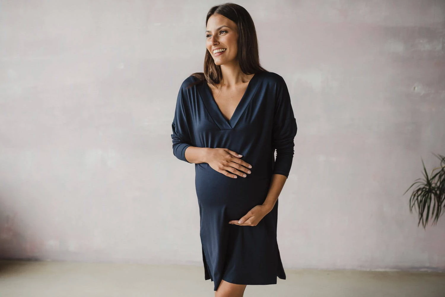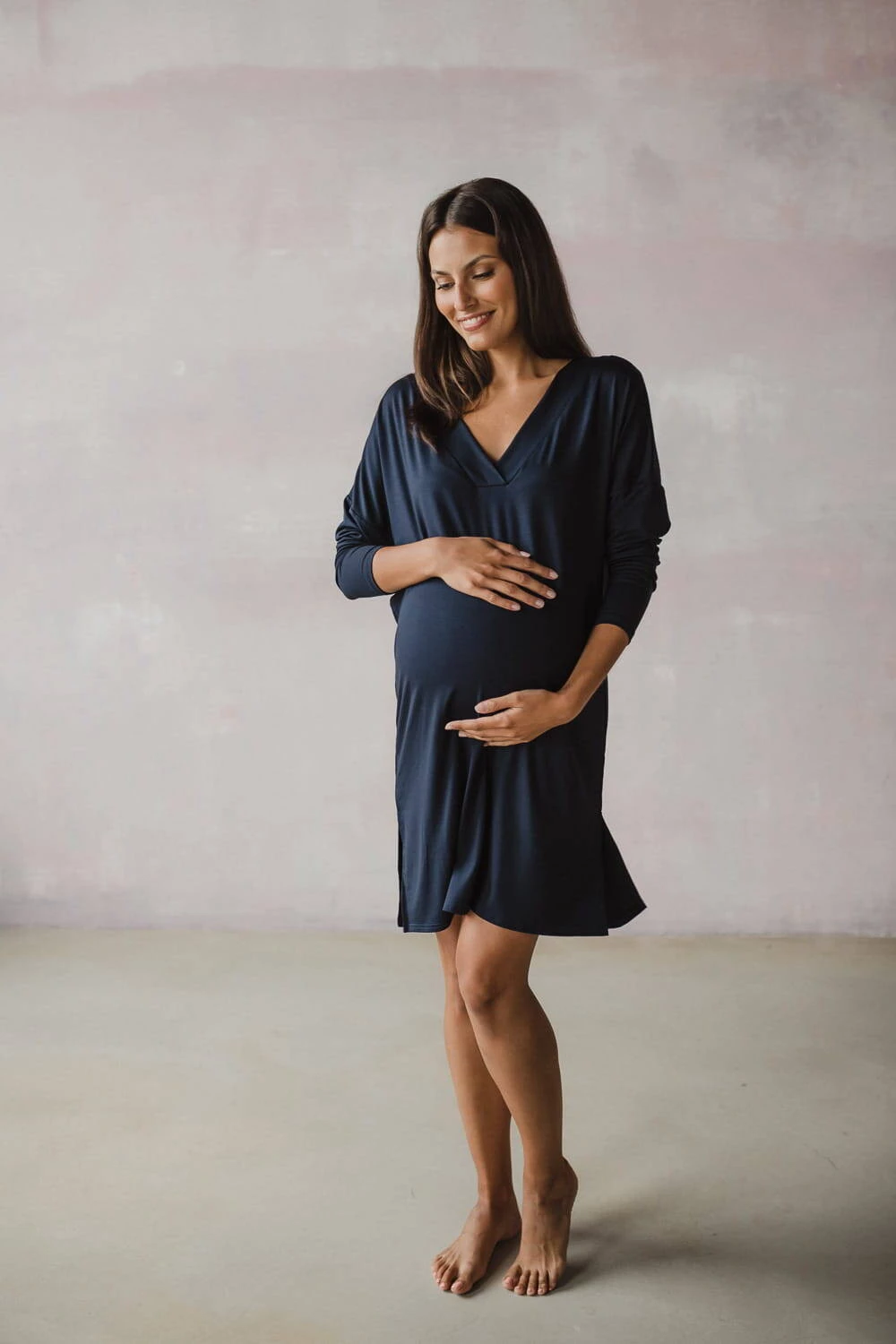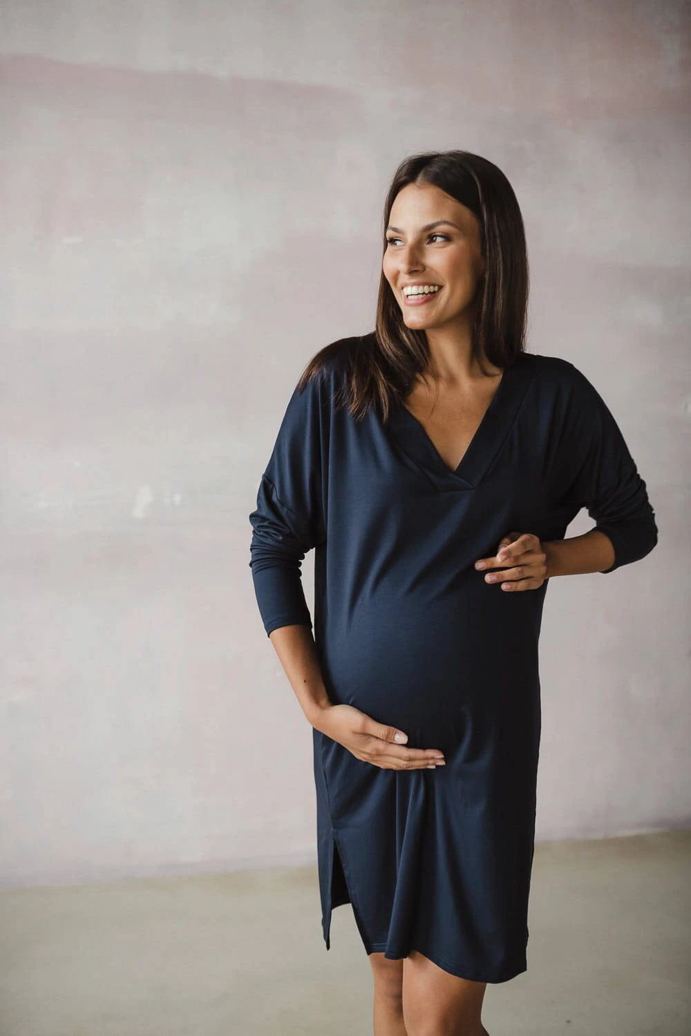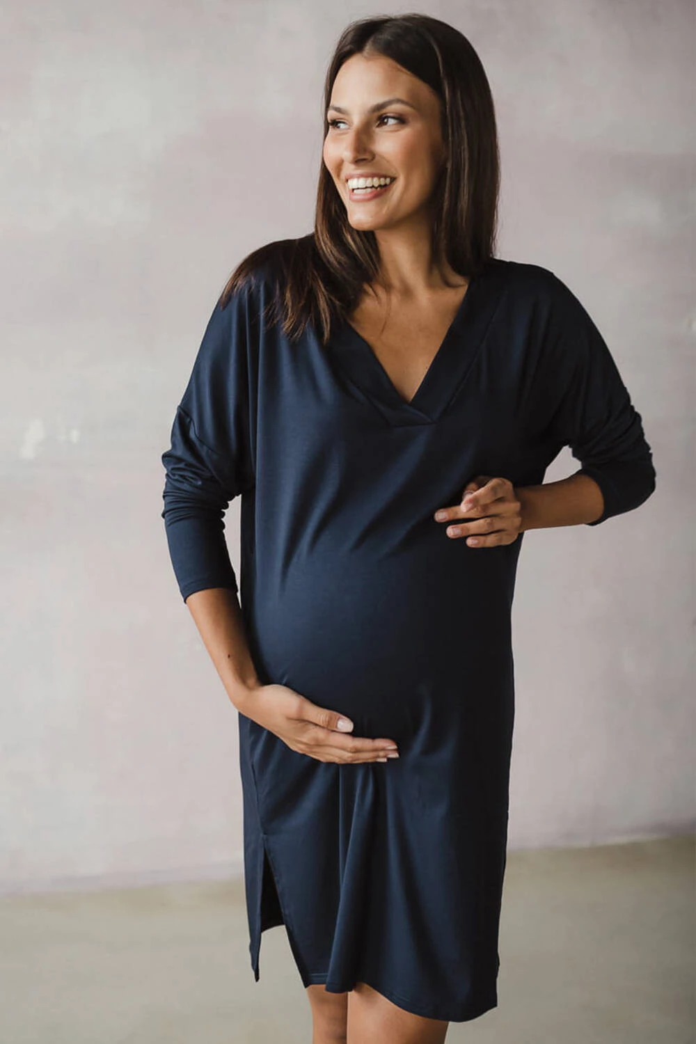 Die Länge des Nachthemdes ist sorgfältig angepasst, um Komfort und Bewegungsfreiheit sowohl bei nächtlichen Spaziergängen durch Krankenhausflure als auch beim Füttern eines Neugeborenen zu gewährleisten. Der verstärkte V-Ausschnitt ist eine praktische Lösung, die das Füttern Ihres Babys erleichtert – Sie können Ihr Baby schnell und diskret füttern und dabei absolute Privatsphäre wahren. Der Oversize-Schnitt des marineblauen Hemdes wird den Erwartungen jeder werdenden Mutter gerecht. Ein Umstandsshirt für Damen ist nicht nur bequeme Nachtwäsche, die Platz für einen wachsenden Bauch bietet, sondern auch eine tolle Lösung, die ein schönes Aussehen nach der Geburt garantiert, unabhängig von Figurveränderungen. Das perfekte Moon-Nachthemd besteht aus Bambusviskose höchster Qualität und wurde strengen Tests unterzogen, um maximalen Komfort und Sicherheit für Sie und Ihr Kind zu gewährleisten.