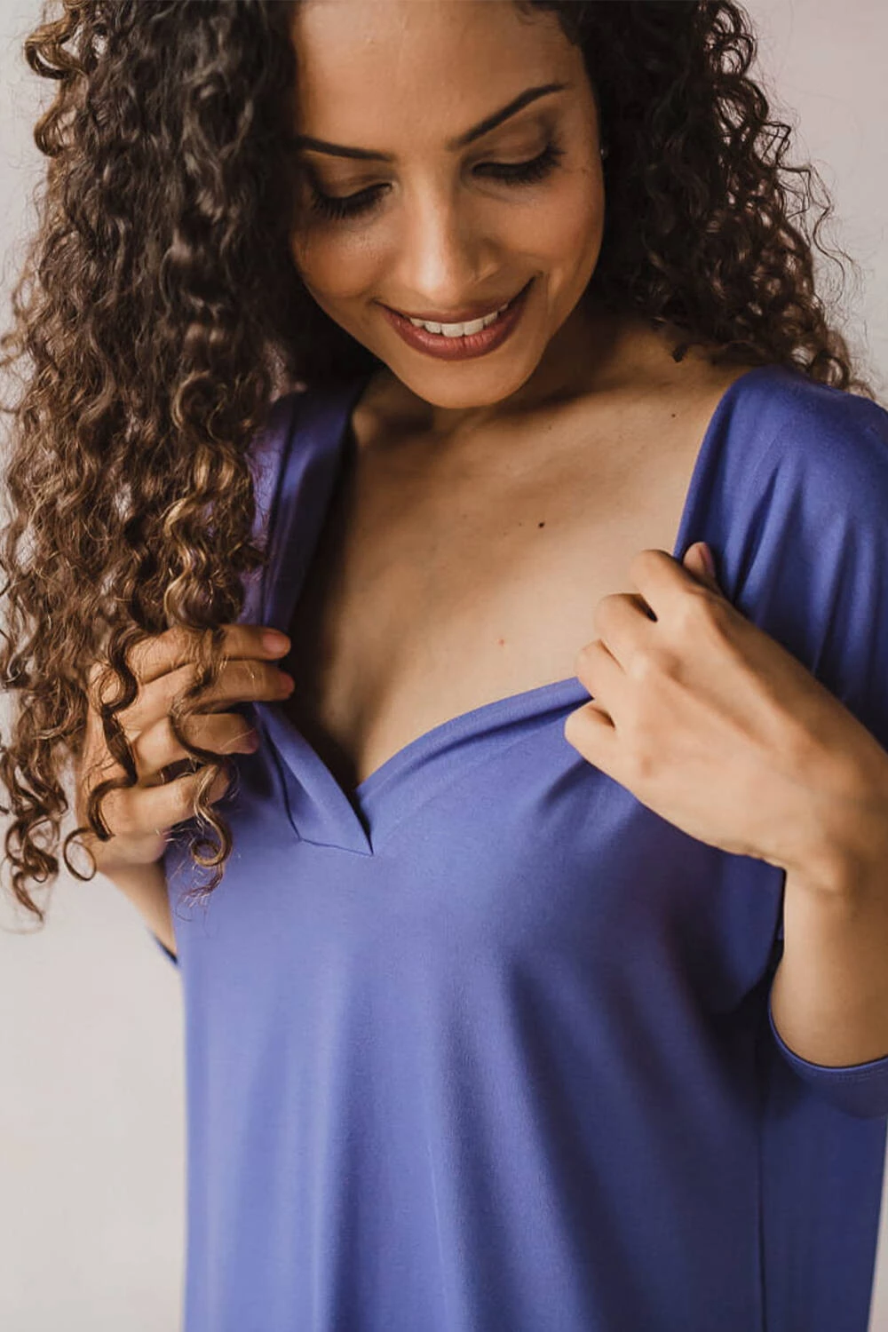 Wählen Sie intensives Lila für unser Umstands- und Stillnachthemd, das auf maximalen Komfort und Bequemlichkeit ausgelegt ist. Seien Sie bereit für magische Momente der Nähe zu Ihrem Baby, eingehüllt in das Vergnügen, unser einzigartiges Bambus-Shirt zu tragen.