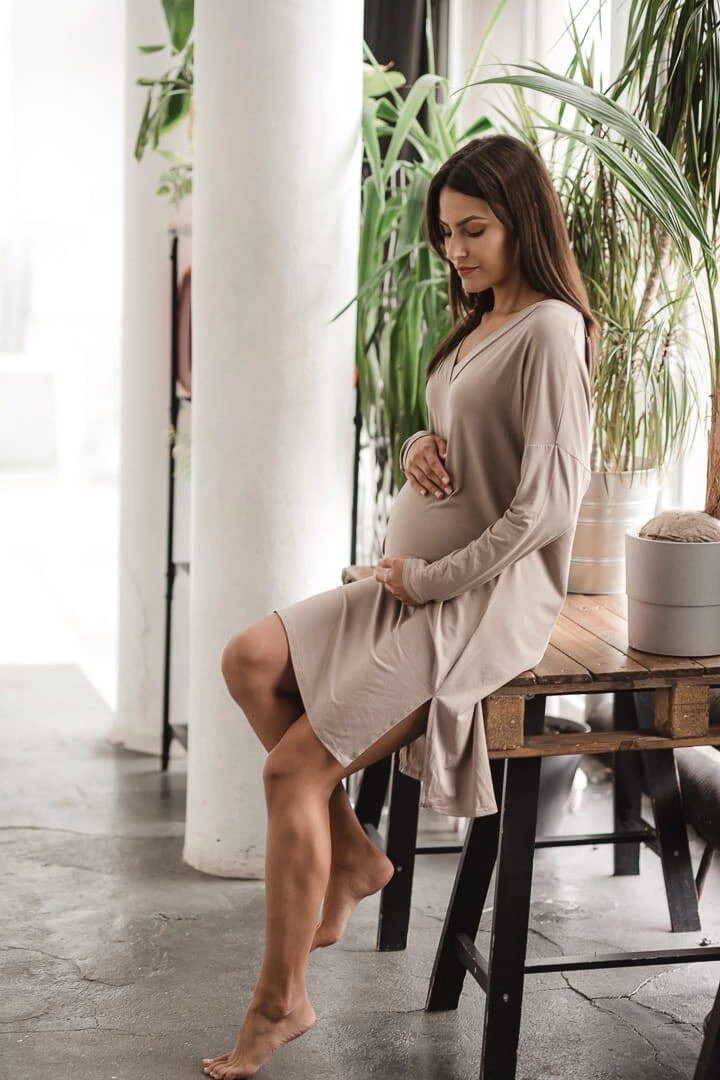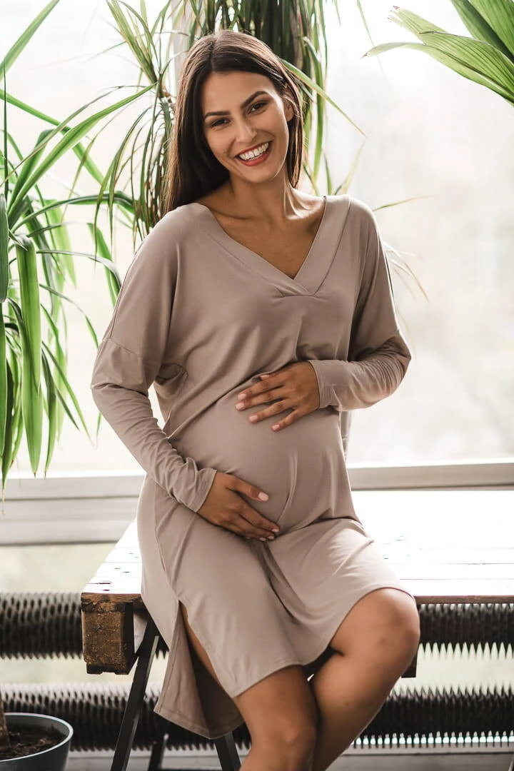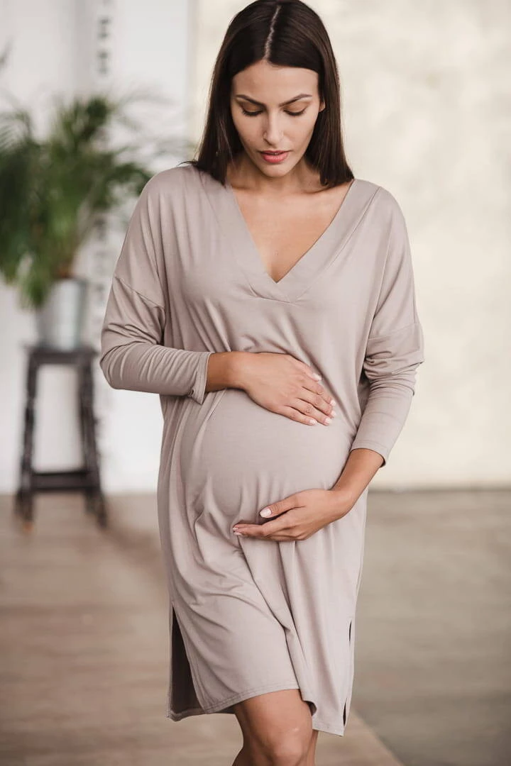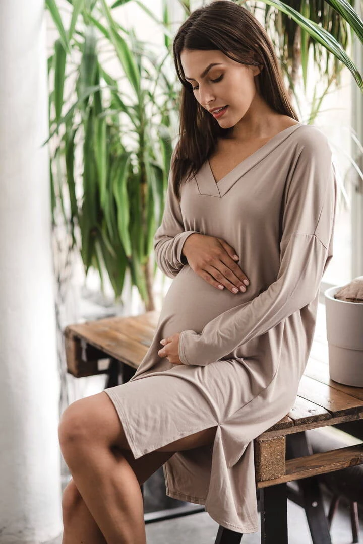Der Oversize-Schnitt des beigen Hemdes wird jede werdende Mutter zufrieden stellen. Ein Umstandskleid ist eine bequeme Nachtwäsche, die nicht nur Ihrem wachsenden Schwangerschaftsbauch Platz bietet, sondern auch dafür sorgt, dass Sie nach der Geburt gut aussehen, unabhängig von Ihrer sich verändernden Figur. Das aus Bambusviskose höchster Qualität gefertigte Umstandsshirt Moon hat alle Tests bestanden, um Ihnen maximalen Komfort und Sicherheit zu bieten.