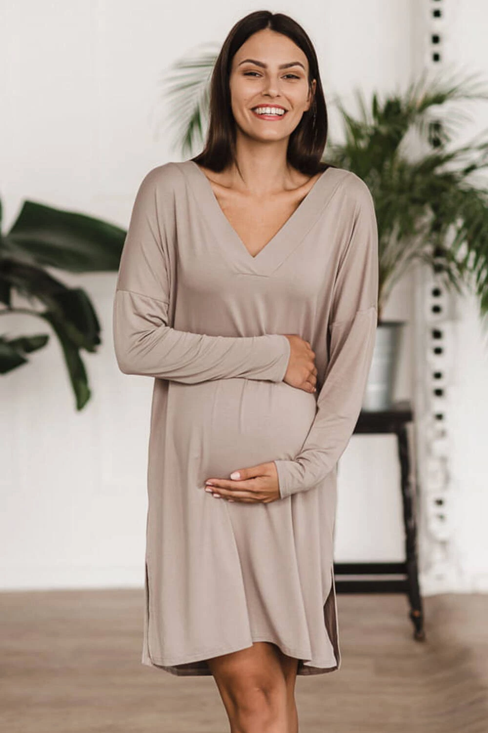 Umstands- und Stillnachthemd aus Bambus mit langen Ärmeln, Mondbeige
