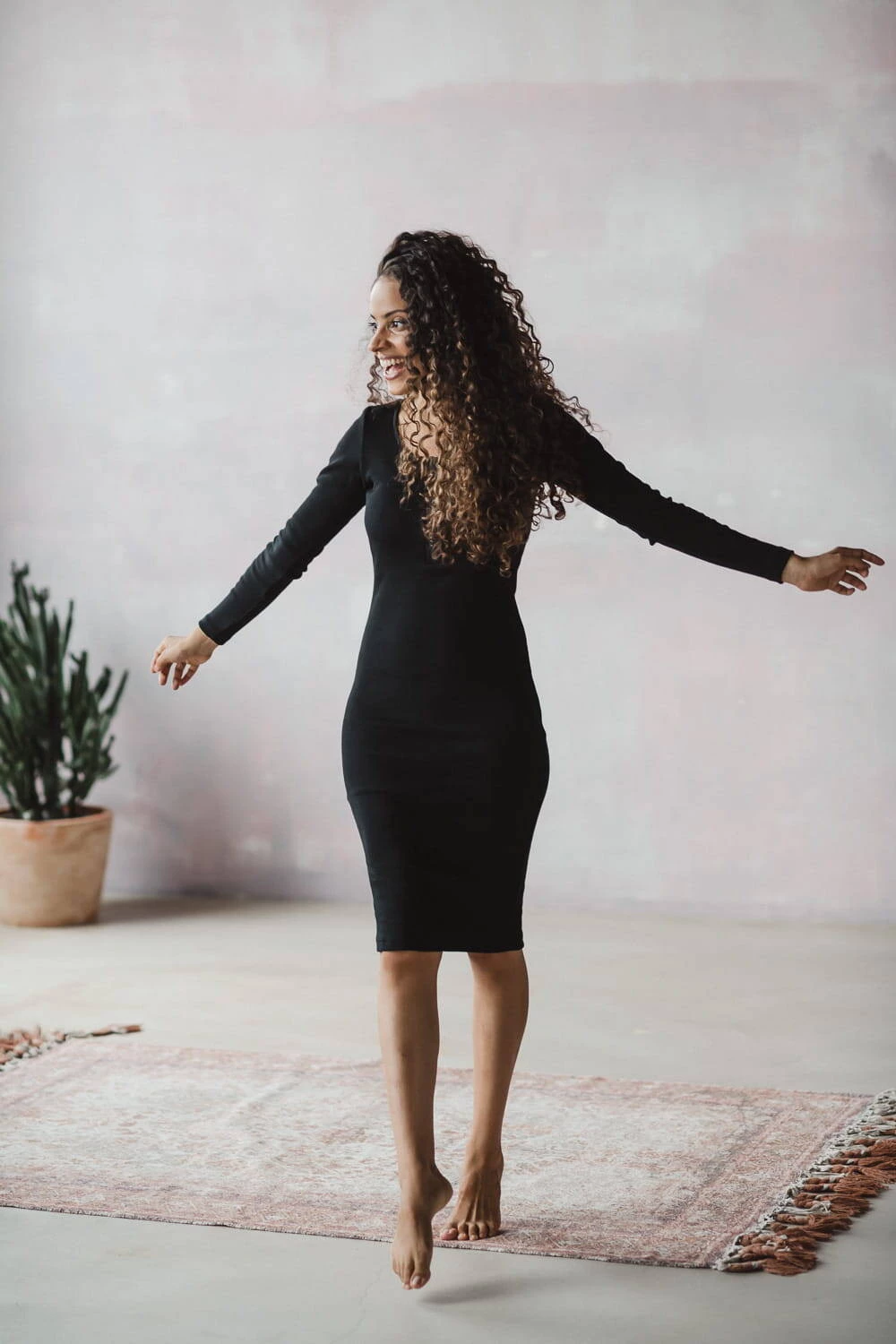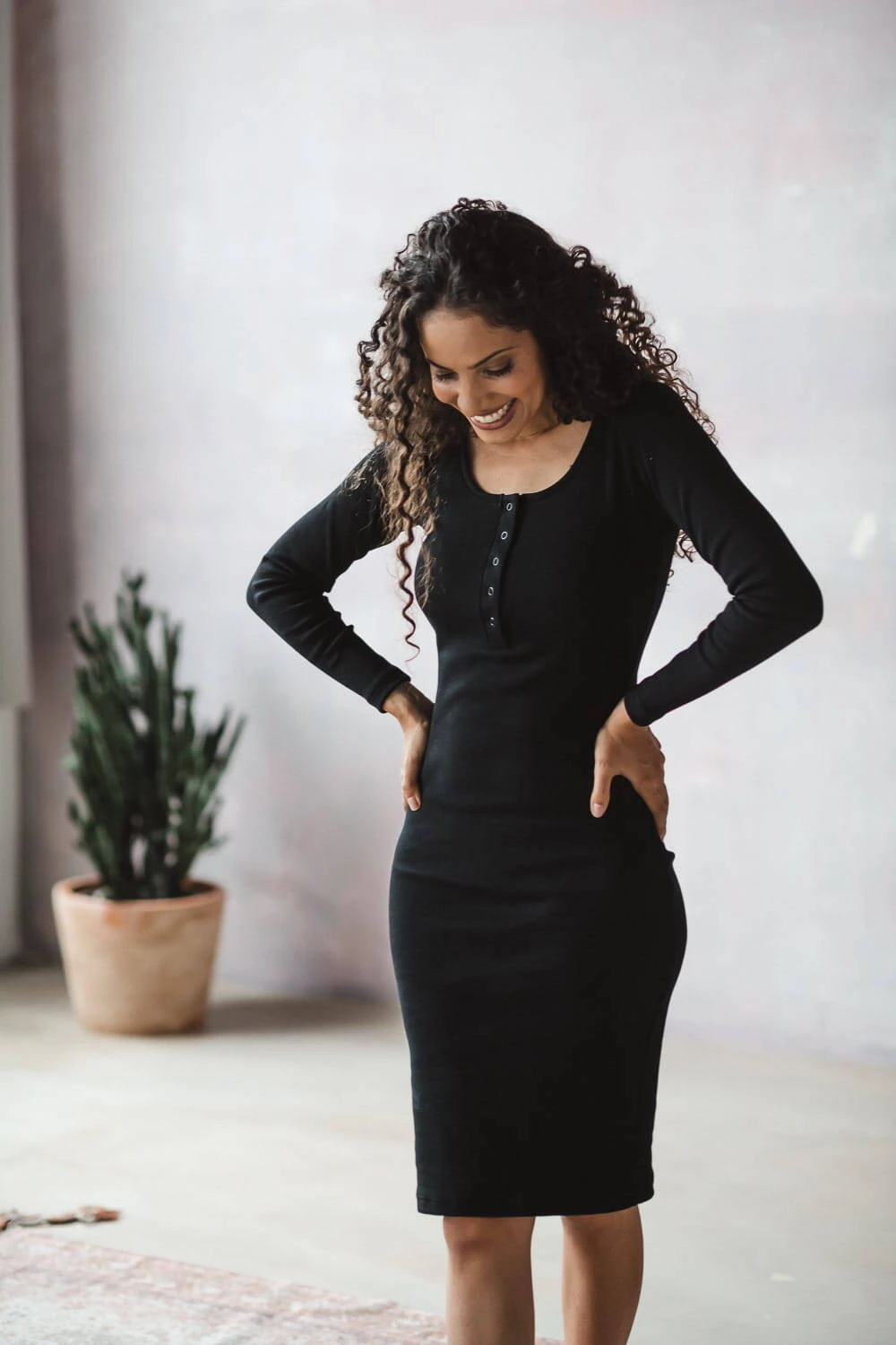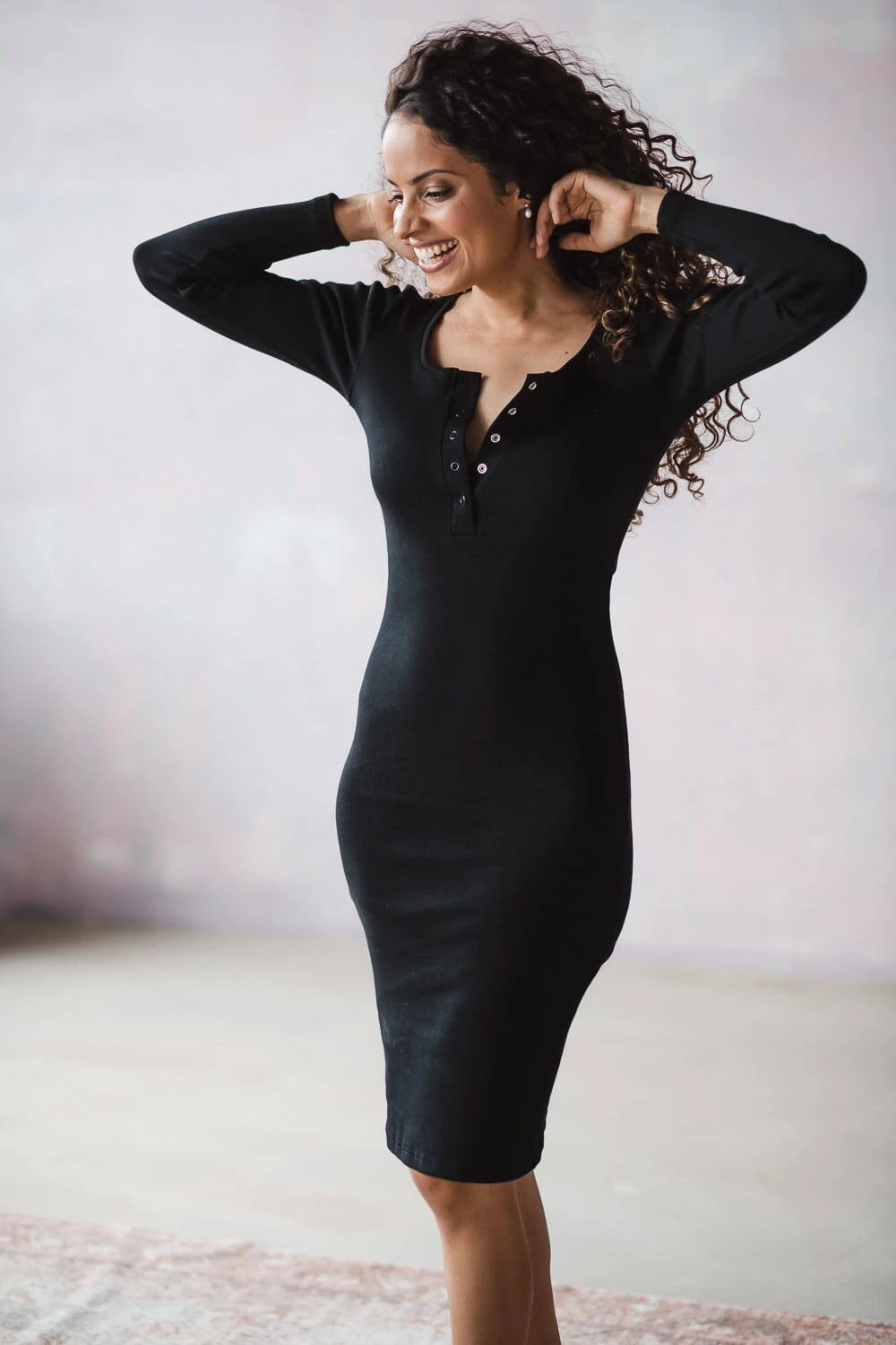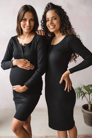Das Stillkleid aus der Umstandsmode-Kollektion von Formommy besteht aus geripptem Stoff in praktischer schwarzer Farbe. Diese Umstandsmode für frischgebackene Mütter vereint Komfort und femininen Stil. Dank der Verwendung hochwertiger Materialien, die ihre ursprüngliche Form behalten und für ein angenehmes Tragegefühl sorgen, werden Sie unsere Umstandskleider und Kleider für stillende Mütter lange begleiten. Dieses Basic-Kleid für Mütter zeichnet sich durch einen taillierten Schnitt und goldene Druckknöpfe am Ausschnitt aus, die ein freies und diskretes Stillen ermöglichen. Bequeme Umstandskleider, die auch nach der Schwangerschaft getragen werden können, eignen sich sowohl für die ersten als auch für die weiteren Monate nach der Geburt.