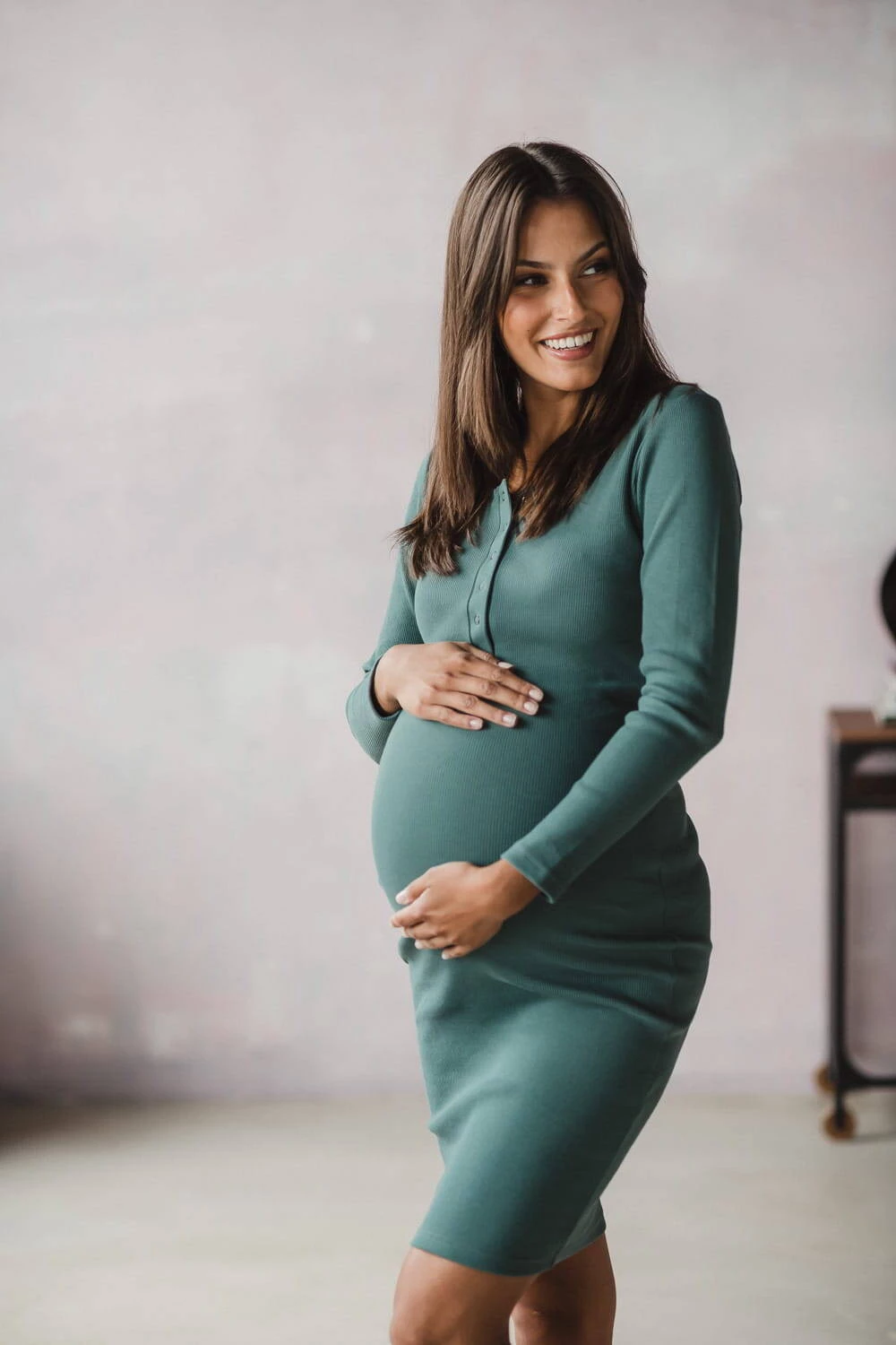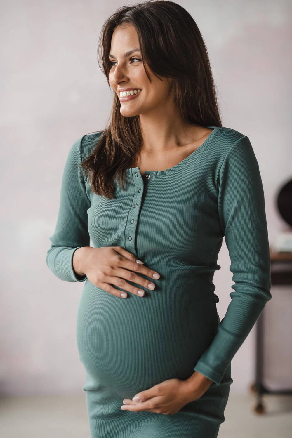 Das Umstands-Stillkleid aus der Umstandsmode-Kollektion von Formommy besteht aus geripptem Stoff in einem wunderschönen Mintton. Diese Umstandsmode ist äußerst bequem und feminin. Dank hochwertigem Material, das sich nicht verformt und für Tragekomfort sorgt, bleiben Ihnen unsere Umstandsmode und Kleider für stillende Mütter lange erhalten. Das perfekte Basic-Kleid für Mütter hat einen taillierten Schnitt und Druckknöpfe am Ausschnitt, was ein freies und diskretes Stillen ermöglicht. Bequeme Umstands-/Stillkleider sind ab dem ersten Trimester perfekt, Sie können sie auch nach der Schwangerschaft wie traditionelle gerade Kleider tragen.