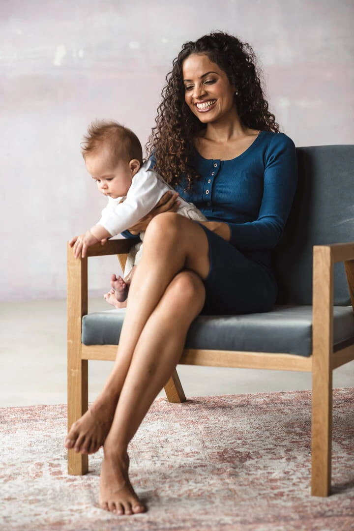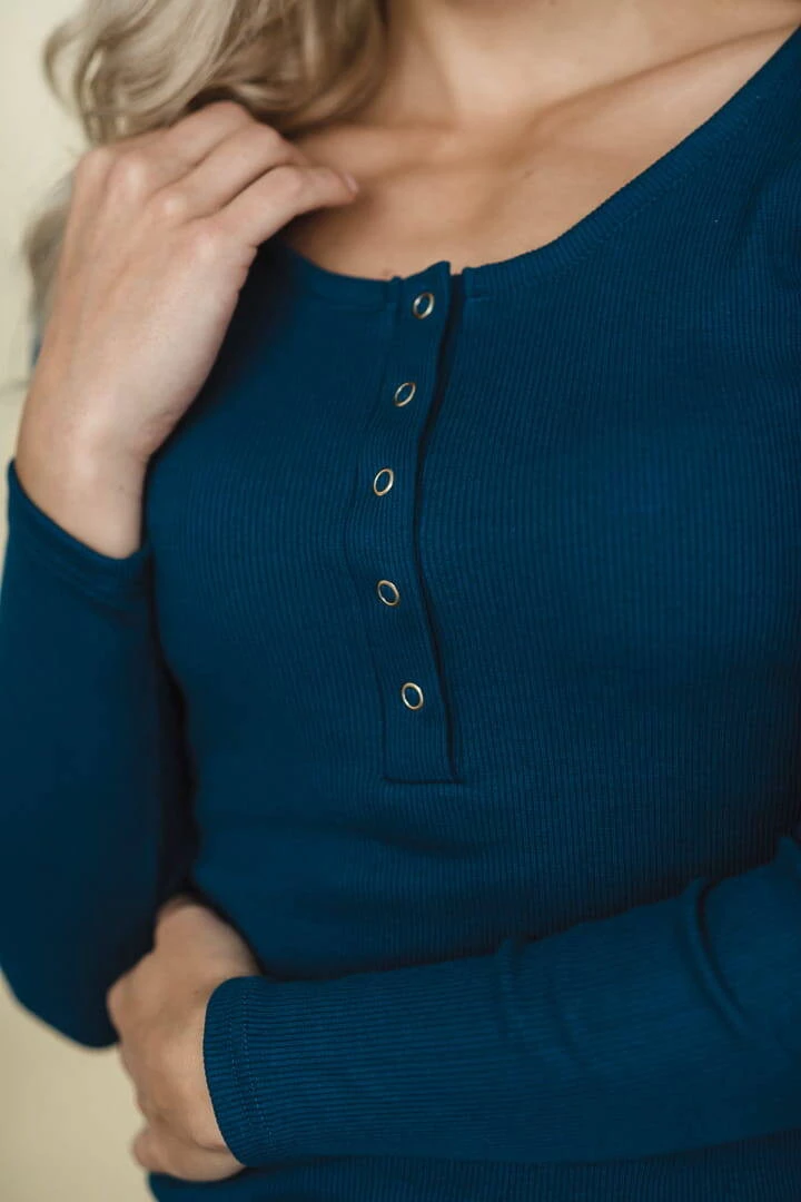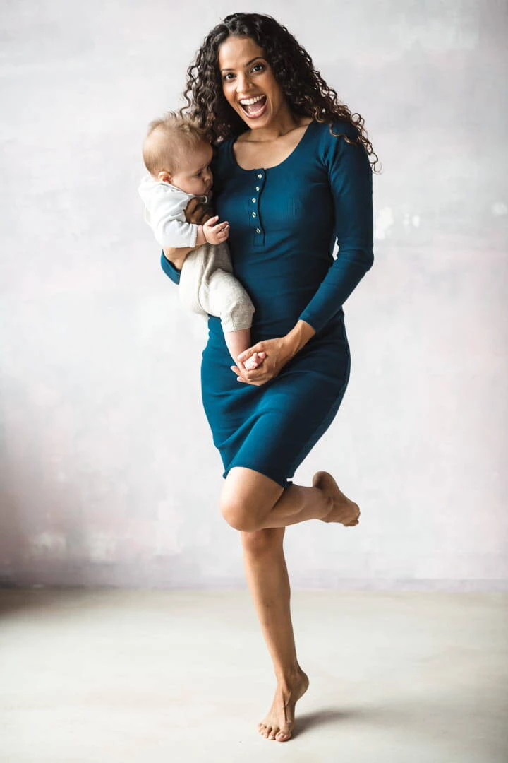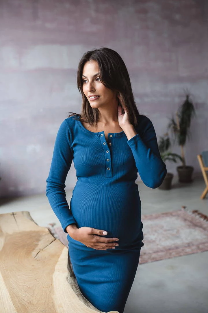 Das Umstands- und Stillkleid aus der Umstandsmode-Kollektion von Formommy besteht aus geripptem Stoff in einem wunderschönen Blauton. Diese Umstandsmode ist äußerst bequem und feminin. Dank hochwertigem Material, das sich nicht verformt und für Tragekomfort sorgt, bleiben Ihnen unsere Umstandsmode und Kleider für stillende Mütter lange erhalten. Das perfekte Basic-Umstandskleid hat einen taillierten Schnitt und Druckknöpfe am Ausschnitt, was ein freies und diskretes Stillen ermöglicht. Bequeme Umstands-/Stillkleider sind ab dem ersten Trimester perfekt, Sie können sie auch nach der Schwangerschaft wie traditionelle gerade Kleider tragen.