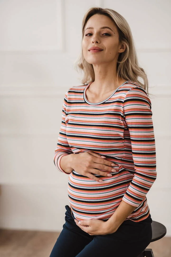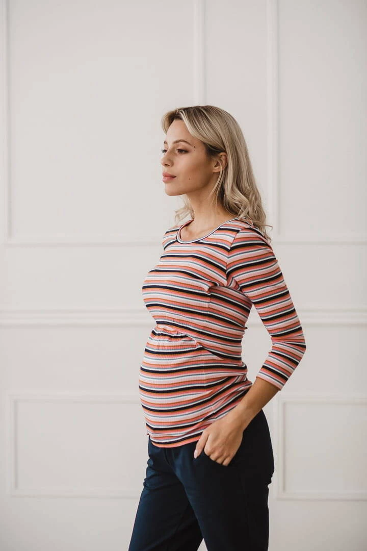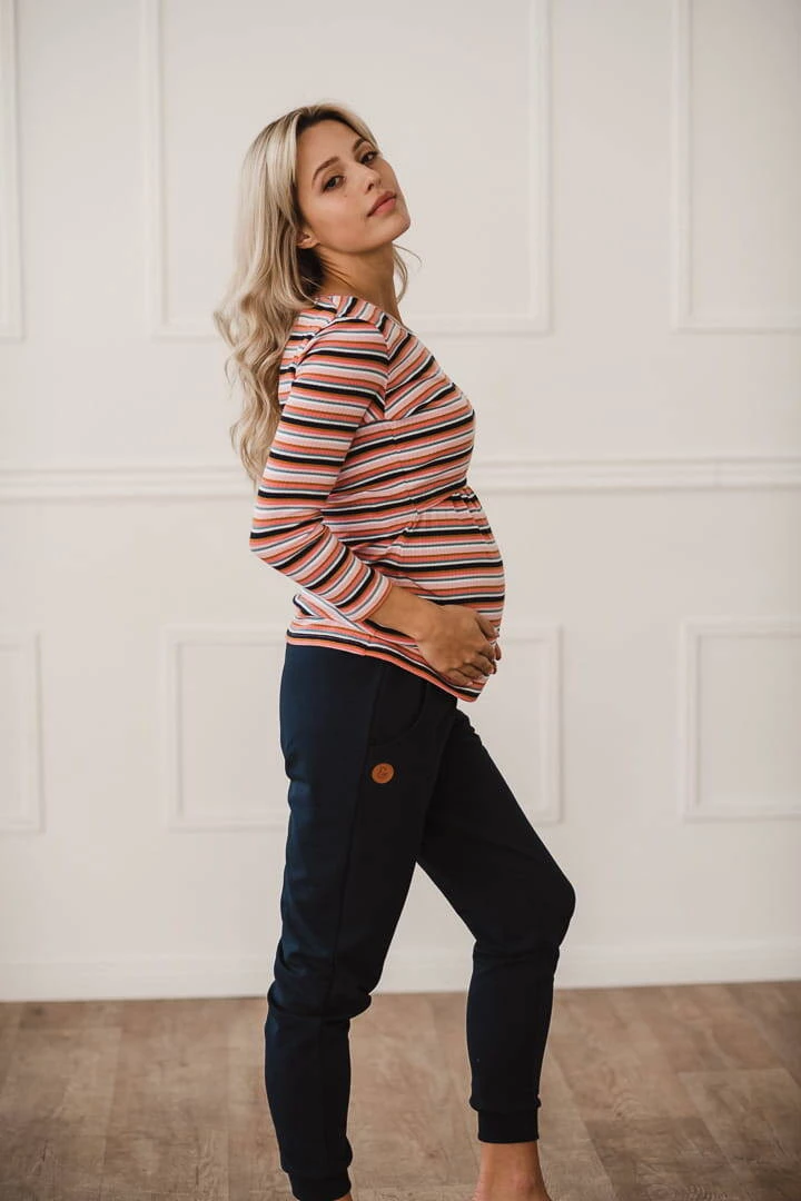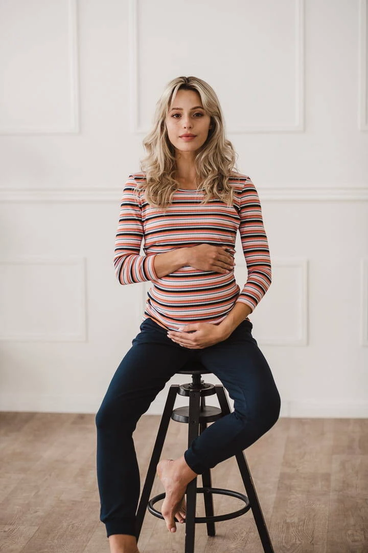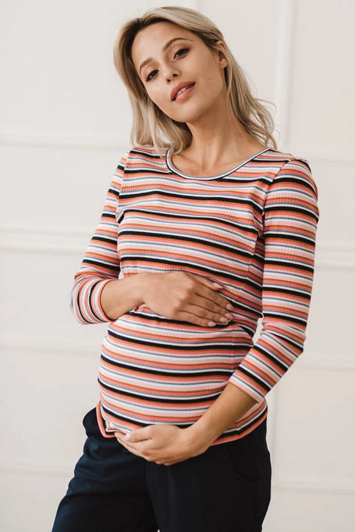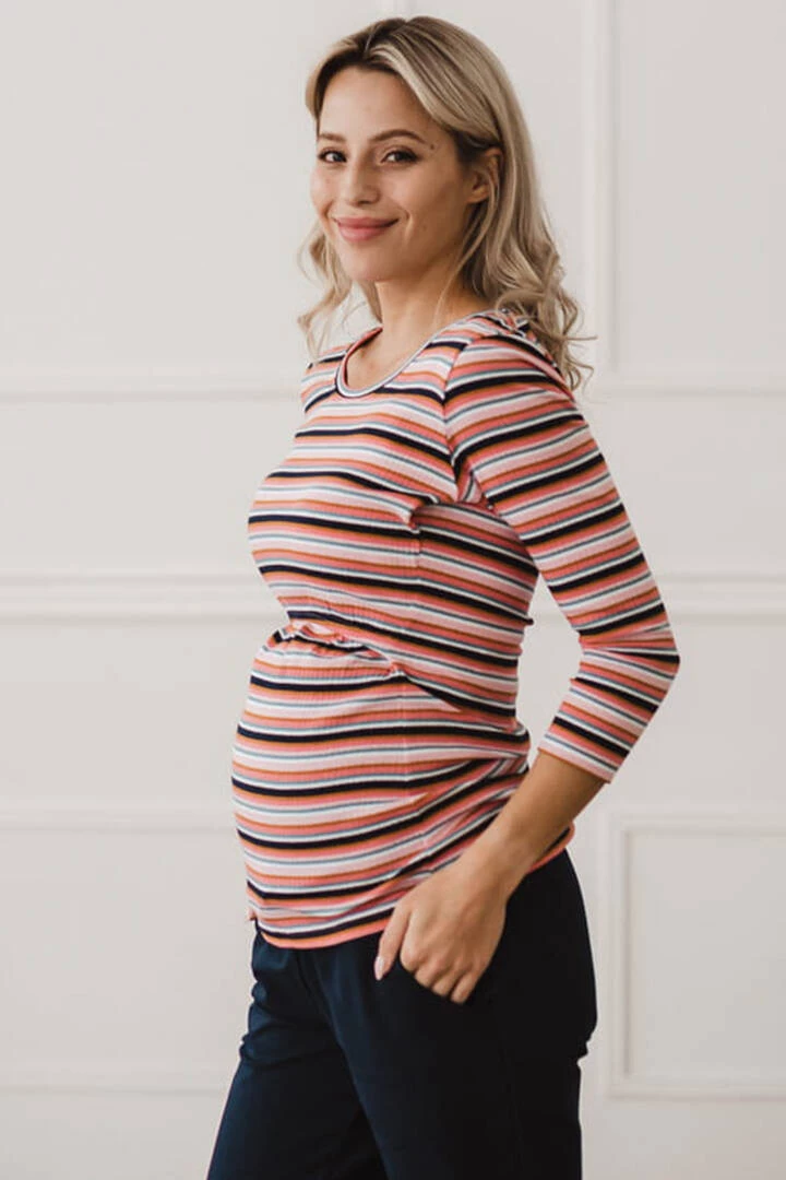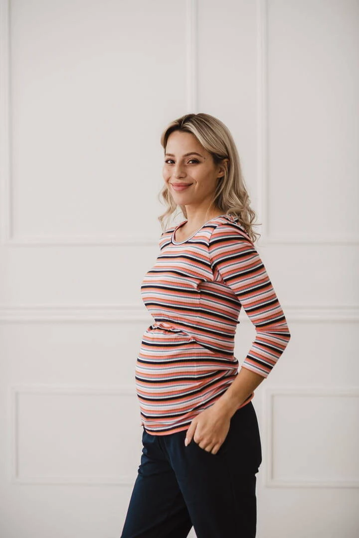 Eine universelle gestreifte Umstandsbluse mit 7/8-Ärmeln ist das perfekte Outfit für jeden Anlass ab Beginn der Schwangerschaft. Umstandsblusen für Damen haben Falten auf beiden Seiten des Bauches , die sich an den wachsenden Bauch und den sich verändernden Körper anpassen. Am Oberteil der perfekten Umstandsbluse ist ein spezielles, nach oben klappbares Panel eingenäht, mit dem Sie Ihr Neugeborenes einfach und schnell füttern können. Umstands- und Stillblusen bieten Ihnen Bequemlichkeit und Komfort während der Schwangerschaft und später in der Stillzeit. Der Komfort der werdenden Mutter ist sehr wichtig, daher lohnt es sich, in Kleidung zu investieren, die ihn gewährleistet. Wählen Sie farbenfrohe Blusen für schwangere Frauen und erleben Sie, wie bequem Umstandsblusen sein können, wenn Ihr Körper wieder zu seiner Figur vor der Schwangerschaft zurückkehrt.