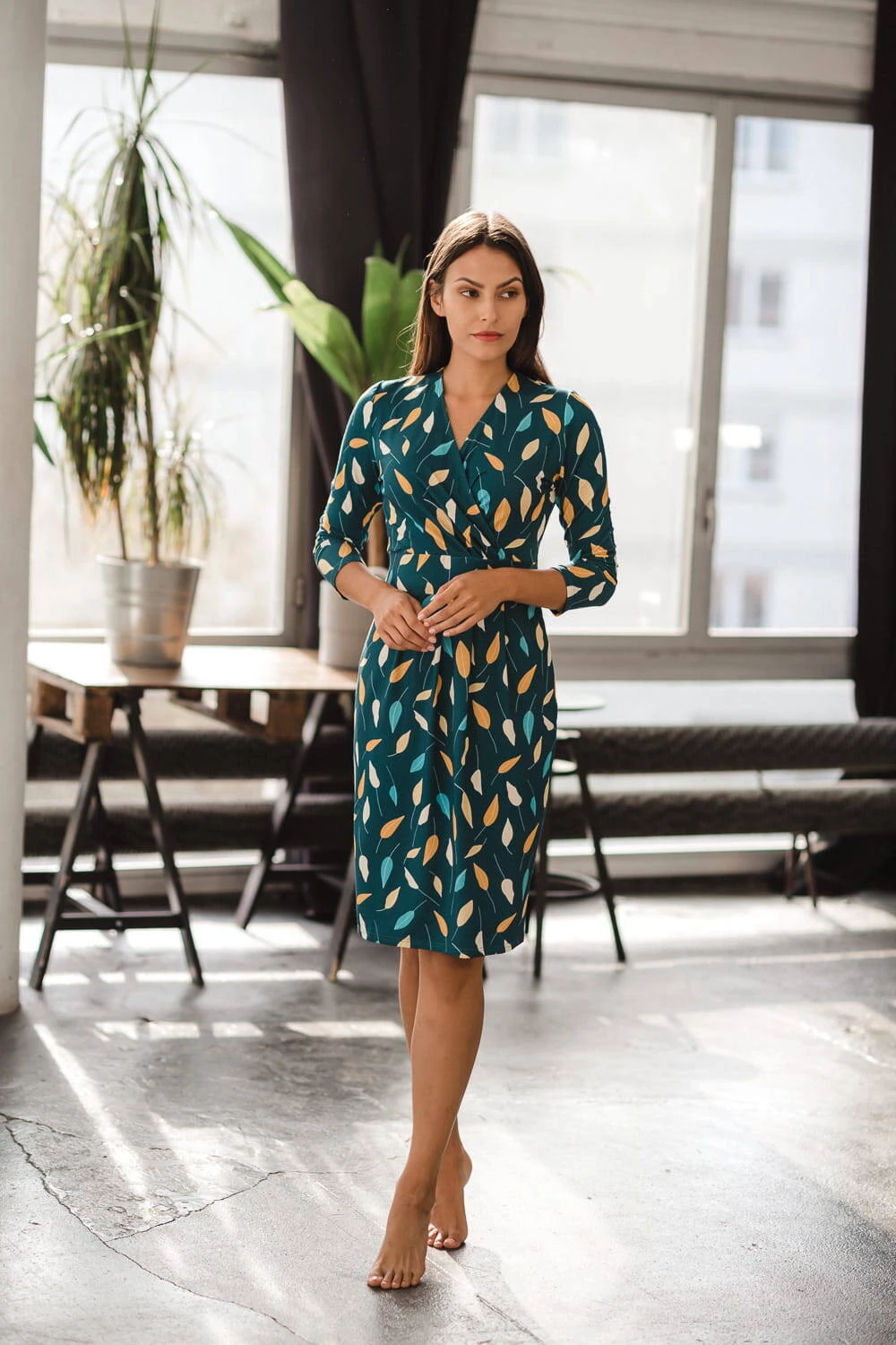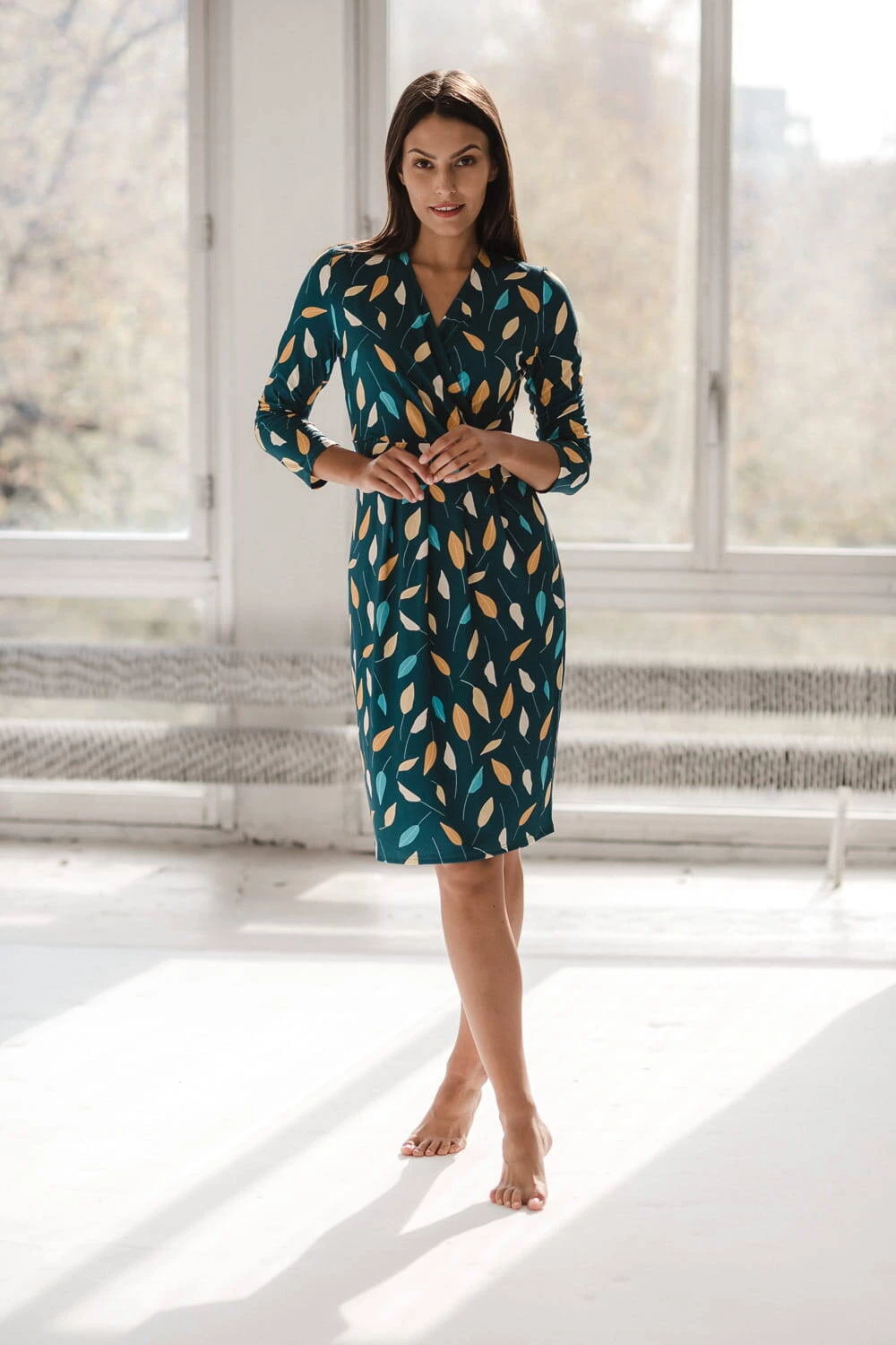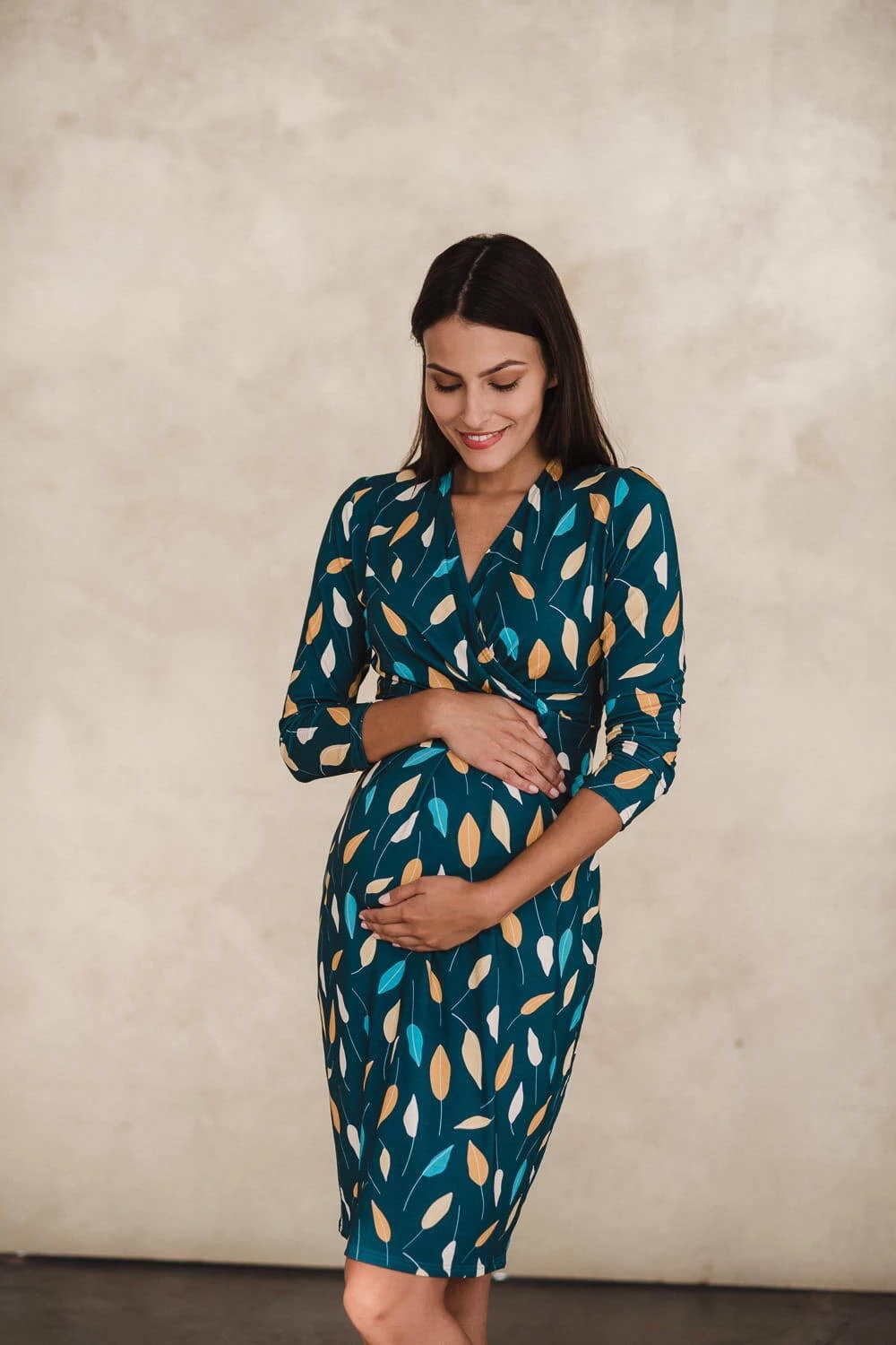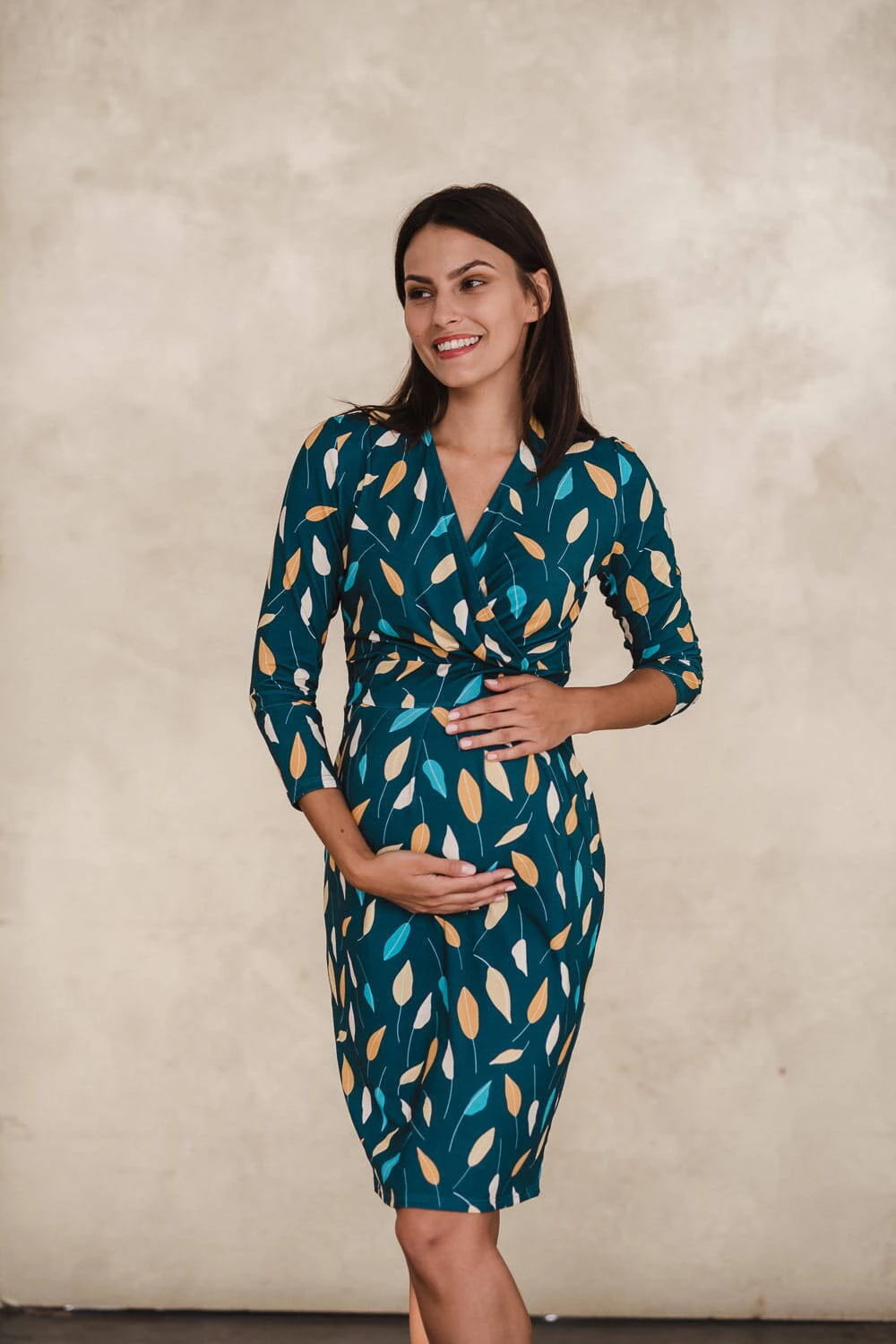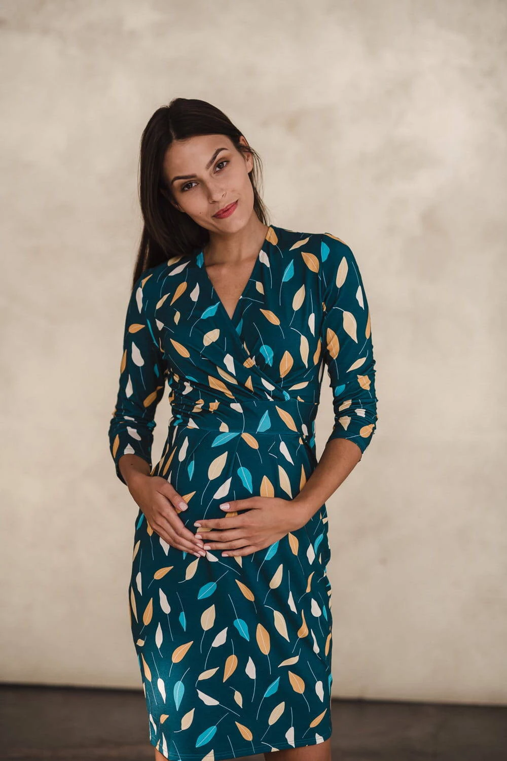 Ein einzigartiges Kleid für zukünftige Mütter, perfekt während der Schwangerschaft. Zarte Blätter auf türkisfarbenem Hintergrund sind eine geniale Idee für Frauen, die gerne stilvoll aussehen und wissen, wie wichtig der Komfort der werdenden Mutter ist. Für die Herstellung dieses Kleides für schwangere Frauen wurde polnische Strickware höchster Qualität verwendet, die die strengen Öko-Tex-Standard-100-Tests bestanden hat. Dank ihnen ist das alltägliche Umstandskleid/Stillkleid nicht nur weich und angenehm im Griff, sondern auch langlebig . Hochwertiges Material behält seinen Druck und seine Farbe auch nach vielen Wäschen. Das perfekte Kleid, eines von vielen in unserer Umstandsmode-Kollektion, steht nicht nur für Eleganz, sondern auch für Funktionalität. Der Komfort der werdenden Mutter ist sehr wichtig. Deshalb wurde dieses einzigartige Umstandskleid so konzipiert, dass es mit Ihrem Schwangerschaftsbauch mitwächst und sich seiner sich verändernden Form anpasst. Umstandsmode mit bequemem Umschlagausschnitt sorgt für bequemes und diskretes Stillen. Durch die 7/8-Ärmellänge eignet sich unser Schwangerschaftskleid perfekt für verschiedene Anlässe, sowohl an Frühlingstagen als auch an regnerischen Herbsttagen. Dieses einzigartige Kleid wurde im Einklang mit der Idee der Slow Fashion entworfen , sodass dieses Modell viele Jahre lang, auch nach der Schwangerschaft, getragen werden kann, was es nicht zu einer Ausgabe, sondern zu einer Investition in die Zukunft macht.