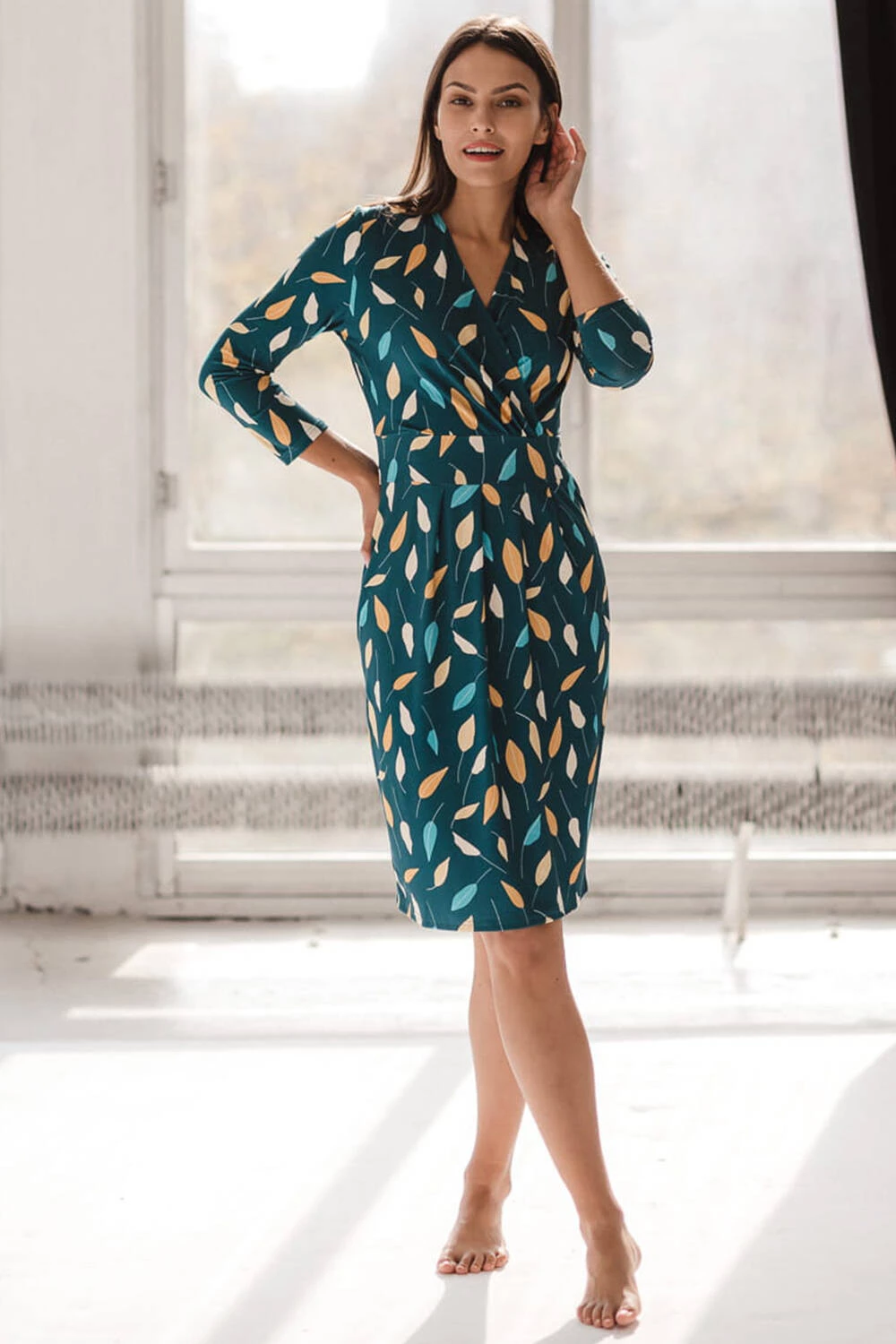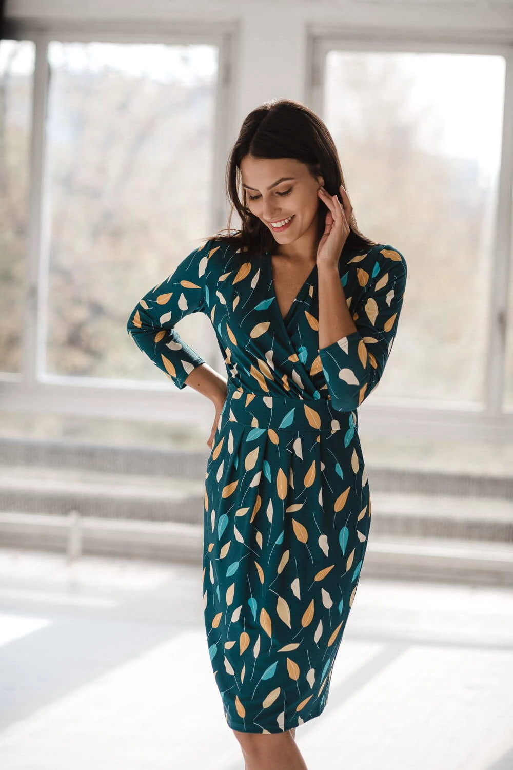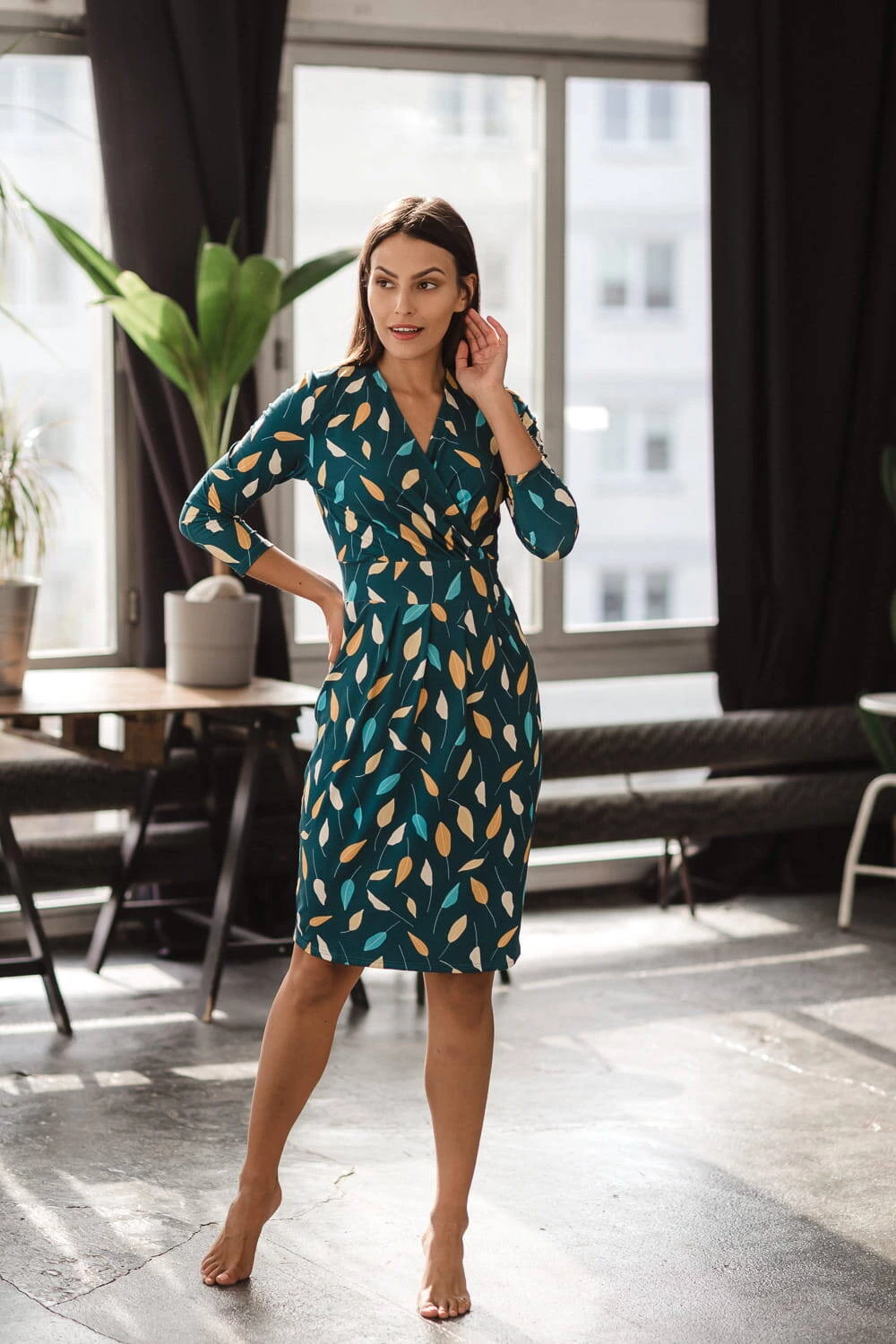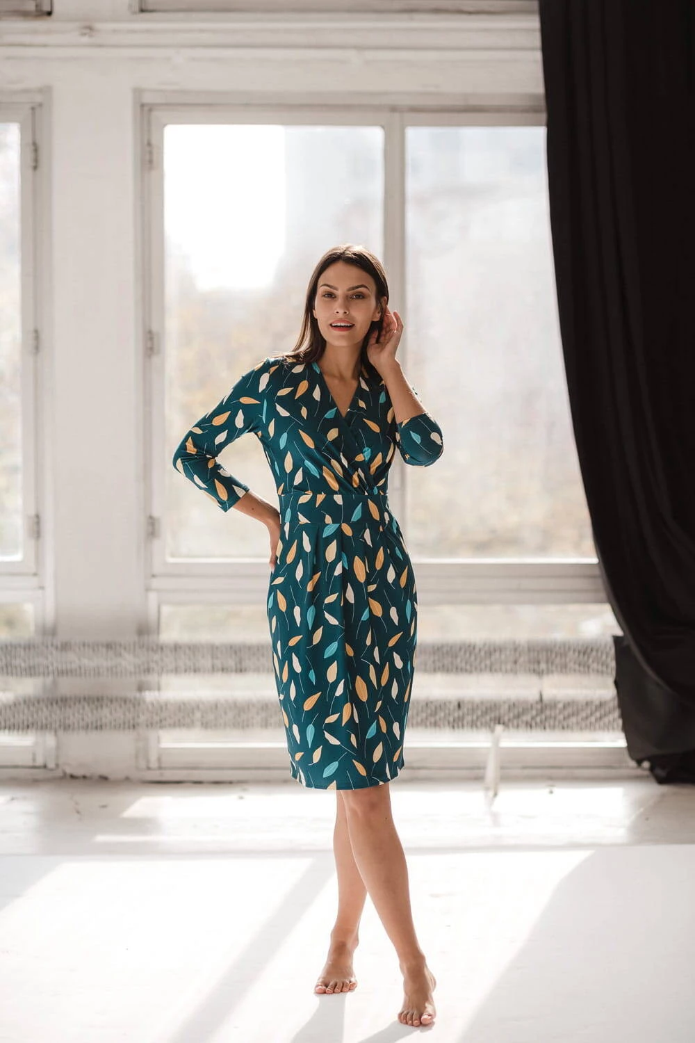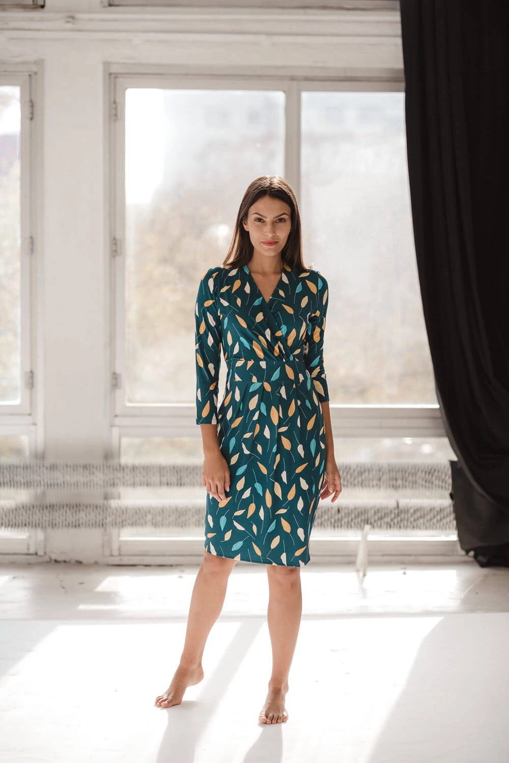 Ein einzigartiges Kleid für zukünftige Mütter, perfekt während der Schwangerschaft. Zarte Blätter auf türkisfarbenem Hintergrund sind eine geniale Idee für Frauen, die gerne stilvoll aussehen und wissen, wie wichtig der Komfort der werdenden Mutter ist. Für die Herstellung dieses Kleides für schwangere Frauen wurde polnische Strickware höchster Qualität verwendet, die die strengen Öko-Tex-Standard-100-Tests bestanden hat. Dank ihnen ist das alltägliche Umstandskleid/Stillkleid nicht nur weich und angenehm im Griff, sondern auch langlebig . Hochwertiges Material behält seinen Druck und seine Farbe auch nach vielen Wäschen. Das perfekte Kleid, eines von vielen in unserer Umstandsmode-Kollektion, steht nicht nur für Eleganz, sondern auch für Funktionalität. Der Komfort der werdenden Mutter ist sehr wichtig. Deshalb wurde dieses einzigartige Umstandskleid so konzipiert, dass es mit Ihrem Schwangerschaftsbauch mitwächst und sich seiner sich verändernden Form anpasst. Umstandsmode mit bequemem Umschlagausschnitt sorgt für bequemes und diskretes Stillen. Durch die 7/8-Ärmellänge eignet sich unser Schwangerschaftskleid perfekt für verschiedene Anlässe, sowohl an Frühlingstagen als auch an regnerischen Herbsttagen. Dieses einzigartige Kleid wurde im Einklang mit der Idee der Slow Fashion entworfen , sodass dieses Modell viele Jahre lang, auch nach der Schwangerschaft, getragen werden kann, was es nicht zu einer Ausgabe, sondern zu einer Investition in die Zukunft macht.