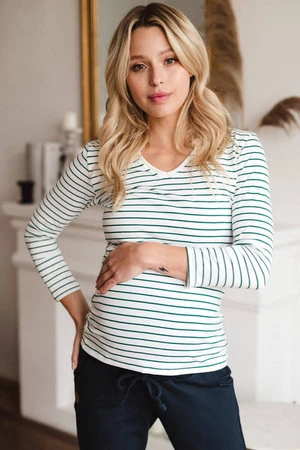 Bei der Suche nach der perfekten Umstandsbluse für stillende Mütter lohnt es sich, auf Eigenschaften zu achten, die Komfort und Bewegungsfreiheit während der gesamten Schwangerschaft und nach der Geburt gewährleisten. Eine weiße Umstandsbluse für Schwangere mit 7/8- Ärmeln und bezaubernden grünen Streifen zeichnet sich nicht nur durch Funktionalität, sondern auch durch hohe Verarbeitungsqualität und innovative Lösungen rund ums Stillen aus. Erfahren Sie mehr über stilvolle Umstandsblusen mit längeren Ärmeln, die dank flexibler Materialien der werdenden Mutter Komfort bieten und sich sicher an den sich verändernden, wachsenden Schwangerschaftsbauch und damit auch an die Figur der Frau, die sich nach der Schwangerschaft erholt, schmiegen!