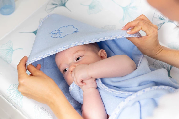 Der praktische und filigrane Bezug mit Kapuze ist ab dem ersten Bad unersetzlich.