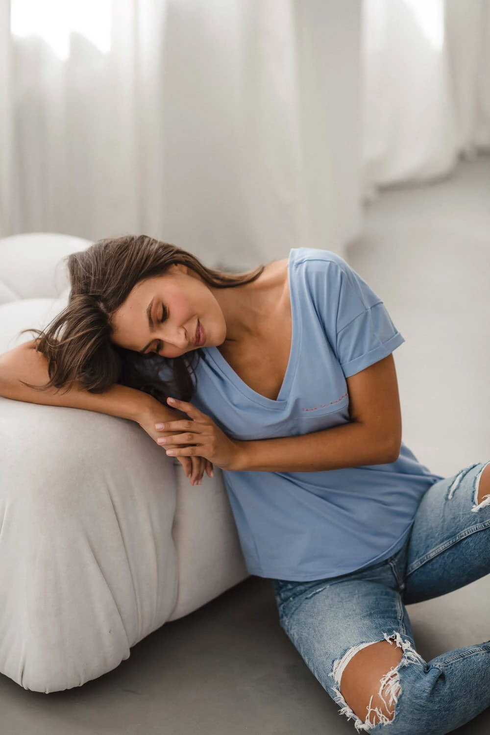 Basic-Blusen sind ein Muss in der Garderobe von Frauen und schwangeren Frauen. Eine blaue Umstandsbluse mit kurzen Ärmeln und V-Ausschnitt ist ein klassischer und stilvoller Look in einem. Stilvolle Umstandsblusen, die Sie mit allem kombinieren können, was Sie in Ihrem Kleiderschrank haben, sind perfekte Umstandsblusen, die den Komfort zukünftiger Mütter gewährleisten. Bei den Umstandsblusen von Formommy handelt es sich nicht nur um bequeme Modelle, sondern auch um einen coolen Look mit eingenähten, versteckten Reißverschlüssen für stillende Frauen, sodass sie auch nach der Schwangerschaft noch dabei sind.