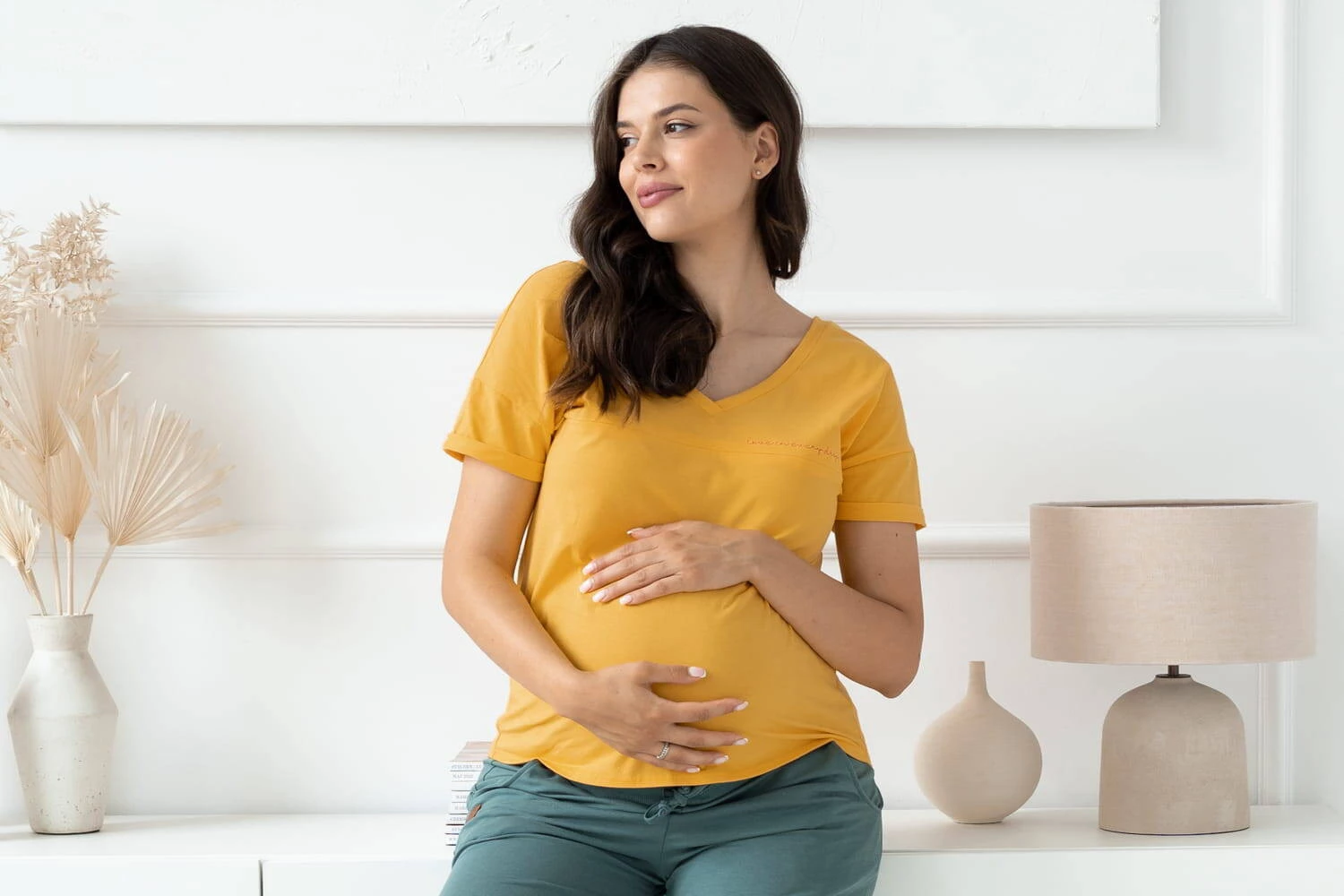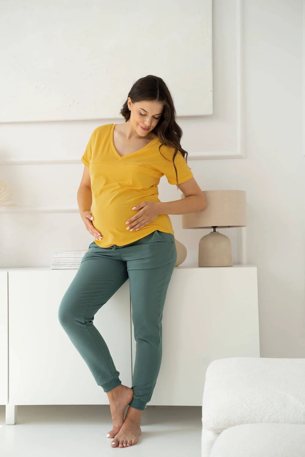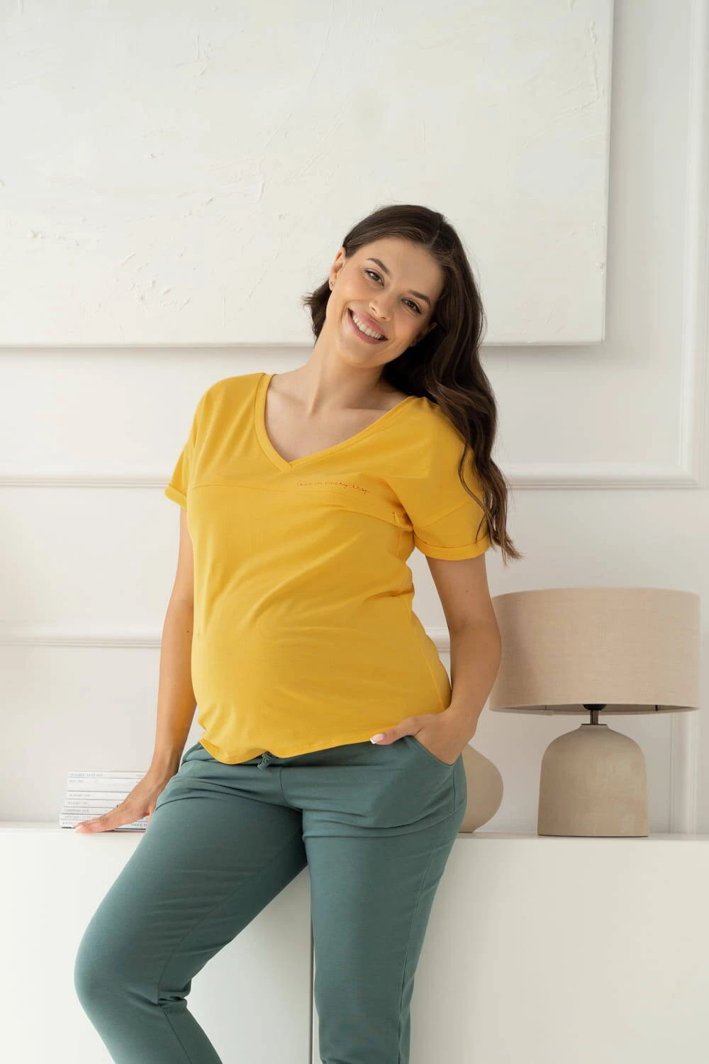 Blusen im Basic-Schnitt sind ein Muss in der Garderobe von Frauen und schwangeren Frauen. Eine senffarbene Umstandsbluse mit kurzen Ärmeln und V-Ausschnitt ist ein klassischer und stilvoller Look in einem. Stilvolle Umstandsblusen, die Sie mit allem kombinieren können, was Sie in Ihrem Kleiderschrank haben, sind perfekte Umstandsblusen, die den Komfort zukünftiger Mütter gewährleisten. Bei den Umstandsblusen von Formommy handelt es sich nicht nur um bequeme Modelle, sondern auch um ein cooles Modell mit eingenähten, versteckten Reißverschlüssen für stillende Frauen, sodass Sie es auch nach der Schwangerschaft tragen können.