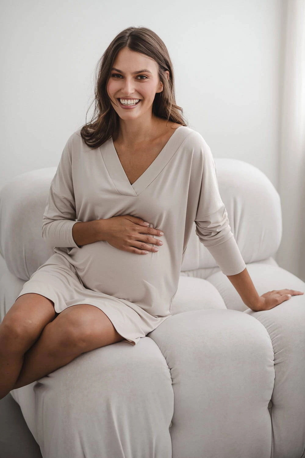 Der Oversize-Schnitt des beigen Shirts wird jede zukünftige Mutter zufrieden stellen, das Umstandsshirt ist eine bequeme Nachtwäsche, die nicht nur Platz für den wachsenden Schwangerschaftsbauch bietet, sondern auch garantiert, dass Sie nach der Geburt großartig aussehen, unabhängig von Ihrer sich verändernden Figur. Das aus Bambusviskose höchster Qualität gefertigte Umstandsshirt Moon hat alle Tests bestanden, um Ihnen maximalen Komfort und Sicherheit zu bieten.