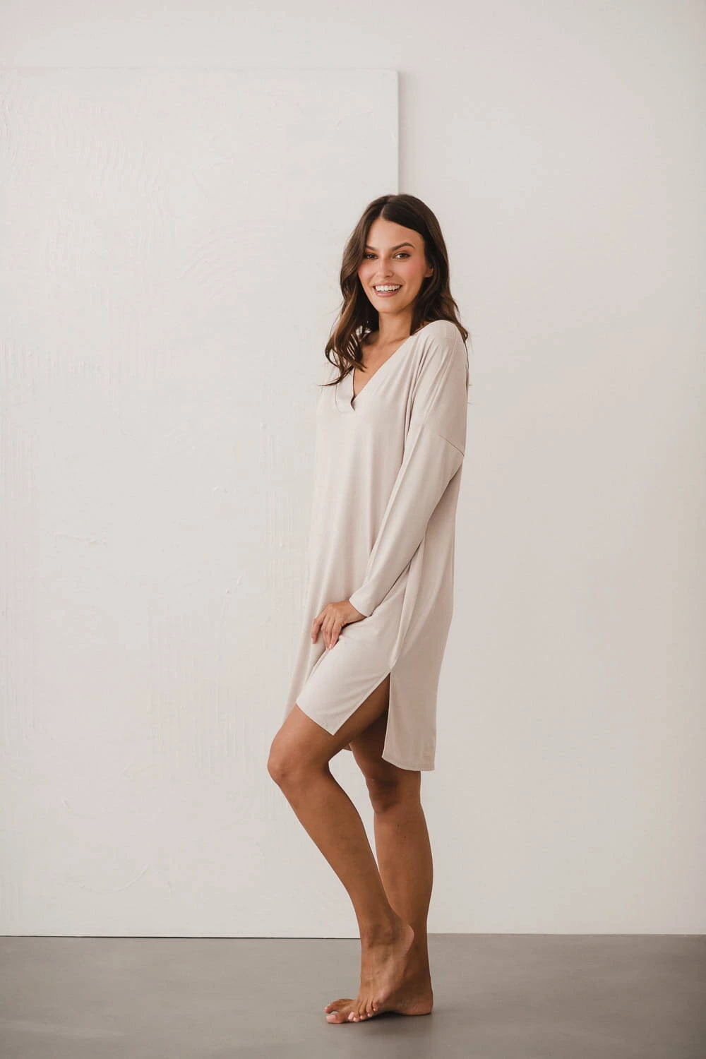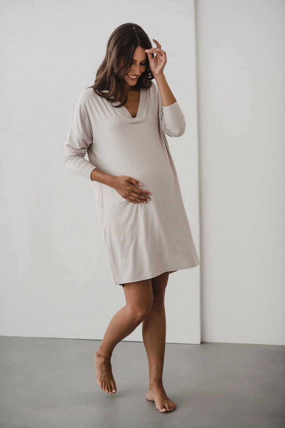 Moon Umstands- und Stillnachthemd aus Bambus mit langen Ärmeln, hellbeige