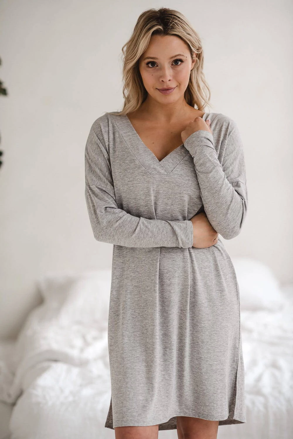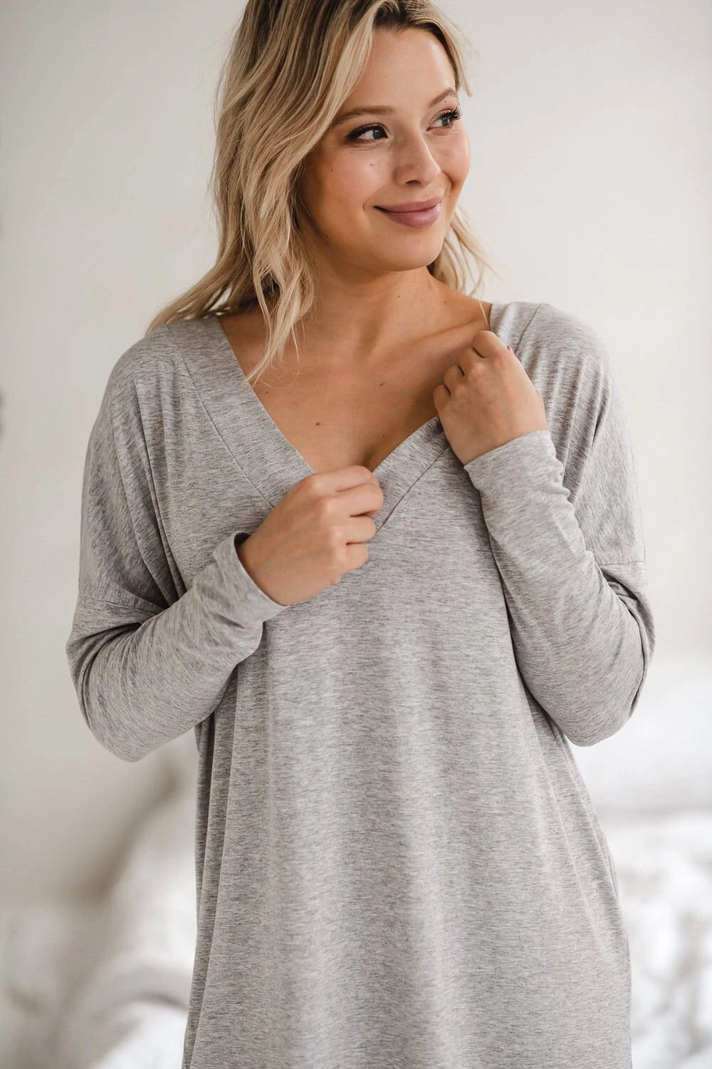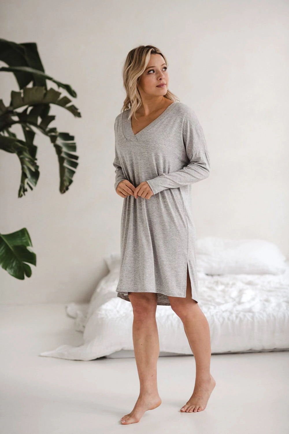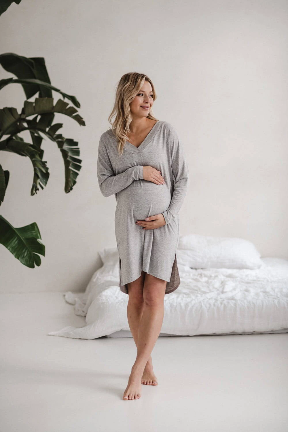 Umstands- und Stillnachthemd aus Bambus mit langen Ärmeln, Mondhellgrau