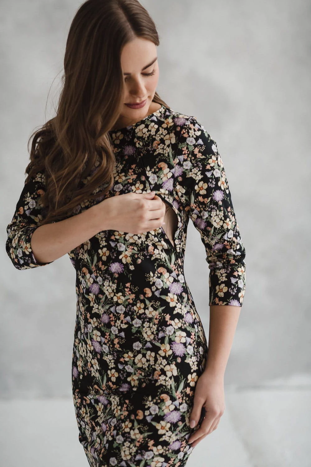 Ein Kleid für stillende Mütter mit modischem Blumendruck verfügt über bequeme, versteckte Reißverschlüsse, die diskretes Stillen ermöglichen, wenn das Baby es braucht. Die Schieber werden von unten bewegt, wodurch Sie die Größe der Futteröffnung anpassen können. Der Schnitt des Bleistift-Stillkleides betont Ihre Figur wunderbar.  Ein Stillkleid der Marke Milk & Love mit Blumen auf schwarzem Hintergrund ist eine schöne Option für jeden Tag und für eine elegante Veranstaltung. Das Stillkleid wurde in Polen aus atmungsaktiven Stoffen höchster Qualität hergestellt, die die strengen Öko-Tex Standard 100- Tests bestanden haben . Das weiche und angenehm anzufassende Material schränkt die Bewegungen nicht ein, wenn Sie das Baby mit einer Hand an die Brust legen müssen. Das perfekte Kleid erleichtert Mutter und Kind das Stillen. Dank speziell ausgewählter Baumwollfasern behält das Material auch nach vielen Wäschen seine Form und das schöne Blumenmuster, ohne dass zusätzliches Bügeln erforderlich ist.