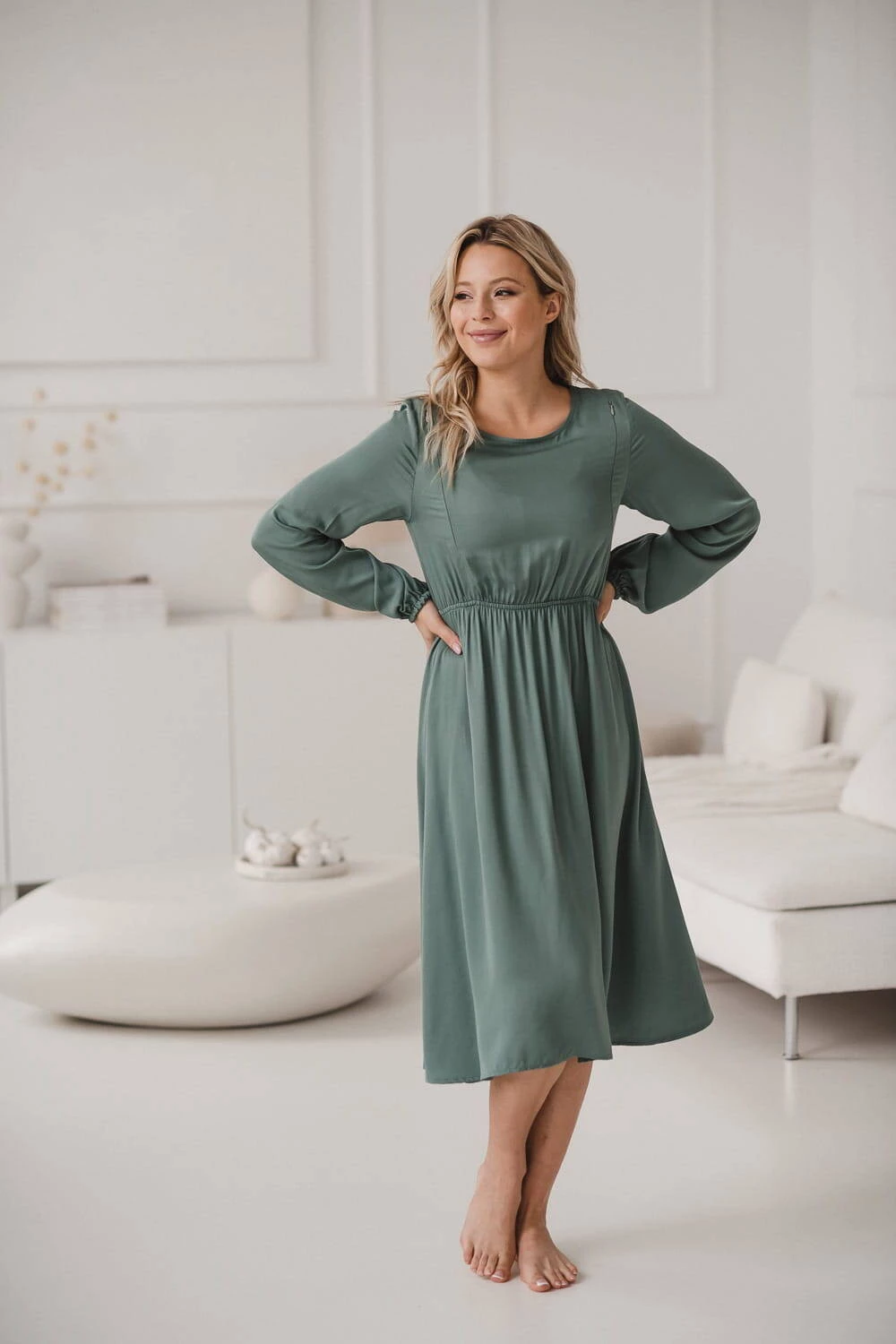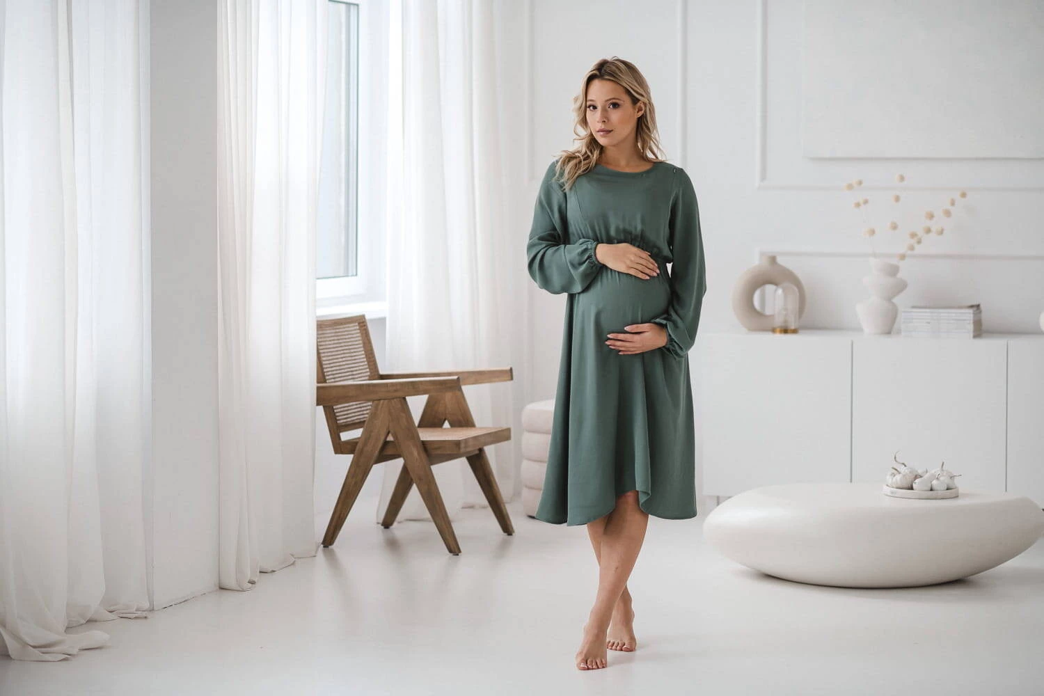 Ein feminines und modisches Umstandskleid in einem wunderschönen satten Grünton, das sowohl während der Schwangerschaft als auch beim Stillen getragen werden kann. Ein originelles Umstandskleid in Midi-Länge mit V-Ausschnitt und einem bequemen Gummiband unter der Brust ist nicht nur während der Schwangerschaft perfekt. Das Umstandskleid, sowohl für den Alltag als auch für besondere Anlässe, ist aus hochwertigem 100 % Viskosestoff gefertigt, der seinen Tragekomfort und seine Langlebigkeit garantiert. Ein grünes Umstandskleid betont Ihren Bauch und schmiegt sich sowohl während der Schwangerschaft als auch nach der Geburt gut an Ihren Körper an. Solide, antiallergische, versteckte Reißverschlüsse ermöglichen es Ihnen, diese nach dem Ende der Stillzeit zu verstecken, sodass das Kleid auch dann wie ein normales Kleid getragen werden kann, wenn Sie nicht schwanger sind. Die Ärmel des Schwangerschaftskleides sind im Puff-Schnitt gehalten, was für Eleganz und mädchenhaften Charme sorgt. Das mit Liebe zum kleinsten Detail hergestellte Produkt sorgt für Komfort für die werdende Mutter und das Baby in ihrem Bauch.