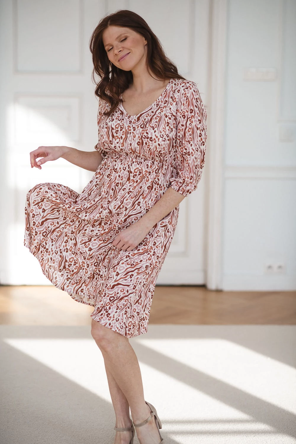 Lovely Dress Midi-Umstands- und Stillkleid, 3/4-Ärmel – braune Muster