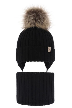Winterset Mädchen: Mütze und Schlauchschal aus 100% extrafeiner Merinowolle in Schwarz Junika